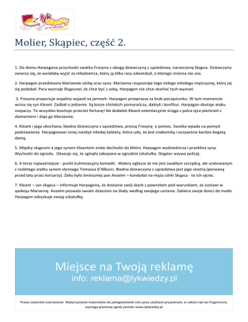Molier, Skąpiec, część 2. 1. Do domu Harpagona przychodzi swatka Frozyna z ubogą dziewczyną z sąsiedztwa, narzeczoną Skąpca. Dziewczyna zwierza się, że wolałaby wyjśd za młodzieoca, który ją kilka razy odwiedzał, a którego imienia nie zna. 2. Harpagon przedstawia Mariannie córkę oraz syna. Marianna rozpoznaje tego miłego młodego mężczyznę, który jej się podobał. Para wyznaje Skąpcowi, że chce byd z sobą. Harpagon nie chce słuchad tych wyznao. 3. Frozyna proponuje wspólny wyjazd na jarmark. Harpagon przeprasza za brak poczęstunku. W tym momencie wcina się syn Kleant. Zadbał o jedzenie. Są kosze chioskich pomaraoczy, daktyli i konfitur. Harpagon dostaje ataku rozpaczy. To wszystko kosztuje przecież fortunę! Na dodatek Kleant ostentacyjnie ściąga z palca ojca pierścieo z diamentem i daje go Mariannie. 4. Kleant i jego ukochana, biedna dziewczyna z sąsiedztwa, proszą Frozynę o pomoc. Swatka wpada na pomysł podstawienia Harpagonowi innej niezbyt młodej kobiety, która uda, że jest znakomitą i oczywiście bardzo bogatą damą. 5. Między skąpcem a jego synem Kleantem znów dochodzi do kłótni. Harpagon wydziedzicza i przeklina syna. Wychodzi do ogrodu. Okazuje się, że zginęła zakopana w ogrodzie szkatułka. Skąpiec wzywa policję. 6. A teraz najważniejsze - punkt kulminacyjny komedii. Walery ogłasza że nie jest zwykłym zarządcą, ale uratowanym z rozbitego statku synem słynnego Tomasza d’Alburci. Biedna dziewczyna z sąsiedztwa jest jego siostrą (porwaną przed laty przez korsarzy). Żeby było śmieszniej pan Anzelm – kandydat na męża córki Skąpca - to ich ojciec. 7. Kleant – syn skąpca – informuje Harpagona, że dostanie swój skarb z powrotem pod warunkiem, że zostawi w spokoju Mariannę. Anzelm pozwala swoim dzieciom na śluby według swojego uznania. Zabiera swoje dzieci do matki. Harpagon odzyskuje swoją szkatułkę. Prawa autorskie zastrzeżone. Wykorzystanie materiałów do jakiegokolwiek celu poza użytkiem prywatnym, w całości lub we fragmencie, wymaga pisemnej zgody portalu www.lykwiedzy.pl