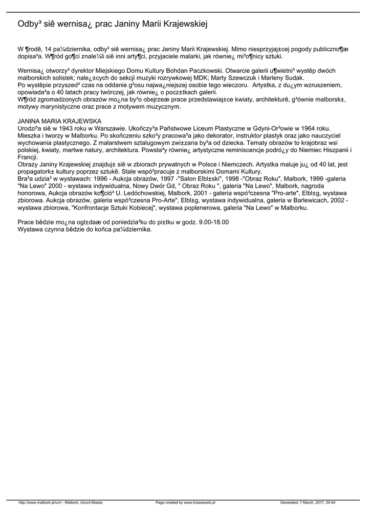 Odby³ siê wernisa¿ prac Janiny Marii Krajewskiej W ¶rodê, 14 pa¼dziernika, odby³ siê wernisa¿ prac Janiny Marii Krajewskiej. Mimo niesprzyjaj±cej pogody publiczno¶æ dopisa³a. W¶ród go¶ci znale¼li siê inni arty¶ci, przyjaciele malarki, jak równie¿ mi³o¶nicy sztuki. Wernisa¿ otworzy³ dyrektor Miejskiego Domu Kultury Bohdan Paczkowski. Otwarcie galerii u¶wietni³ wystêp dwóch malborskich solistek; nale¿±cych do sekcji muzyki rozrywkowej MDK; Marty Szewczuk i Marleny Sudak. Po wystêpie przyszed³ czas na oddanie g³osu najwa¿niejszej osobie tego wieczoru. Artystka, z du¿ym wzruszeniem, opowiada³a o 40 latach pracy twórczej, jak równie¿ o pocz±tkach galerii. W¶ród zgromadzonych obrazów mo¿na by³o obejrzeæ prace przedstawiaj±ce kwiaty, architekturê, g³ównie malborsk±, motywy marynistyczne oraz prace z motywem muzycznym. JANINA MARIA KRAJEWSKA Urodzi³a siê w 1943 roku w Warszawie. Ukoñczy³a Pañstwowe Liceum Plastyczne w Gdyni-Or³owie w 1964 roku. Mieszka i tworzy w Malborku. Po skoñczeniu szko³y pracowa³a jako dekorator, instruktor plastyk oraz jako nauczyciel wychowania plastycznego. Z malarstwem sztalugowym zwi±zana by³a od dziecka. Tematy obrazów to krajobraz wsi polskiej, kwiaty, martwe natury, architektura. Powsta³y równie¿ artystyczne reminiscencje podró¿y do Niemiec Hiszpanii i Francji. Obrazy Janiny Krajewskiej znajduj± siê w zbiorach prywatnych w Polsce i Niemczech. Artystka maluje ju¿ od 40 lat, jest propagatork± kultury poprzez sztukê. Stale wspó³pracuje z malborskimi Domami Kultury. Bra³a udzia³ w wystawach: 1996 - Aukcja obrazów, 1997 -"Salon Elbl±ski", 1998 -"Obraz Roku", Malbork, 1999 -galeria "Na Lewo" 2000 - wystawa indywidualna, Nowy Dwór Gd, " Obraz Roku ", galeria "Na Lewo", Malbork, nagroda honorowa, Aukcja obrazów ko¶ció³ U. Ledóchowskiej, Malbork, 2001 - galeria wspó³czesna "Pro-arte", Elbl±g, wystawa zbiorowa. Aukcja obrazów, galeria wspó³czesna Pro-Arte", Elbl±g, wystawa indywidualna, galeria w Barlewicach, 2002 wystawa zbiorowa, "Konfrontacje Sztuki Kobiecej", wystawa poplenerowa, galeria "Na Lewo" w Malborku. Prace bêdzie mo¿na ogl±daæ od poniedzia³ku do pi±tku w godz. 9.00-18.00 Wystawa czynna bêdzie do koñca pa¼dziernika. http://www.malbork.pl/um/ - Malbork, Urz±d Miasta Page created by www.kraszewski.pl Generated: 7 March, 2017, 00:44