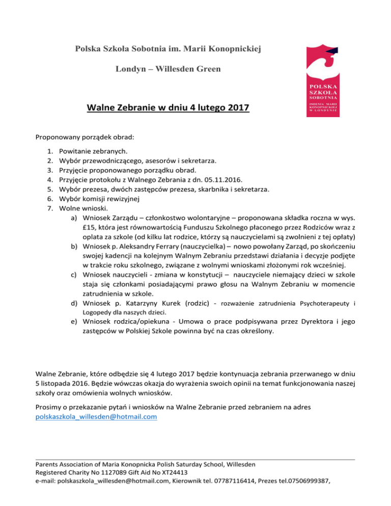 Polska Szkoła Sobotnia im. Marii Konopnickiej Londyn – Willesden Green Walne Zebranie w dniu 4 lutego 2017 Proponowany porządek obrad: 1. 2. 3. 4. 5. 6. 7. Powitanie zebranych. Wybór przewodniczącego, asesorów i sekretarza. Przyjęcie proponowanego porządku obrad. Przyjęcie protokołu z Walnego Zebrania z dn. 05.11.2016. Wybór prezesa, dwóch zastępców prezesa, skarbnika i sekretarza. Wybór komisji rewizyjnej Wolne wnioski. a) Wniosek Zarządu – członkostwo wolontaryjne – proponowana składka roczna w wys. £15, która jest równowartością Funduszu Szkolnego płaconego przez Rodziców wraz z oplata za szkole (od kilku lat rodzice, którzy są nauczycielami są zwolnieni z tej opłaty) b) Wniosek p. Aleksandry Ferrary (nauczycielka) – nowo powołany Zarząd, po skończeniu swojej kadencji na kolejnym Walnym Zebraniu przedstawi działania i decyzje podjęte w trakcie roku szkolnego, związane z wolnymi wnioskami złożonymi rok wcześniej. c) Wniosek nauczycieli - zmiana w konstytucji – nauczyciele niemający dzieci w szkole staja się członkami posiadającymi prawo głosu na Walnym Zebraniu w momencie zatrudnienia w szkole. d) Wniosek p. Katarzyny Kurek (rodzic) - rozważenie zatrudnienia Psychoterapeuty i Logopedy dla naszych dzieci. e) Wniosek rodzica/opiekuna - Umowa o prace podpisywana przez Dyrektora i jego zastępców w Polskiej Szkole powinna być na czas określony. Walne Zebranie, które odbędzie się 4 lutego 2017 będzie kontynuacja zebrania przerwanego w dniu 5 listopada 2016. Będzie wówczas okazja do wyrażenia swoich opinii na temat funkcjonowania naszej szkoły oraz omówienia wolnych wniosków. Prosimy o przekazanie pytań i wniosków na Walne Zebranie przed zebraniem na adres [email protected] Parents Association of Maria Konopnicka Polish Saturday School, Willesden Registered Charity No 1127089 Gift Aid No XT24413 e-mail: [email protected], Kierownik tel. 07787116414, Prezes tel.07506999387, Zarząd Parents Association of Maria Konopnicka Polish Saturday School, Willesden Registered Charity No 1127089 Gift Aid No XT24413 e-mail: [email protected], Kierownik tel. 07787116414, Prezes tel.07506999387,