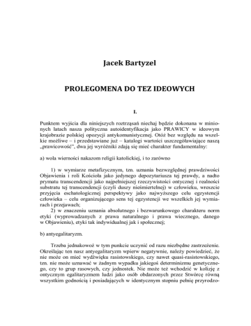 Jacek Bartyzel PROLEGOMENA DO TEZ IDEOWYCH I. Punktem wyjścia dla niniejszych roztrząsań niechaj będzie dokonana w minionych latach nasza polityczna autoidentyfikacja jako PRAWICY w ideowym krajobrazie polskiej opozycji antykomunistycznej. Otóż bez względu na wszelkie możliwe – i przedstawiane już – katalogi wartości uszczegóławiające naszą „prawicowość”, dwa jej wyróżniki zdają się mieć charakter fundamentalny: a) wola wierności nakazom religii katolickiej, i to zarówno 1) w wymiarze metafizycznym, tzn. uznania bezwzględnej prawdziwości Objawienia i roli Kościoła jako jedynego depozytariusza tej prawdy, a nadto prymatu transcendencji jako najpełniejszej rzeczywistości ontycznej i realności substratu tej transcendencji (czyli duszy nieśmiertelnej) w człowieku, wreszcie przyjęcia eschatologicznej perspektywy jako najwyższego celu egzystencji człowieka – celu organizującego sens tej egzystencji we wszelkich jej wymiarach i przejawach; 2) w znaczeniu uznania absolutnego i bezwarunkowego charakteru norm etyki (wyprowadzanych z prawa naturalnego i prawa wiecznego, danego w Objawieniu), etyki tak indywidualnej jak i społecznej; b) antyegalitaryzm. Trzeba jednakowoż w tym punkcie uczynić od razu niezbędne zastrzeżenie. Określając ten nasz antyegalitaryzm wpierw negatywnie, należy powiedzieć, że nie może on mieć wydźwięku rasistowskiego, czy nawet quasi-rasistowskiego, tzn. nie może uznawać w żadnym wypadku jakiegoś determinizmu genetycznego, czy to grup rasowych, czy jednostek. Nie może też wchodzić w kolizję z ontycznym egalitaryzmem ludzi jako osób obdarzonych przez Stwórcę równą wszystkim godnością i posiadających w identycznym stopniu pełnię przyrodzo- 346 JACEK BARTYZEL nych praw osobowych. Nie może wreszcie kwestionować zasady równości przed prawem jako oczywistego postulatu sprawiedliwości. Natomiast sens pozytywny antyegalitaryzmu zasadzać się winien na: 1) uznaniu (a ściślej na wyciągnięciu konsekwencji z tego oczywistego faktu) nierówności moralnej i intelektualnej ludzi oraz: 2) odważnym (bo wobec przemożnego dziś panowania demagogii jest to akt odwagi!) zakwestionowaniu egalitarnego zabobonu w sferze politycznej, czyli mniemania o równouzdolnieniu ludzi w materii publicznej. 3) Winien to być antyegalitaryzm społeczny rozumiany jako respektowanie naturalnej, historycznie ukształtowanej hierarchii i potrzeby istnienia elity (resp. arystokracji). Szczególnie ważnym zadaniem, wręcz „misją” naszej pracy ideowowychowawczej powinno być uzmysławianie, iż to właśnie egalitaryzm moralny jest stanowiskiem wrogim personalizmowi i zasadzie solidarności, jako że postulując „równouprawnienie” obiektów naszej troski etycznej niszczy naturalny i zgodny z rozumem ordo caritatis. Sprzeciwia się też on samej istocie katolicyzmu, ponieważ ograniczając wartość moralną jednostki do tego, co ona sama zrobi(ła), czyni na przykład sąd o „udziale w moralnej zasłudze świętych” bezsensownym połączeniem słów. Za ideą równości moralnej, intelektualnej i politycznej wszystkich ludzi kryje się – świadoma lub nie – „szigalewszczyzna”1, chęć poniżenia tych, którzy – w danej sferze wartości – stoją wyżej, sprowadzenia ich do poziomu stojących niżej. Ten tylko, kto się boi, że przegra, żąda równości jako zasady powszechnej: jej pragnienie jest zawsze – jak powiada Max Scheler2– „spekulacją na zniżkę”! Z antyegalitaryzmu wypływa nieodzownie pogląd, że godna miana dojrzałej cywilizacja musi mieć charakter arystokratyczny, a demokratyzacja polityki i kultury jest objawem dekadencji (co najoczywiściej potwierdza historia). Z przekonania tego wynika kolejne ważne zadanie naszej działalności politycznej i publicystycznej: wskazywanie, że dla ocalenia cywilizacji, w której wzrośliśmy – łacińskiej (a syntetyzującej „ducha Aten” z „duchem Jerozolimy”), niezbędna jest trudna operacja usunięcia z jej „krwiobiegu” toksyny, dlatego właśnie szczególnie groźnej, że jawiącej się dziś powszechnie jako zbawienny lek i objaw „humanizmu” – a mianowicie właśnie idei równości wraz z jej pochodnymi: relatywizmem etycznym, permisywizmem, hedonizmem, pacyfizmem, samowolą jednostki w wyborze obiektów troski moralnej, kosmopolityzmem, wreszcie czymś, co można by nazwać brakiem odwagi i godności w obliczu Bytu – płynącym z zaniku poczucia skażenia natury ludzkiej grzechem i wynikającej stąd nieuchronności cierpienia, czego efektem jest szerzenie się złudzeń o „technicznej” naturze ludzkich problemów egzystencjalnych i możności ich „likwidacji” drogą reform społecznych. PROLEGOMENA DO TEZ IDEOWYCH 347 Naszą odpowiedzią na te choroby współczesnej dekadencji winno być domaganie się odbudowy etosu rycerskiego jako najgodniejszego szacunku ideału wychowawczego, co szczególnie pilne i ważne wobec szerzących się tendencji do przeciwstawiania mu wzorców pacyfistycznych i koncepcji „non-violence” jako jedynie humanistycznej. Szerzej rzecz ujmując, należałoby propagować też całościową reformę, nastawionego dziś wszędzie – bez względu na panujący ustrój – na ujednolicenie, ideału wychowawczego, który winien być znów pojęty jako „hodowla” określonego a zróżnicowanego typu i jako szkolenie specjalistyczne zmierzające do wyselekcjonowania elit. II. Naród Od czasu wydania (w 1979 r.) Deklaracji Ideowej Ruchu Młodej Polski – a nawet jeszcze wcześniej – kategoria narodu pełniła oczywiście kluczową rolę w naszej aksjologii politycznej. Zbyteczne byłoby więc rozwijać takie – przyjęte u zarania naszej drogi – założenia, jak kulturowo-duchowe rozumienie wspólnoty narodowej, odrzucenie determinizmu etnicznego i niechrześcijańskiej etyki bezwzględnego egoizmu narodowego. Nie znaczy to jednak, iżby nie było w naszym myśleniu o narodzie 