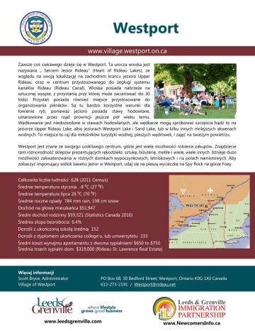 Westport www.village.westport.on.ca Zawsze coś ciekawego dzieje się w Westport. Ta urocza wioska jest nazywana „ Sercem Jezior Rideau” (Heart of Rideau Lakes), ze względu na swoją lokalizację na zachodnim krańcu jeziora Upper Rideau, oraz w centrum przystosowanego do żeglugi systemu kanałów Rideau (Rideau Canal). Wioska posiada nabrzeże na sztucznej wyspie, z przystanią przy której może zacumować do 30 łodzi. Przystań posiada również miejsce przystosowane do organizowania pikników. Są tu bardzo korzystne warunki dla łowienie ryb, ponieważ jezioro posiada stawy hodowlane, ustanowione przez rząd prowincji jeszcze pół wieku temu. Wędkowanie jest niedozwolone w stawach hodowlanych, ale wędkarze mogą spróbować szczęścia bądź to na jeziorze Upper Rideau Lake, albo jeziorach Westport Lake i Sand Lake, lub w kilku innych mniejszych akwenach wodnych. To miejsce to raj dla miłośników turystyki wodnej, pieszych wędrówek, i zajęć na świeżym powietrzu. Westport jest znane ze swojego urokliwego centrum, gdzie jest wiele możliwości robienia zakupów. Znajdziecie tam różnorodność sklepów prezentujących rękodzieło, sztukę, biżuterię, meble i wiele, wiele innych. Istnieje dużo możliwości zakwaterowania w różnych domkach wypoczynkowych, letniskowych i na polach namiotowych. Aby zobaczyć imponujący widok basenu jezior w Westport, udaj się na pieszą wycieczkę na Spy Rock na górze Foey. Całkowita liczba ludności 628 (2011 Census) Średnie temperatura stycznia -8 ⁰C (27 ⁰F) Średnie temperatura lipca 26 ⁰C (70 ⁰F) Średnie roczne opady 784 mm rain, 198 cm snow Dochód na głowę mieszkańca $51,947 Średni dochód rodzinny $59,321 (Statistics Canada 2010) Średnia stopa bezrobocia 6.4% Dorośli z ukończoną szkołą średnią 152 Dorośli z dyplomem ukończenia college’u, lub uniwersytetu 333 Średni koszt wynajmu apartamentu z dwoma sypialniami $650 to $750 Średnia trzech sypialni dom $319,000 (Rideau-St. Lawrence Real Estate) Więcej informacji Scott Bryce, Administrator Village of Westport PO Box 68, 30 Bedford Street; Westport, Ontario K0G 1X0 Canada 613-273-2191 / [email protected] www.leedsgrenville.com www.NewcomersInfo.ca