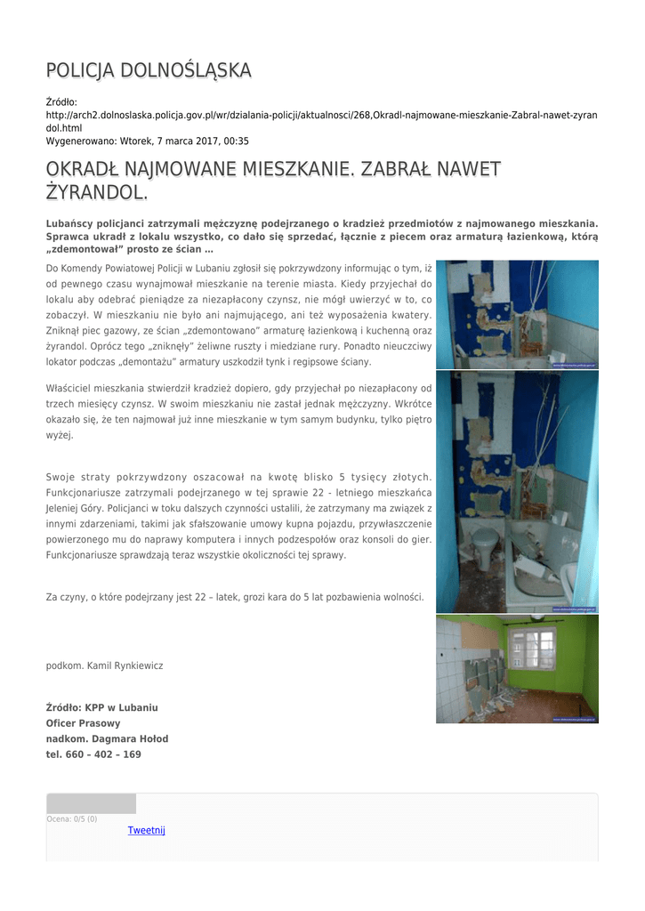 POLICJA DOLNOŚLĄSKA Źródło: http://arch2.dolnoslaska.policja.gov.pl/wr/dzialania-policji/aktualnosci/268,Okradl-najmowane-mieszkanie-Zabral-nawet-zyran dol.html Wygenerowano: Wtorek, 7 marca 2017, 00:35 OKRADŁ NAJMOWANE MIESZKANIE. ZABRAŁ NAWET ŻYRANDOL. Lubańscy policjanci zatrzymali mężczyznę podejrzanego o kradzież przedmiotów z najmowanego mieszkania. Sprawca ukradł z lokalu wszystko, co dało się sprzedać, łącznie z piecem oraz armaturą łazienkową, którą „zdemontował” prosto ze ścian … Do Komendy Powiatowej Policji w Lubaniu zgłosił się pokrzywdzony informując o tym, iż od pewnego czasu wynajmował mieszkanie na terenie miasta. Kiedy przyjechał do lokalu aby odebrać pieniądze za niezapłacony czynsz, nie mógł uwierzyć w to, co zobaczył. W mieszkaniu nie było ani najmującego, ani też wyposażenia kwatery. Zniknął piec gazowy, ze ścian „zdemontowano” armaturę łazienkową i kuchenną oraz żyrandol. Oprócz tego „zniknęły” żeliwne ruszty i miedziane rury. Ponadto nieuczciwy lokator podczas „demontażu” armatury uszkodził tynk i regipsowe ściany. Właściciel mieszkania stwierdził kradzież dopiero, gdy przyjechał po niezapłacony od trzech miesięcy czynsz. W swoim mieszkaniu nie zastał jednak mężczyzny. Wkrótce okazało się, że ten najmował już inne mieszkanie w tym samym budynku, tylko piętro wyżej. Swoje straty pokrzywdzony oszacował na kwotę blisko 5 tysięcy złotych. Funkcjonariusze zatrzymali podejrzanego w tej sprawie 22 - letniego mieszkańca Jeleniej Góry. Policjanci w toku dalszych czynności ustalili, że zatrzymany ma związek z innymi zdarzeniami, takimi jak sfałszowanie umowy kupna pojazdu, przywłaszczenie powierzonego mu do naprawy komputera i innych podzespołów oraz konsoli do gier. Funkcjonariusze sprawdzają teraz wszystkie okoliczności tej sprawy. Za czyny, o które podejrzany jest 22 – latek, grozi kara do 5 lat pozbawienia wolności. podkom. Kamil Rynkiewicz Źródło: KPP w Lubaniu Oficer Prasowy nadkom. Dagmara Hołod tel. 660 – 402 – 169 Ocena: 0/5 (0) Tweetnij
