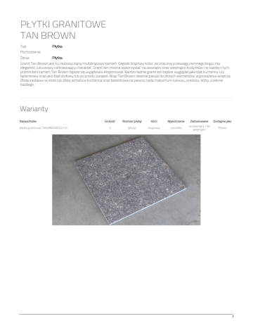 PŁYTKI GRANITOWE TAN BROWN Typ Płytka Pochodzenie Opcja Płytka Granit Tan Brown jest to nadzwyczajny multibrązowy kamień. Głęboki brązowy kolor, ze znaczną przewagą ciemnego brązu ma elegancki, luksusowy i olśniewający charakter. Granit ten można wykorzystać na zewnątrz oraz wewnątrz budynków i w każdej z tych przestrzeni kamień Tan Brown będzie się wyjątkowo eksponował. Bardzo ładnie granit ten będzie wyglądał jako blat kuchenny czy łazienkowy oraz jako blat stołowy lub po prostu parapet. Brąz Tan Brown idealnie pasuje do złotych elementów wyposażenia wnętrza. Złota zastawa na stole lub złota armatura kuchenna oraz łazienkowa na pewno nada maksimum luksusu, prestiżu, który urzeknie każdego. Warianty Nazwa/Index płytka granitowa TAN BROWN C07 01 Grubość 2 Rozmiar (płyty) (płyty) Kolor brązowy Wykończenie Zastosowanie Dostępne jako szczotka na zewnątrz / do wewnątrz Płytka 1 Nazwa/Index płytka granitowa TAN BROWN F23-01 Grubość 1 Rozmiar (płyty) (płyty) Kolor brązowy Wykończenie Zastosowanie Dostępne jako poler na zewnątrz / do wewnątrz Płytka 2