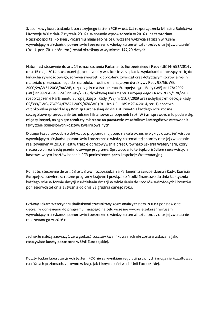 Szacunkowy koszt badania laboratoryjnego testem PCR w ust. 8.1 rozporządzenia Ministra Rolnictwa i Rozwoju Wsi z dnia 7 stycznia 2016 r. w sprawie wprowadzenia w 2016 r. na terytorium Rzeczypospolitej Polskiej „Programu mającego na celu wczesne wykrycie zakażeń wirusem wywołującym afrykański pomór świń i poszerzenie wiedzy na temat tej choroby oraz jej zwalczanie” (Dz. U. poz. 70, z późn. zm.) został określony w wysokości 147,79 złotych. Natomiast stosownie do art. 14 rozporządzenia Parlamentu Europejskiego i Rady (UE) Nr 652/2014 z dnia 15 maja 2014 r. ustanawiającym przepisy w zakresie zarządzania wydatkami odnoszącymi się do łańcucha żywnościowego, zdrowia zwierząt i dobrostanu zwierząt oraz dotyczącymi zdrowia roślin i materiału przeznaczonego do reprodukcji roślin, zmieniającym dyrektywy Rady 98/56/WE, 2000/29/WE i 2008/90/WE, rozporządzenia Parlamentu Europejskiego i Rady (WE) nr 178/2002, (WE) nr 882/2004 i (WE) nr 396/2005, dyrektywę Parlamentu Europejskiego i Rady 2009/128/WE i rozporządzenie Parlamentu Europejskiego i Rady (WE) nr 1107/2009 oraz uchylającym decyzje Rady 66/399/EWG, 76/894/EWG i 2009/470/WE (Dz. Urz. UE L 189 z 27.6.2014, str. 1) państwa członkowskie przedkładają Komisji Europejskiej do dnia 30 kwietnia każdego roku roczne szczegółowe sprawozdanie techniczne i finansowe za poprzedni rok. W tym sprawozdaniu podaje się, między innymi, osiągnięte rezultaty mierzone na podstawie wskaźników i szczegółowe zestawienie faktycznie poniesionych kosztów kwalifikowalnych. Dlatego też sprawozdanie dotyczące programu mającego na celu wczesne wykrycie zakażeń wirusem wywołującym afrykański pomór świń i poszerzenie wiedzy na temat tej choroby oraz jej zwalczanie realizowanym w 2016 r. jest w trakcie opracowywania przez Głównego Lekarza Weterynarii, który nadzorował realizację przedmiotowego programu. Sprawozdanie to będzie źródłem rzeczywistych kosztów, w tym kosztów badania PCR poniesionych przez Inspekcję Weterynaryjną. Ponadto, stosownie do art. 13 ust. 3 ww. rozporządzenia Parlamentu Europejskiego i Rady, Komisja Europejska zatwierdza roczne programy krajowe i powiązane środki finansowe do dnia 31 stycznia każdego roku w formie decyzji o udzieleniu dotacji w odniesieniu do środków wdrożonych i kosztów poniesionych od dnia 1 stycznia do dnia 31 grudnia danego roku. Główny Lekarz Weterynarii skalkulował szacunkowy koszt analizy testem PCR na podstawie tej decyzji w odniesieniu do programu mającego na celu wczesne wykrycie zakażeń wirusem wywołującym afrykański pomór świń i poszerzenie wiedzy na temat tej choroby oraz jej zwalczanie realizowanego w 2016 r. Jednakże należy zauważyć, że wysokość kosztów kwalifikowalnych nie została wskazana jako rzeczywiste koszty ponoszone w Unii Europejskiej. Koszty badań laboratoryjnych testem PCR nie są wynikiem regulacji prawnych i mogą się kształtować na różnych poziomach, zarówno w kraju jak i innych państwach Unii Europejskiej. Należy również zauważyć, że stosownie do art. 57 ust. 6 pkt 1 ustawy z dnia 11 marca 2004 r. o ochronie zdrowia zwierząt oraz zwalczaniu chorób zakaźnych zwierząt (Dz. U. z 2014 r. poz. 1539, z późn. zm.) Główny Lekarz Weterynarii uzgodnił program mający na celu wczesne wykrycie zakażeń wirusem wywołującym afrykański pomór świń i poszerzenie wiedzy na temat tej choroby oraz jej zwalczanie przewidziany do realizacji w 2017 r. pod względem finansowym z ministrem właściwym do spraw finansów publicznych. W związku z powyższym w celu uzyskania informacji dotyczących wskazania konkretnych czynników mających wpływ na obniżenie szacunkowych kosztów badania testem PCR w 2017 r. i szczegółowego uzasadnienia tej kalkulacji, proponuję zwrócić się do Głównego Lekarza Weterynarii.