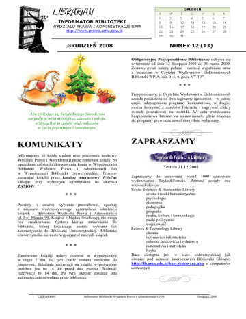 LIBRARIAN INFORMATOR BIBLIOTEKI WYDZIAŁU PRAWA I ADMINISTRACJI UAM http://www.prawo.amu.edu.pl GRUDZIEŃ 2008 NUMER 12 (13) Obligatoryjne Przysposobienie Biblioteczne odbywa się w terminie od dnia 12 listopada 2008 do 31 marca 2009. Zestawy pytań należy pobrać i zwrócić wypełnione wraz z indeksem w Czytelni Wydawnictw Elektronicznych Biblioteki WPiA, sala 015, w godz. 900-1900. *** Aby zbliŜające się Święta BoŜego Narodzenia upłynęły w miłej atmosferze, zdrowiu i pokoju, a Nowy Rok przyniósł wiele sukcesów w Ŝyciu prywatnym i zawodowym. ZAPRASZAMY KOMUNIKATY Informujemy, iż każdy student oraz pracownik naukowy Wydziału Prawa i Administracji może zamawiać książki po uprzednim założeniu/aktywowaniu konta w Wypożyczalni Biblioteki Wydziału Prawa i Administracji lub w Wypożyczalni Biblioteki Uniwersyteckiej. Prosimy zamawiać książki przez katalog internetowy WebPac klikając przy wybranym egzemplarzu na okienko ZAMÓW. *** Prosimy o uważne wybranie prawidłowej, zgodnej z miejscem przechowywanego egzemplarza lokalizacji książek - Biblioteka Wydziału Prawa i Administracji ul. Św. Marcin 90. Książki z błędną lokalizacją nie mogą być zrealizowane. System kieruje zamówienie do biblioteki, której lokalizacja została wybrana lub automatycznie do Biblioteki Uniwersyteckiej. Biblioteka Uniwersytecka nie może wypożyczyć naszych książek *** Zamówione książki należy odebrać w wypożyczalni w ciągu 7 dni. Po tym czasie zostaną zwrócone do magazynu. Składanie rezerwacji na książki wypożyczone możliwe jest na 14 dni przed datą zwrotu. Ważność rezerwacji to 14 dni. Po tym okresie zostanie ona automatycznie odwołana przez bibliotekę. LIBRARIAN Przypominamy, iż Czytelnia Wydawnictw Elektronicznych została podzielona na dwa segmenty uprawnień – w jednej części udostępniamy programy komputerowe, w drugiej można korzystać z zasobów Internetu i nagrywać efekty swoich poszukiwań na nośniki. W celu zwiększenia bezpieczeństwa Internet na stanowiskach, gdzie znajdują się programy prawnicze został domyślnie wyłączony. Test do 31.12.2008 Zapraszamy do testowania ponad 1000 czasopism wydawnictwa Taylor&Francis. Zebrane zostały one w dwie kolekcje: Social Sciences & Humanities Library sztuka i nauki humanistyczne psychologia ekonomia pedagogika geografia media, kultura i komunikacja nauki polityczne wojskowość Science & Technology Library chemia inżynieria i informatyka ochrona środowiska i rolnictwo matematyka i statystyka fizyka Baza dostępna jest w sieci uniwersyteckiej jak również pod adresem internetowym Biblioteki Głównej http://lib.amu.edu.pl/bazy/testowane.php z komputerów domowych Informator Biblioteki Wydziału Prawa i Administracji UAM Grudzień 2008 RA 109526, RA 109527, RA 109528 NOWOŚCI Przedstawiamy listę nowości nabytych przez Bibliotekę Wydziału Prawa i Administracji UAM w listopadzie. Pełna lista dostępna jest na stronie internetowej Biblioteki, w Czytelni Książek oraz w gablocie BWPiA. KSIĄŻKI Ustawa o przeciwdziałaniu nieuczciwym praktykom rynkowym : komentarz / Małgorzata Sieradzka. Warszawa : 2008 - Stan prawny na 30 września 2008 r RA 109529 When worlds collide : intellectual property high technology and the law / ed. by Maciej Barczewski, Michał Miłosz, Richard Warner. Warszawa : 2008 RA 109530, RA 109531, RA 109532 Odpowiedzialność za nieprzestrzeganie procedury tworzenia i wykonywania budżetu jednostki samorządu terytorialnego / Joanna M. Salachna. Warszawa : 2008 Stan prawny na 30 czerwca 2008 r RA 109533, RA 109534 RA 109480, RA 109481, RA 109482, RA 109483 Podstawy prawa karnego międzynarodowego / Michał Królikowski, Paweł Wiliński, Jacek Izydorczyk. Warszawa : 2008 RA 109486, RA 109487, RA 109488 Prawo autorskie i prawa pokrewne / wprow. Janusz Barta, Ryszard Markiewicz. Warszawa : 2008 - 4. wyd., stan prawny na 26 września 2008 r Abolicja podatkowa : komentarz / Adam Bartosiewicz, Ryszard Kubacki. Warszawa : 2008 - Stan prawny na 1 października 2008 r RA 109537, RA 109538, RA 109539 Wspólnotowe i polskie publiczne prawo gospodarcze. T. 2, Prawo bankowe, obrót instrumentami finansowymi, fundusze inwestycyjne, ochrona konkurencji / Marian Zdyb. Warszawa : 2008 - Stan prawny na 1 października 2008 r RA 109540 RA 109489, RA 109490, RA 109491, RA 109492, RA 109493, RA 109494, RA 109495, RA 109496 Sztuka twórczego myślenia : źródła innowacji i świetnych pomysłów / John Adair ; przeł. Dorota Wasik. Kraków : 2008 Kodeks karny : część szczególna : komentarz. T. 3, Komentarz do art. 278-363 K. K. / Andrzej Zoll red. ; [aut.] Agnieszka Barczak-Oplustil [et al.]. Warszawa : 2008 Wyd.3, stan prawny na 31 lipca 2008 r RA 109541, RA 109542 RA 109497, RA 109498, RA 109499 RA 109547 Czynności notarialne w prawie spółek / Rafał Wrzecionek. Warszawa : 2008 - Stan prawny na 2 listopada 2008 r Polityka społeczna jako zaspokajanie istotnych potrzeb społecznych / Marek Bednarz. Bydgoszcz : 2008 RA 109500, RA 109501, RA 109502 RA 109548 Strona jako podmiot oświadczeń procesowych w postępowaniu administracyjnym / Zbigniew R. Kmiecik. Warszawa : 2008 Model systemu społecznego a problemy zarządzania / Tadeusz Chudoba. Warszawa : 2008 RA 109503, RA 109504, RA 109505, RA 109506 Historia finansów współczesnego świata : od 1900 roku / Wojciech Morawski. Warszawa : 2008 Aspekt prawotwórczy sądownictwa administracyjnego / Andrzej Gomułowicz. Warszawa : cop. 2008 RA 109507, RA 109508, RA 109509 Prawo pomocy społecznej / Iwona Sierpowska. Warszawa : 2008 - 3. wyd., stan prawny na 1 września 2008 r Czas a trwanie idei politycznych i prawnych / red. Krystyna Chojnicka, Anna Citkowska-Kimla, Wiesław KozubCiembroniewicz. Warszawa : 2008 RA 109549 RA 109550 Innowacje w firmie : praktyczne metody wprowadzania zmian / Jan D. Antoszkiewicz. Warszawa : 2008 RA 109551 Doradca podatkowy : jak z sukcesem prowadzić kancelarie, biuro rachunkowe / Mariusz Gotowicz. 