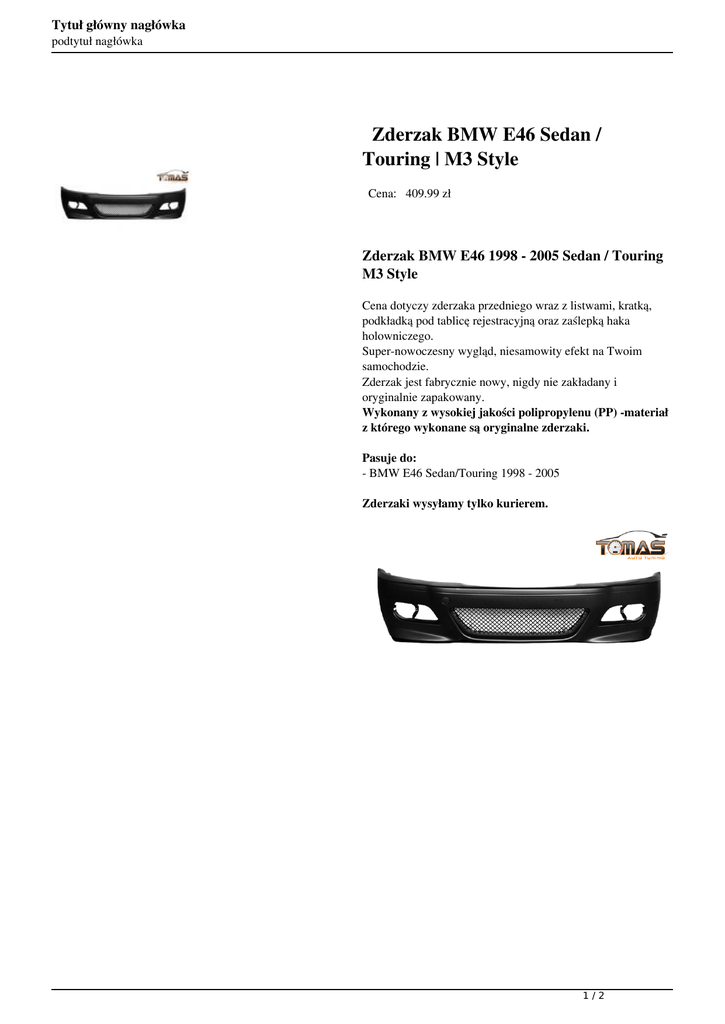 Tytuł główny nagłówka podtytuł nagłówka Zderzak BMW E46 Sedan / Touring | M3 Style Cena: 409.99 zł Zderzak BMW E46 1998 - 2005 Sedan / Touring M3 Style Cena dotyczy zderzaka przedniego wraz z listwami, kratką, podkładką pod tablicę rejestracyjną oraz zaślepką haka holowniczego. Super-nowoczesny wygląd, niesamowity efekt na Twoim samochodzie. Zderzak jest fabrycznie nowy, nigdy nie zakładany i oryginalnie zapakowany. Wykonany z wysokiej jakości polipropylenu (PP) -materiał z którego wykonane są oryginalne zderzaki. Pasuje do: - BMW E46 Sedan/Touring 1998 - 2005 Zderzaki wysyłamy tylko kurierem. 1/2 Tytuł główny nagłówka podtytuł nagłówka 2/2 Powered by TCPDF (www.tcpdf.org)