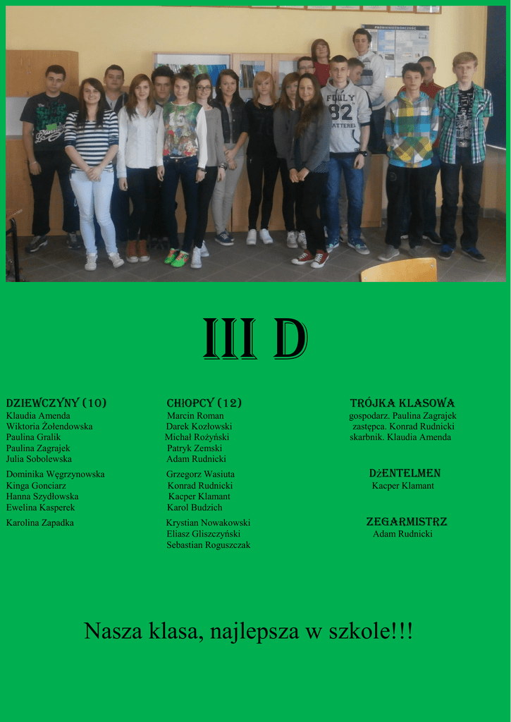 III D Dziewczyny (10) chłopcy (12) Trójka Klasowa Klaudia Amenda Wiktoria Żołendowska Paulina Gralik Paulina Zagrajek Julia Sobolewska Marcin Roman Darek Kozłowski Michał Rożyński Patryk Zemski Adam Rudnicki gospodarz. Paulina Zagrajek zastępca. Konrad Rudnicki skarbnik. Klaudia Amenda Dominika Węgrzynowska Kinga Gonciarz Hanna Szydłowska Ewelina Kasperek Grzegorz Wasiuta Konrad Rudnicki Kacper Klamant Karol Budzich Dżentelmen Karolina Zapadka Krystian Nowakowski Eliasz Gliszczyński Sebastian Roguszczak Kacper Klamant Zegarmistrz Adam Rudnicki Nasza klasa, najlepsza w szkole!!!