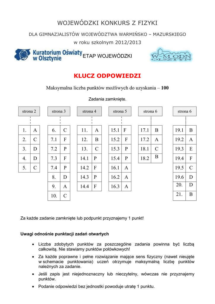 WOJEWÓDZKI KONKURS Z FIZYKI DLA GIMNAZJALISTÓW WOJEWÓDZTWA WARMIŃSKO – MAZURSKIEGO w roku szkolnym 2012/2013 ETAP WOJEWÓDZKI KLUCZ ODPOWIEDZI Maksymalna liczba punktów możliwych do uzyskania – 100 Zadania zamknięte. strona 2 strona 3 strona 4 strona 5 strona 6 strona 6 1. A 6. C 11. A 15.1 F 17.1 B 19.1 B 2. C 7.1 F 12. B 15.2 F 17.2 A 19.2 A 3. D 7.2 P 13. C 15.3 P 18.1 C 19.3 E 4. D 7.3 F 14.1 P 15.4 P 18.2 B 19.4 F 5. C 7.4 P 14.2 F 16.1 A 19.5 C 8. D 14.3 P 16.2 A 19.6 D 9. A 14.4 F 16.3 A 20. D 10. C 21. B Za każde zadanie zamknięte lub podpunkt przyznajemy 1 punkt! Uwagi odnośnie punktacji zadań otwartych Liczba zdobytych punktów za poszczególne zadania powinna być liczbą całkowitą. Nie stawiamy punktów połówkowych! Za każde poprawne i pełne rozwiązanie mające sens fizyczny (nawet nieujęte w schemacie punktowania) uczeń otrzymuje maksymalną liczbę punktów należnych za zadanie. Jeśli zapis jest niejednoznaczny lub nieczytelny, wówczas nie przyznajemy punktów. Podanie odpowiedzi bez jednostki powoduje utratę 1 punktu. Nr zadania 22 23 24 Punktowane czynności Za poprawne zaznaczenie kierunku prądu elektrycznego 1 22.2 Za poprawne zaznaczenie biegunów magnetycznych 1 22.3 B 1 Wyznaczenie y 1 Wyznaczenie p 1 23.2 B 1 24.1 A 1 Wyskalowanie i oznaczenie osi 1 Naniesienie punktów pomiarowych i połączenie ich prostą 1 24.3 Obliczenie oporu wraz jednostką R=50 Ω 1 24.4 Obliczenie pracy wraz jednostką W= 2 160 J Obliczenie ilości energii pobieranej przez komputer i lodówkę w czasie 10 minut Obliczenie mocy komputera P=100 W Obliczenie ilości energii pobranej przez komputer w ciągu 31 dni E= 74,4 kWh Obliczenie kosztu energii zużytej przez komputer 44,60 zł. 2 Zauważenie związku pomiędzy Ep, a pracą w wodzie 2 Wyznaczenie wysokości h = w hw/d 1 h=1m 1 27.1 Dorysowanie promienia odbitego 1 27.2 Poprowadzenie promienia załamanego 1 27.3 27.4 Kąt odbicia wynosi 60o 1 Kąt między po i pz wynosi 75o 1 27.5 A 1 27.6 A 1 Obliczenie mocy grzałki P = 881,7 W 2 Obliczenie pracy wykonanej przez grzałkę W = 2 116 kJ 2 Obliczenie ciepła przekazanego wodzie Q=0,80 W=1 692,8 kJ Obliczenie ciepła pobranego przez wodę podczas ogrzewania 1 Obliczenie masy pary mp = 0,54 kg 2 23.1 24.2 26 28 pkt. 22.1 25 27 Razem punktów Propozycja punktacji zadań otwartych 3 3 6 2 2 7 2 1 1 4 6 8 Obliczenie objętości kry V = 0,875m3 1 Obliczenie siły wyporu Fw= 8 750 N 1 Wykorzystanie związku Fg = Fw 1 Obliczenie masy człowieka m = 70 kg 1 Zaznaczenie na schemacie woltomierza 1 Zaznaczenie na schemacie amperomierza 1 30.2 Obliczenie całkowitego oporu obwodu R= 83,3 2 30.3 Obliczenie natężenie prądu płynącego w obwodzie I= 54 mA 1 30.4 B 29 30.1 30 31 32 33 34 Wyznaczenie wysokości budynku 1 2 Podanie odpowiedzi – drabina sięga dachu 1 Obliczenie masę kabiny windy m = 600 kg 1 Obliczenie pracy wykonanej przez silnik windy W = 48 kJ 1 Obliczenie mocy silnika windy P = 10 kW 2 Zapisanie mocy w postaci wykładniczej 1 Zastosowanie zasady zachowania energii 1 Wyznaczenie prędkości v 1 Wyznaczenie v= 3m/s 1 Podanie amplitudy A= 0,2 m 1 Podanie okresu T= 2 s 1 Obliczenie częstotliwość drgań i podanie w hercach f= ½ Hz 1 4 6 3 5 3 3