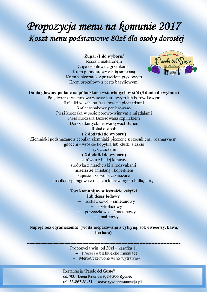 Propozycja menu na komunie 2017 Koszt menu podstawowe 80zł dla osoby dorosłej Zupa: /1 do wyboru/ Rosół z makaronem Zupa cebulowa z grzankami Krem pomidorowy z bitą śmietaną Krem z pieczarek z groszkiem ptysiowym Krem brokułowy z pesto bazyliowym Dania główne: podane na półmiskach wstawionych w stół (3 dania do wyboru) Polędwiczki wieprzowe w sosie kurkowym lub borowikowym Roladki ze schabu faszerowane pieczarkami Kotlet schabowy panierowany Pierś kurczaka w sosie porowo-winnym z migdałami Pierś kurczaka faszerowana szpinakiem Dorsz atlantycki na warzywach Julien Roladki z soli ( 2 dodatki do wyboru) Ziemniaki podsmażane z cebulką ziemniaki pieczone z czosnkiem i rozmarynem gnocchi - włoskie kopytka lub kluski śląskie ryż z ziołami ( 2 dodatki do wyboru) surówka z białej kapusty surówka z marchewki z rodzynkami mizeria ze śmietaną i koperkiem kapusta czerwona zasmażana fasolka szparagowa z masłem klarowanym i bułką tartą Tort komunijny w kształcie książki lub deser lodowy – truskawkowo – śmietanowy – czekoladowy – porzeczkowo - śmietanowy – malinowy Napoje bez ograniczenia: (woda niegazowana z cytryną, sok owocowy, kawa, herbata) -----------------------------------------------------------------------------------------------------Propozycja win: od 30zł – karafka 1l – Prosecco białe/lekko musujące – Merlot/czerwone wino wytrawne/ Restauracja "Parole del Gusto" oś. 700- Lecia Pawilon 9, 34-300 Żywiec tel: 33-863-31-51 www.zywiecrestauracja.pl Dodatkowe propozycje : Zestaw zimnych przekąsek I - 40 zł / osoba – sałatka caprese – – pomidory z serem mozarella – - bruscetta z pomidorami z czosnkiem – - bruscetta ze szpinakiem – - antipasto Franco– warzywa grillowane, włoskie wędliny i feta w ziołach – - karkówka pieczona lub schab nadziewany lub rolada drobiowa – -galantyna w galarecie – - sałatka grecka z serem feta – - pieczywo mieszane – - masło smakowe Zestaw zimnych przekąsek II - 50 zł / osoba – sałatka caprese – pomidory z serem mozarella – bruscetta z pomidorami z czosnkiem – sałatka jarzynowa – antipasto Franco – warzywa grillowane, włoskie wędliny i feta w ziołach – tatar z łososia norweskiego lub tatar a buraka z kawiorem – schab po warszawsku z nadzieniem chrzanowym lub roladki z szynki nadziewane -chrzanem – sałatka Szefa z grillowanym kurczakiem z sosem pieprzowo- miodowym – pieczywo mieszane – masło smakowe Zestaw zimnych przekąsek III – 30zł/osoba – tradycyjna sałatka jarzynowa – tymbalijki drobiowe lub wieprzowe – kompozycja wędlin – pieczywo mieszane – masło smakowe Restauracja "Parole del Gusto" oś. 700- Lecia Pawilon 9, 34-300 Żywiec tel: 33-863-31-51 www.zywiecrestauracja.pl kolacje: cena 30zł/porcja – filet z kurczaka grillowany podany na zielonym makaronie tagiatelle z sosem z zielonego pieprzu z dodatkiem pomidorków, czerwonej cebuli i rukoli – filet z dorsza w sosie kaparowym podany z ziemniaczkami z wody i bukiet warzyw – pierś z kurczaka duszona w sosie kurkowym podana z ryżem – aromatyczny barszczyk z buraków kiszonych podany z pasztecikiem – tagiatelle z kaczką w sosie śmietanowo- wiśniowym z dodatkiem rozmarynu przekąski – przystawki cena 23zł/porcja – szynka parmeńska z melonem – bakłażan zapieczony z pomidorami i serem mozzarella z tipsem z boczku – naleśnik z serem ricotta i szpinakiem z sosem carbonara – fileciki z łososia marynowane w pomarańczach z sosem cytrynowym – płatki pieczonej cielęciny z sosem tuńczykowo-majonezowym z kaparami – tatar z łososia norweskiego z jajkiem przepiórczym i tostem dodatkowo proponujemy – klosze z ciastem – 30zł/trzy rodzaje ciast/ – ciasteczka kruche- 25zł /0,60kg/ – patery z owocami krojonymi- 30zł – fontanna czekoladowa mała z bufetem owocowym – 200zł – wódka 0,5l – 30zł/butelka – napoje gazowane typu pepsi pet 0,5l - 4zł Restauracja "Parole del Gusto" oś. 700- Lecia Pawilon 9, 34-300 Żywiec tel: 33-863-31-51 www.zywiecrestauracja.pl