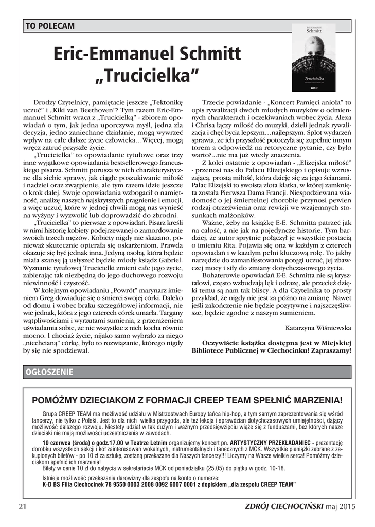 TO POLECAM Eric-Emmanuel Schmitt „Trucicielka” Drodzy Czytelnicy, pami´tacie jeszcze „Tektonik´ uczuç” i „Kiki van Beethoven”? Tym razem Eric-Emmanuel Schmitt wraca z „Trucicielkà” - zbiorem opowiadaƒ o tym, jak jedna uporczywa myÊl, jedna z∏a decyzja, jedno zaniechane dzia∏anie, mogà wywrzeç wp∏yw na ca∏e dalsze ˝ycie cz∏owieka…Wi´cej, mogà wr´cz zatruç przysz∏e ˝ycie. „Trucicielka” to opowiadanie tytu∏owe oraz trzy inne wyjàtkowe opowiadania bestsellerowego francuskiego pisarza. Schmitt porusza w nich charakterystyczne dla siebie sprawy, jak ciàg∏e poszukiwanie mi∏oÊç i nadziei oraz zwàtpienie, ale tym razem idzie jeszcze o krok dalej. Swoje opowiadania wzbogaci∏ o nami´tnoÊç, analiz´ naszych najskrytszych pragnienie i emocji, a wi´c uczuç, które w jednej chwili mogà nas wynieÊç na wy˝yny i wyzwoliç lub doprowadziç do zbrodni. „Trucicielka” to pierwsze z opowiadaƒ. Pisarz kreÊli w nimi histori´ kobiety podejrzewanej o zamordowanie swoich trzech m´˝ów. Kobiety nigdy nie skazano, poniewa˝ skutecznie opiera∏a si´ oskar˝eniom. Prawda okazuje si´ byç jednak inna. Jedynà osobà, która b´dzie mia∏a szans´ jà us∏yszeç b´dzie m∏ody ksiàdz Gabriel. Wyznanie tytu∏owej Trucicielki zmieni ca∏e jego ˝ycie, zabierajàc tak niezb´dnà do jego duchowego rozwoju niewinnoÊç i czystoÊç. W kolejnym opowiadaniu „Powrót” marynarz imieniem Greg dowiaduje si´ o Êmierci swojej córki. Daleko od domu i wobec braku szczegó∏owej informacji, nie wie jednak, która z jego czterech córek umar∏a. Targany wàtpliwoÊciami i wyrzutami sumienia, z przera˝eniem uÊwiadamia sobie, ˝e nie wszystkie z nich kocha równie mocno. I chocia˝ ˝ycie, nijako samo wybra∏o za niego „niechcianà” córk´, by∏o to rozwiàzanie, którego nigdy by si´ nie spodziewa∏. Trzecie powiadanie - „Koncert Pami´ci anio∏a” to opis rywalizacji dwóch m∏odych muzyków o odmiennych charakterach i oczekiwaniach wobec ˝ycia. Alexa i Chrisa ∏àczy mi∏oÊç do muzyki, dzieli jednak rywalizacja i ch´ç bycia lepszym…najlepszym. Splot wydarzeƒ sprawia, ˝e ich przysz∏oÊç potoczy∏a si´ zupe∏nie innym torem a odpowiedê na retoryczne pytanie, czy by∏o warto?...nie ma ju˝ wtedy znaczenia. Z kolei ostatnie z opowiadaƒ - „Elizejska mi∏oÊç” - przenosi nas do Pa∏acu Elizejskiego i opisuje wzruszajàcà, prostà mi∏oÊç, która dziej´ si´ za jego Êcianami. Pa∏ac Elizejski to swoista z∏ota klatka, w której zamkni´ta zosta∏a Pierwsza Dama Francji. Niespodziewana wiadomoÊç o jej Êmiertelnej chorobie przynosi pewien rodzaj otrzeêwienia oraz rewizji we wzajemnych stosunkach ma∏˝onków. Wa˝ne, ˝eby na ksià˝k´ E-E. Schmitta patrzeç jak na ca∏oÊç, a nie jak na pojedyncze historie. Tym bardziej, ˝e autor sprytnie po∏àczy∏ je wszystkie postacià o imieniu Rita. Pojawia si´ ona w ka˝dym z czterech opowiadaƒ i w ka˝dym pe∏ni kluczowà rol´. To jakby narz´dzie do zamanifestowania pot´gi uczuç, jej zbawczej mocy i si∏y do zmiany dotychczasowego ˝ycia. Bohaterowie opowiadaƒ E-E. Schmitta nie sà kryszta∏owi, cz´sto wzbudzajà l´k i odraz´, ale przecie˝ dzi´ki temu sà nam tak bliscy. A dla Czytelnika to prosty przyk∏ad, ˝e nigdy nie jest za póêno na zmian´. Nawet jeÊli zakoƒczenie nie b´dzie pozytywne i najszcz´Êliwsze, b´dzie zgodne z naszym sumieniem. Katarzyna WiÊniewska OczywiÊcie ksià˝ka dost´pna jest w Miejskiej Bibliotece Publicznej w Ciechocinku! Zapraszamy! OG¸OSZENIE POMÓ˚MY DZIECIAKOM Z FORMACJI CREEP TEAM SPE¸NIå MARZENIA! Grupa CREEP TEAM ma mo˝liwoÊç udzia∏u w Mistrzostwach Europy taƒca hip-hop, a tym samym zaprezentowania si´ wÊród tancerzy, nie tylko z Polski. Jest to dla nich wielka przygoda, ale te˝ lekcja i sprawdzian dotychczasowych umiej´tnoÊci, dajàcy mo˝liwoÊç dalszego rozwoju. Niestety udzia∏ w tak du˝ym i wa˝nym przedsi´wzi´ciu wià˝e si´ z funduszami, bez których nasze dzieciaki nie majà mo˝liwoÊci uczestniczenia w zawodach. 10 czerwca (Êroda) o godz.17.00 w Teatrze Letnim organizujemy koncert pn. ARTYSTYCZNY PRZEK¸ADANIEC - prezentacj´ dorobku wszystkich sekcji i kó∏ zainteresowaƒ wokalnych, instrumentalnych i tanecznych z MCK. Wszystkie pienià˝ki zebrane z zakupionych biletów - po 10 z∏ za sztuk´, zostanà przekazane dla Naszych tancerzy!!! Liczymy na Wasze wielkie serca! Pomó˝my dzieciakom spe∏niç ich marzenia! Bilety w cenie 10 z∏ do nabycia w sekretariacie MCK od poniedzia∏ku (25.05) do piàtku w godz. 10-18. Istnieje mo˝liwoÊç przekazania darowizny dla zespo∏u na konto o numerze: K-D BS Filia Ciechocinek 78 9550 0003 2008 0092 6007 0001 z dopiskiem „dla zespo∏u CREEP TEAM” 21 ZDRÓJ CIECHOCI¡SKI maj 2015