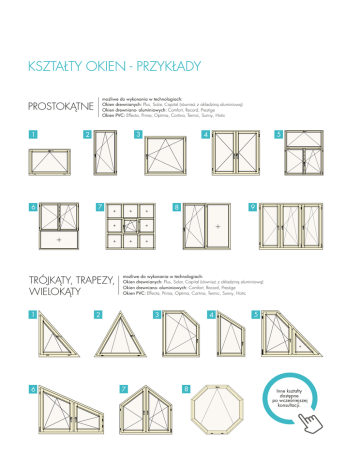 KSZTAŁTY OKIEN - PRZYKŁADY możliwe do wykonania w technologiach: Okien drewnianych: Plus, Solar, Capital (również z okładziną aluminiową) Okien drewniano- aluminiowych: Comfort, Record, Prestige Okien PVC: Effecta, Prima, Optima, Cortina, Termic, Sunny, Hotic PROSTOKĄTNE 1 6 3 2 7 TRÓJKĄTY, TRAPEZY, WIELOKĄTY 1 6 5 4 9 8 możliwe do wykonania w technologiach: Okien drewnianych: Plus, Solar, Capital (również z okładziną aluminiową) Okien drewniano- aluminiowych: Comfort, Record, Prestige Okien PVC: Effecta, Prima, Optima, Cortina, Termic, Sunny, Hotic 2 3 7 4 8 5 Inne kształty dostępne po wcześniejszej konsultacji. KSZTAŁTY OKIEN - PRZYKŁADY ŁUKI, OKRĄGŁE 1 3 2 6 11* możliwe do wykonania w technologiach: Okien drewnianych: Plus, Solar, Capital (również z okładziną aluminiową) Okien drewniano- aluminiowych: Comfort, Record, Prestige Okien PVC: Prima, Optima, Cortina, Termic, Sunny, Hotic 4 8 7 12* 13* * możliwe do wykonania tylko jako okna drewniane: Plus, Solar, Capital 16* * możliwe do wykonania tylko drewniano - aluminiowe: Comfort, Record, Prestige oraz okna PVC: Prima, Optima, Cortina, Termic, Sunny, Hotic * możliwe do wykonania tylko jako okna drewniane: Plus, Solar, Capital oraz okna PVC: Prima, Optima, Cortina,Termic, Sunny, Hotic 17* 5 * 9 10 14* 15* * możliwe do wykonania tylko jako okna drewniane Plus, niemożliwe do wykonania z okładziną aluminiową * możliwe do wykonania tylko jako okna drewniane: Plus, Solar, Capital oraz okna PVC: Prima, Optima, Cortina, Termic, Sunny, Hotic 18* * możliwe do wykonania tylko jako okna drewniane: Plus, Solar, Capital * możliwe do wykonania tylko jako okna drewniane: Plus, Solar, Capital, niemożliwe do wykonania z okładziną aluminiową Inne kształty dostępne po wcześniejszej konsultacji.
