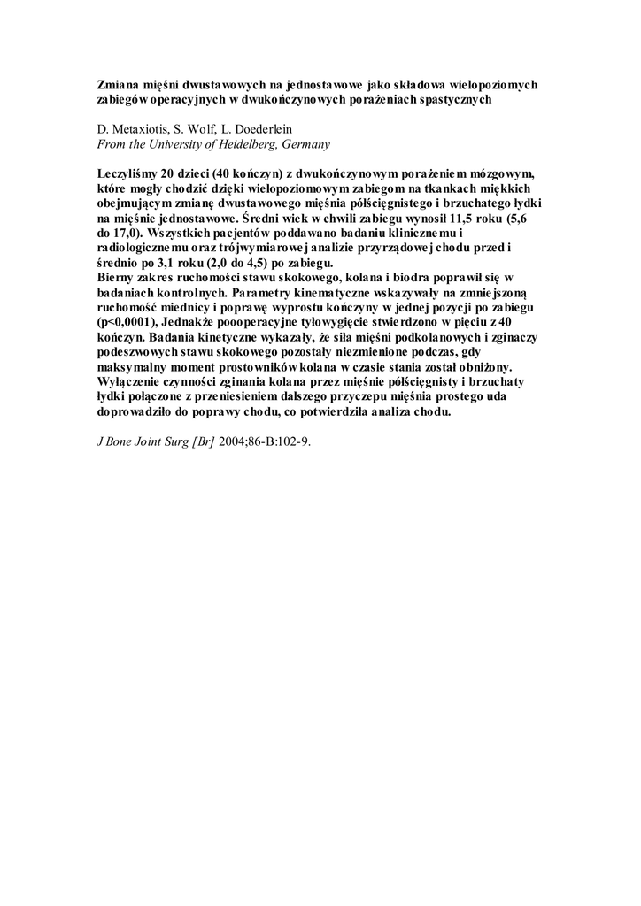 Zmiana mięśni dwustawowych na jednostawowe jako składowa wielopoziomych zabiegów operacyjnych w dwukończynowych porażeniach spastycznych D. Metaxiotis, S. Wolf, L. Doederlein From the University of Heidelberg, Germany Leczyliśmy 20 dzieci (40 kończyn) z dwukończynowym porażenie m mózgowym, które mogły chodzić dzięki wielopoziomowym zabiegom na tkankach miękkich obejmującym zmianę dwustawowego mięśnia półścięgnistego i brzuchatego łydki na mięśnie jednostawowe. Średni wiek w chwili zabiegu wynosił 11,5 roku (5,6 do 17,0). Ws zystkich pacjentów poddawano badaniu kliniczne mu i radiologiczne mu oraz trójwymiarowe j analizie przyrządowe j chodu przed i średnio po 3,1 roku (2,0 do 4,5) po zabiegu. Bierny zakres ruchomości stawu skokowego, kolana i biodra poprawił się w badaniach kontrolnych. Parametry kinematyczne wskazywały na zmnie jszoną ruchomość miednicy i poprawę wyprostu kończyny w jednej pozycji po zabiegu (p<0,0001), Jednakże poooperacyjne tyłowygięcie stwie rdzono w pięciu z 40 kończyn. Badania kinetyczne wykazały, że siła mięśni podkolanowych i zginaczy podeszwowych stawu skokowego pozostały niezmienione podczas, gdy maksymalny moment prostowników kolana w czasie stania został obniżony. Wyłączenie czynności zginania kolana przez mięśnie półścięgnisty i brzuchaty łydki połączone z prze niesieniem dalszego przyczepu mięśnia prostego uda doprowadziło do poprawy chodu, co potwierdziła analiza chodu. J Bone Joint Surg [Br] 2004;86-B:102-9.