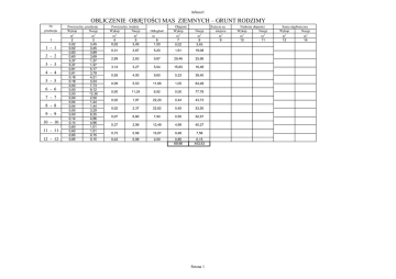 Arkusz1 OBLICZENIE OBJĘTOŚCI MAS ZIEMNYCH – GRUNT RODZIMY Nr przekroju 1 1 - 1 2 - 2 3 - 3 4 - 4 5 - 5 6 - 6 7 - 7 8 - 8 9 - 9 10 - 10 11 - 11 12 - 12 Powierzchn. przekroju Wykop Nasyp m2 2 0,02 0,02 0,60 0,60 5,37 5,37 0,91 0,91 0,18 0,18 0,00 0,00 0,00 0,00 0,04 0,04 0,00 0,00 0,14 0,14 0,60 0,60 0,85 0,85 m2 3 3,45 3,45 3,89 3,89 1,37 1,37 5,17 3,79 4,21 3,33 7,73 9,12 13,36 2,50 1,44 1,44 3,29 8,35 4,96 4,96 1,01 1,01 0,15 0,15 Powierzchn. średnia Wykop Nasyp m2 4 0,02 m2 5 3,45 0,31 Odległość Objętość Wykop Nasyp 6 1,00 m3 7 0,02 m3 8 3,45 3,67 5,20 1,61 19,08 2,99 2,63 9,87 29,46 25,96 3,14 3,27 5,04 15,83 16,48 0,55 4,00 9,60 5,23 38,40 0,09 5,53 11,66 1,05 64,48 0,00 11,24 6,92 0,00 77,78 0,02 1,97 22,20 0,44 43,73 0,02 2,37 22,62 0,45 53,50 0,07 6,66 7,90 0,55 52,57 0,37 2,99 13,49 4,99 40,27 0,73 0,58 13,07 9,48 7,58 0,43 0,08 2,00 0,85 69,96 0,15 443,43 m Strona 1 Zużycie na miejscu m3 9 Nadmiar objętości Wykop Nasyp m3 10 m3 11 Suma algebraiczna Wykop Nasyp m3 12 m3 14