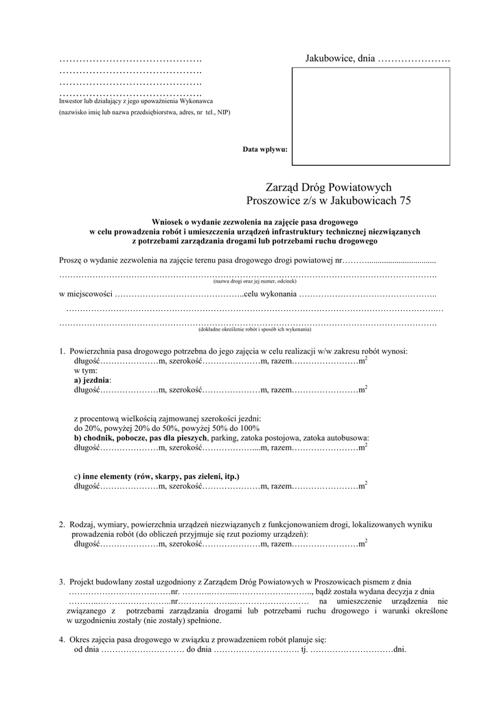 ……………………………………. ……………………………………. ……………………………………. ……………………………………. Jakubowice, dnia …………………. Inwestor lub działający z jego upowaŜnienia Wykonawca (nazwisko imię lub nazwa przedsiębiorstwa, adres, nr tel., NIP) Data wpływu: Zarząd Dróg Powiatowych Proszowice z/s w Jakubowicach 75 Wniosek o wydanie zezwolenia na zajęcie pasa drogowego w celu prowadzenia robót i umieszczenia urządzeń infrastruktury technicznej niezwiązanych z potrzebami zarządzania drogami lub potrzebami ruchu drogowego Proszę o wydanie zezwolenia na zajęcie terenu pasa drogowego drogi powiatowej nr………................................. ………………………………………………………………………………………………………………………. (nazwa drogi oraz jej numer, odcinek) w miejscowości ………………………………………..celu wykonania ………………………………………….. …………………………………………………………………………………………………………………….… ………………………………………………………………………………………………………………………. (dokładne określenie robót i sposób ich wykonania) 1. Powierzchnia pasa drogowego potrzebna do jego zajęcia w celu realizacji w/w zakresu robót wynosi: długość…………………m, szerokość…………………m, razem……………………m2 w tym: a) jezdnia: długość…………………m, szerokość…………………m, razem……………………m2 z procentową wielkością zajmowanej szerokości jezdni: do 20%, powyŜej 20% do 50%, powyŜej 50% do 100% b) chodnik, pobocze, pas dla pieszych, parking, zatoka postojowa, zatoka autobusowa: długość…………………m, szerokość………………....m, razem……………………m2 c) inne elementy (rów, skarpy, pas zieleni, itp.) długość…………………m, szerokość…………………m, razem……………………m2 2. Rodzaj, wymiary, powierzchnia urządzeń niezwiązanych z funkcjonowaniem drogi, lokalizowanych wyniku prowadzenia robót (do obliczeń przyjmuje się rzut poziomy urządzeń): długość…………………m, szerokość…………………m, razem……………………m2 3. Projekt budowlany został uzgodniony z Zarządem Dróg Powiatowych w Proszowicach pismem z dnia ………………………….……nr. ………..……....………………..…….., bądź została wydana decyzja z dnia ………..……….……………..nr………….……..……………………… na umieszczenie urządzenia nie związanego z potrzebami zarządzania drogami lub potrzebami ruchu drogowego i warunki określone w uzgodnieniu zostały (nie zostały) spełnione. 4. Okres zajęcia pasa drogowego w związku z prowadzeniem robót planuje się: od dnia ………………………… do dnia …………………………. tj. …………………………dni. 5. Wykonawcą robót będzie: …………………………………………………………………………………………………………………….…… ………………………………………………………………………………………………………………….… ………………………………………………………………………………………………………………………. (nazwa przedsiębiorstwa, zakładu, osoby fizycznej) 6. Kierownikiem robót będzie: ………………………………………………………………………………………………………………………. (imię nazwisko, telefon słuŜbowy) Nr dowodu osobistego………………………………wydany przez……………………………………………….. zamieszkały w ……………………………………………………………………………………………………… (dokładny adres) 7. Inspektorem nadzoru będzie: ………………………………………………………………………………………………………………………. (imię i nazwisko) ………………………………………………………………………………………………………………………. (instytucja, nr telefonu słuŜbowego) (podpis, pieczątka) 8. Okres zajęcia pasa drogowego przez urządzenie techniczne objęte wnioskiem: od dnia ………………………………… do dnia …………………………… tj. ……………………………. 9. Opłaty za zajęcie pasa drogowego i umieszczenie w nim urządzeń nie związanych z funkcjonowaniem drogi zostaną pokryte przez: ……………………………………………………………………………………………………………………..... ………………………………………………………………………………………………………………………. 10. Do wniosku zgodnie z § 1 pkt. 3, 5, 6 rozporządzenia Rady Ministrów z dnia 1 czerwca 2004 r. w sprawie określenia warunków udzielania zezwoleń na zajęcie pasa drogowego (Dz. U. Nr 140, poz. 1481) naleŜy załączyć następujące załączniki: a) plan sytuacyjny odcinka pasa drogowego przewidzianego do zajęcia z podaniem jego wymiarów w skali 1:500, oraz zaznaczoną trasą urządzeń objętych wnioskiem, b) szczegółowy harmonogram robót (w przypadku etapowego prowadzenia robót), c) ksero projektu tymczasowej organizacji ruchu na czas prowadzenia robót, d) ksero decyzji uzgadniającej lokalizację urządzeń w pasie drogowym, e) ksero pozwolenia na budowę lub zgłoszenia, Wykonawca stwierdza, Ŝe posiada pełny asortyment materiałów oraz odpowiedni sprzęt i moc przerobową, a takŜe rozeznane uzbrojenie terenu do prowadzenia powyŜszych robót. Prawidło