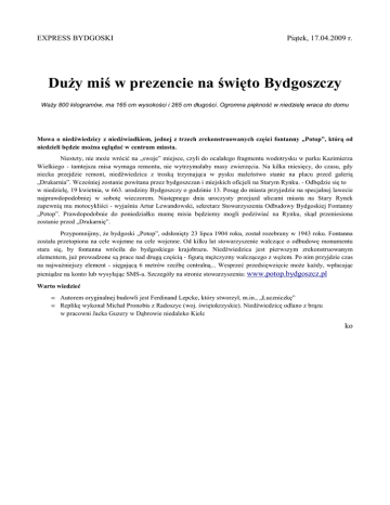 EXPRESS BYDGOSKI Piątek, 17.04.2009 r. DuŜy miś w prezencie na święto Bydgoszczy WaŜy 800 kilogramów, ma 165 cm wysokości i 265 cm długości. Ogromna piękność w niedzielę wraca do domu Mowa o niedźwiedzicy z niedźwiadkiem, jednej z trzech zrekonstruowanych części fontanny „Potop”, którą od niedzieli będzie moŜna oglądać w centrum miasta. Niestety, nie moŜe wrócić na „swoje” miejsce, czyli do ocalałego fragmentu wodotrysku w parku Kazimierza Wielkiego - tamtejsza misa wymaga remontu, nie wytrzymałaby masy zwierzęcia. Na kilka miesięcy, do czasu, gdy niecka przejdzie remont, niedźwiedzica z troską trzymająca w pysku maleństwo stanie na placu przed galerią „Drukarnia”. Wcześniej zostanie powitana przez bydgoszczan i miejskich oficjeli na Starym Rynku. - Odbędzie się to w niedzielę, 19 kwietnia, w 663. urodziny Bydgoszczy o godzinie 13. Posąg do miasta przyjedzie na specjalnej lawecie najprawdopodobniej w sobotę wieczorem. Następnego dnia uroczysty przejazd ulicami miasta na Stary Rynek zapewnią mu motocykliści - wyjaśnia Artur Lewandowski, sekretarz Stowarzyszenia Odbudowy Bydgoskiej Fontanny „Potop”. Prawdopodobnie do poniedziałku mamę misia będziemy mogli podziwiać na Rynku, skąd przeniesiona zostanie przed „Drukarnię”. Przypomnijmy, Ŝe bydgoski „Potop”, odsłonięty 23 lipca 1904 roku, został rozebrany w 1943 roku. Fontanna została przetopiona na cele wojenne na cele wojenne. Od kilku lat stowarzyszenie walczące o odbudowę monumentu stara się, by fontanna wróciła do bydgoskiego krajobrazu. Niedźwiedzica jest pierwszym zrekonstruowanym elementem, juŜ prowadzone są prace nad drugą częścią - figurą męŜczyzny walczącego z węŜem. Po nim przyjdzie czas na najwaŜniejszy element - sięgającą 6 metrów rzeźbę centralną... Wesprzeć przedsięwzięcie moŜe kaŜdy, wpłacając pieniądze na konto lub wysyłając SMS-a. Szczegóły na stronie stowarzyszenia: www.potop.bydgoszcz.pl Warto wiedzieć • • Autorem oryginalnej budowli jest Ferdinand Lepcke, który stworzył, m.in., „Łuczniczkę” Replikę wykonał Michał Pronobis z Radoszyc (woj. świętokrzyskie). Niedźwiedzicę odlano z brązu w pracowni Jacka Guzery w Dąbrowie niedaleko Kielc ko