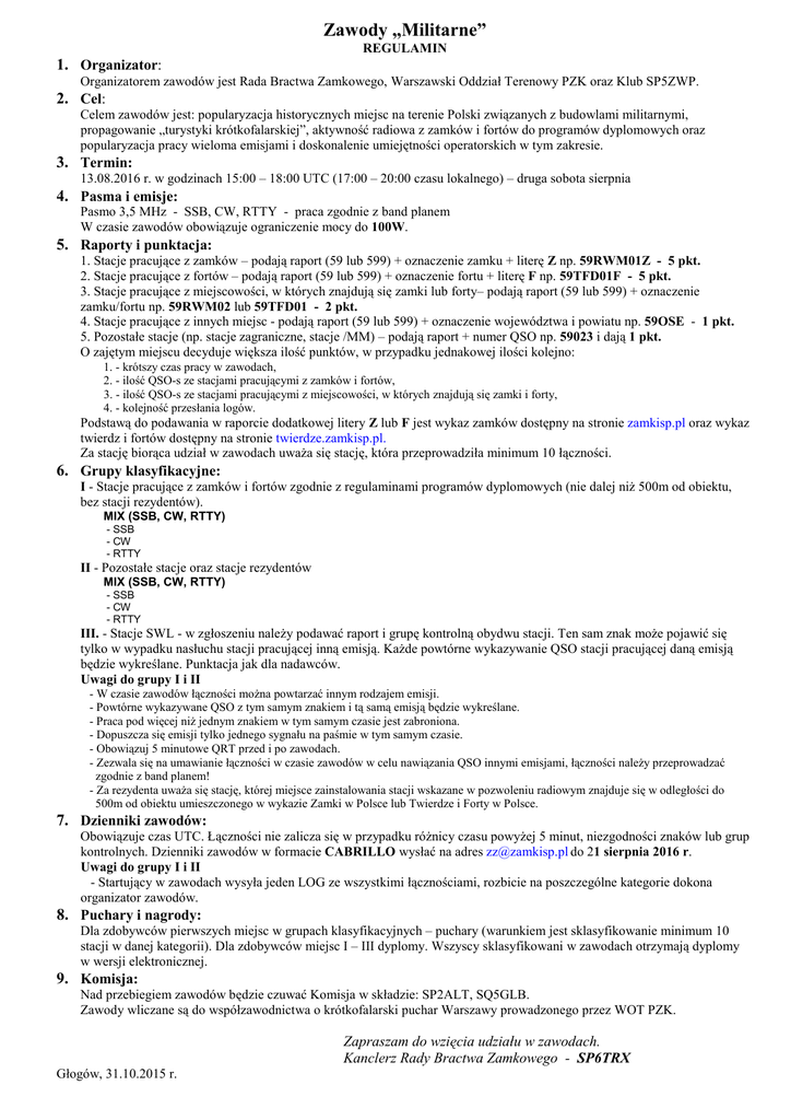 Zawody „Militarne” REGULAMIN 1. Organizator: Organizatorem zawodów jest Rada Bractwa Zamkowego, Warszawski Oddział Terenowy PZK oraz Klub SP5ZWP. 2. Cel: Celem zawodów jest: popularyzacja historycznych miejsc na terenie Polski związanych z budowlami militarnymi, propagowanie „turystyki krótkofalarskiej”, aktywność radiowa z zamków i fortów do programów dyplomowych oraz popularyzacja pracy wieloma emisjami i doskonalenie umiejętności operatorskich w tym zakresie. 3. Termin: 13.08.2016 r. w godzinach 15:00 – 18:00 UTC (17:00 – 20:00 czasu lokalnego) – druga sobota sierpnia 4. Pasma i emisje: Pasmo 3,5 MHz - SSB, CW, RTTY - praca zgodnie z band planem W czasie zawodów obowiązuje ograniczenie mocy do 100W. 5. Raporty i punktacja: 1. Stacje pracujące z zamków – podają raport (59 lub 599) + oznaczenie zamku + literę Z np. 59RWM01Z - 5 pkt. 2. Stacje pracujące z fortów – podają raport (59 lub 599) + oznaczenie fortu + literę F np. 59TFD01F - 5 pkt. 3. Stacje pracujące z miejscowości, w których znajdują się zamki lub forty– podają raport (59 lub 599) + oznaczenie zamku/fortu np. 59RWM02 lub 59TFD01 - 2 pkt. 4. Stacje pracujące z innych miejsc - podają raport (59 lub 599) + oznaczenie województwa i powiatu np. 59OSE - 1 pkt. 5. Pozostałe stacje (np. stacje zagraniczne, stacje /MM) – podają raport + numer QSO np. 59023 i dają 1 pkt. O zajętym miejscu decyduje większa ilość punktów, w przypadku jednakowej ilości kolejno: 1. - krótszy czas pracy w zawodach, 2. - ilość QSO-s ze stacjami pracującymi z zamków i fortów, 3. - ilość QSO-s ze stacjami pracującymi z miejscowości, w których znajdują się zamki i forty, 4. - kolejność przesłania logów. Podstawą do podawania w raporcie dodatkowej litery Z lub F jest wykaz zamków dostępny na stronie zamkisp.pl oraz wykaz twierdz i fortów dostępny na stronie twierdze.zamkisp.pl. Za stację biorąca udział w zawodach uwaŜa się stację, która przeprowadziła minimum 10 łączności. 6. Grupy klasyfikacyjne: I - Stacje pracujące z zamków i fortów zgodnie z regulaminami programów dyplomowych (nie dalej niŜ 500m od obiektu, bez stacji rezydentów). MIX (SSB, CW, RTTY) - SSB - CW - RTTY II - Pozostałe stacje oraz stacje rezydentów MIX (SSB, CW, RTTY) - SSB - CW - RTTY III. - Stacje SWL - w zgłoszeniu naleŜy podawać raport i grupę kontrolną obydwu stacji. Ten sam znak moŜe pojawić się tylko w wypadku nasłuchu stacji pracującej inną emisją. KaŜde powtórne wykazywanie QSO stacji pracującej daną emisją będzie wykreślane. Punktacja jak dla nadawców. Uwagi do grupy I i II - W czasie zawodów łączności moŜna powtarzać innym rodzajem emisji. - Powtórne wykazywane QSO z tym samym znakiem i tą samą emisją będzie wykreślane. - Praca pod więcej niŜ jednym znakiem w tym samym czasie jest zabroniona. - Dopuszcza się emisji tylko jednego sygnału na paśmie w tym samym czasie. - Obowiązuj 5 minutowe QRT przed i po zawodach. - Zezwala się na umawianie łączności w czasie zawodów w celu nawiązania QSO innymi emisjami, łączności naleŜy przeprowadzać zgodnie z band planem! - Za rezydenta uwaŜa się stację, której miejsce zainstalowania stacji wskazane w pozwoleniu radiowym znajduje się w odległości do 500m od obiektu umieszczonego w wykazie Zamki w Polsce lub Twierdze i Forty w Polsce. 7. Dzienniki zawodów: Obowiązuje czas UTC. Łączności nie zalicza się w przypadku róŜnicy czasu powyŜej 5 minut, niezgodności znaków lub grup kontrolnych. Dzienniki zawodów w formacie CABRILLO wysłać na adres [email protected] do 21 sierpnia 2016 r. Uwagi do grupy I i II - Startujący w zawodach wysyła jeden LOG ze wszystkimi łącznościami, rozbicie na poszczególne kategorie dokona organizator zawodów. 8. Puchary i nagrody: Dla zdobywców pierwszych miejsc w grupach klasyfikacyjnych – puchary (warunkiem jest sklasyfikowanie minimum 10 stacji w danej kategorii). Dla zdobywców miejsc I – III dyplomy. Wszyscy sklasyfikowani w zawodach otrzymają dyplomy w wersji elektronicznej. 9. Komisja: Nad przebiegiem zawodów będzie czuwać Komisja w składzie: SP2ALT, SQ5GLB. Zawody wliczane są do współzawodnictwa o krótkofalarski puchar Warszawy prowadzonego przez WOT PZK. Zapraszam do wzięcia udziału w zawodach. Kanclerz Rady Bractwa Zamkowego - SP6TRX Głogów, 31.10.2015 r.