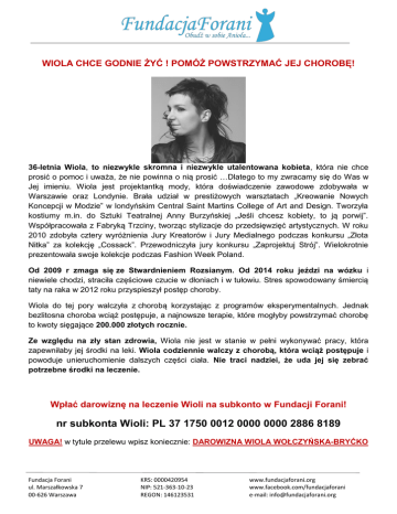 WIOLA CHCE GODNIE ŻYĆ ! POMÓŻ POWSTRZYMAĆ JEJ CHOROBĘ! 36-letnia Wiola, to niezwykle skromna i niezwykle utalentowana kobieta, która nie chce prosić o pomoc i uważa, że nie powinna o nią prosić …Dlatego to my zwracamy się do Was w Jej imieniu. Wiola jest projektantką mody, która doświadczenie zawodowe zdobywała w Warszawie oraz Londynie. Brała udział w prestiżowych warsztatach „Kreowanie Nowych Koncepcji w Modzie” w londyńskim Central Saint Martins College of Art and Design. Tworzyła kostiumy m.in. do Sztuki Teatralnej Anny Burzyńskiej „Jeśli chcesz kobiety, to ją porwij”. Współpracowała z Fabryką Trzciny, tworząc stylizacje do przedsięwzięć artystycznych. W roku 2010 zdobyła cztery wyróżnienia Jury Kreatorów i Jury Medialnego podczas konkursu „Złota Nitka” za kolekcję „Cossack”. Przewodniczyła jury konkursu „Zaprojektuj Strój”. Wielokrotnie prezentowała swoje kolekcje podczas Fashion Week Poland. Od 2009 r zmaga się ze Stwardnieniem Rozsianym. Od 2014 roku jeździ na wózku i niewiele chodzi, straciła częściowe czucie w dłoniach i w tułowiu. Stres spowodowany śmiercią taty na raka w 2012 roku przyspieszył postęp choroby. Wiola do tej pory walczyła z chorobą korzystając z programów eksperymentalnych. Jednak bezlitosna choroba wciąż postępuje, a najnowsze terapie, które mogłyby powstrzymać chorobę to kwoty sięgające 200.000 złotych rocznie. Ze względu na zły stan zdrowia, Wiola nie jest w stanie w pełni wykonywać pracy, która zapewniłaby jej środki na leki. Wiola codziennie walczy z chorobą, która wciąż postępuje i powoduje unieruchomienie dalszych części ciała. Nie traci nadziei, że uda jej się zebrać potrzebne środki na leczenie. Wpłać darowiznę na leczenie Wioli na subkonto w Fundacji Forani! nr subkonta Wioli: PL 37 1750 0012 0000 0000 2886 8189 UWAGA! w tytule przelewu wpisz koniecznie: DAROWIZNA WIOLA WOŁCZYŃSKA-BRYĆKO Fundacja Forani ul. Marszałkowska 7 00-626 Warszawa KRS: 0000420954 NIP: 521-363-10-23 REGON: 146123531 www.fundacjaforani.org www.facebook.com/fundacjaforani e-mail: [email protected]