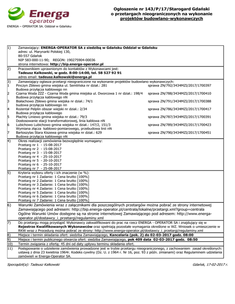 Ogłoszenie nr 143/P/17/Starogard Gdański o przetargach nieograniczonych na wykonanie projektów budowlano-wykonawczych ENERGA – OPERATOR SA. Oddział w Gdańsku 1) 2) 3) 1 2 3 4 5 6 7 4) 5) Zamawiający: ENERGA-OPERATOR SA z siedzibą w Gdańsku Oddział w Gdańsku adres: ul. Marynarki Polskiej 130, 80-557 Gdańsk NIP 583-000-11-90; REGON: 190275904-00036 strona internetowa: http://bip.energa-operator.pl Pracownikiem uprawnionym do kontaktów z Wykonawcami jest: Tadeusz Kalkowski, w godz. 8:00-14:00, tel. 58 527 92 91 adres email: [email protected] Zamawiający ogłasza przetargi nieograniczone na wykonanie projektów budowlano wykonawczych: Pinczyn Zblewo gmina wiejska ul. Semlińska nr dział.: 281 sprawa ZN/792/3434MZI/2017/1700397 Budowa przyłącza kablowego nn Czarna Woda ŻŻŻ - Czarna Woda gmina miejska ul. Dworcowa 1 nr dział.: 198/4 sprawa ZN/788/3434MZI/2017/1700410 Budowa przyłącza kablowego nN Białachowo Zblewo gmina wiejska nr dział.: 74/1 sprawa ZN/791/3434MZI/2017/1700388 budowa przyłącza kablowego nn Rożental Pelplin obszar wiejski nr dział.: 2/34 sprawa ZN/786/3434MZI/2017/1700417 Budowa przyłącza kablowego Płachty Liniewo gmina wiejska nr dział.: 79/3 sprawa ZN/787/3434MZI/2017/1700391 Dostosowanie stacji transformatorowej, linia kablowa nN Lubichowo Lubichowo gmina wiejska nr dział.: 147/2, 151/3 sprawa ZN/789/3434MZI/2017/1700423 Wymiana złącza kablowo-pomiarowego, przebudowa linii nN Bartoszylas Stara Kiszewa gmina wiejska nr dział.: 629 sprawa ZN/790/3434MZI/2017/1700451 Budowa przyłącza kablowego nN Okres realizacji zamówienia bezwzględnie wymagany: Przetarg nr 1 - 15-08-2017 Przetarg nr 2 - 15-08-2017 Przetarg nr 3 - 15-08-2017 Przetarg nr 4 - 25-10-2017 Przetarg nr 5 - 20-10-2017 Przetarg nr 6 - 25-10-2017 Przetarg nr 7 - 25-08-2017 Kryteria wyboru oferty i ich znaczenie (w %): Przetarg nr 1 Zadanie: 1 Cena brutto [100%] Przetarg nr 2 Zadanie: 1 Cena brutto [100%] Przetarg nr 3 Zadanie: 1 Cena brutto [100%] Przetarg nr 4 Zadanie: 1 Cena brutto [100%] Przetarg nr 5 Zadanie: 1 Cena brutto [100%] Przetarg nr 6 Zadanie: 1 Cena brutto [100%] Przetarg nr 7 Zadanie: 1 Cena brutto [100%] 6) Warunki Zamówienia wraz z załącznikami dla poszczególnych przetargów można pobrać ze strony internetowej Zamawiającego pod adresem: http://bip.energa-operator.pl/centrala/lokalne/przetargi.xml?group=centrala Ogólne Warunki Umów dostępne są na stronie internetowej Zamawiającego pod adresem: http://www.energaoperator.pl/dostawcy_i_przetargi/regulaminy.xml 7) Do przetargu mogą przystąpić Wykonawcy zakwalifikowani do prac na rzecz ENERGA - OPERATOR SA i znajdujący się w Rejestrze Kwalifikowanych Wykonawców oraz spełniają pozostałe wymagania określone w WZ. Wniosek o umieszczenie w RKW wraz z Procedurą można pobrać ze strony: http://www.energa-operator.pl/dostawcy_i_przetargi/regulaminy.xml Miejsce i termin składania ofert: siedziba Zamawiającego, Kancelaria (pok. 2) do 02-03-2017 godz. 08:00 Miejsce i termin publicznego otwarcia ofert: siedziba Zamawiającego, pok 409 data 02-03-2017 godz. 08:50 Termin związania z ofertą: 45 dni od daty upływu terminu składania ofert. Postępowanie o udzielenie zamówienia prowadzone jest w trybie przetargu nieograniczonego, z zachowaniem zasad określonych: ustawą z dnia 23 kwietnia 1964r. Kodeks cywilny (Dz. U. z 1964 r. Nr 16, poz. 93 z późn. zmianami) oraz Regulaminem udzielania zamówień w Energa-Operator SA. 8) 9) 10) 11) Sporządził(a): Tadeusz Kalkowski Gdańsk, 17-02-2017 r. Ogłoszenie nr 143/P/17/Starogard Gdański o przetargach nieograniczonych na wykonanie projektów budowlano-wykonawczych ENERGA – OPERATOR SA. Oddział w Gdańsku ENERGA – OPERATOR SA Oddział w Gdańsku WARUNKI ZAMÓWIENIA do przetargów nieograniczonych z ogłoszenia nr 143/P/17/Starogard Gdański prowadzonych przez ENERGA – OPERATOR SA Oddział w Gdańsku w oparciu o Regulamin udzielania zamówień w ENERGA-OPERATOR SA przedmiot zamówienia – wykonanie projektów budowlano-wykonawczych: 1 2 3 4 5 6 7 Pinczyn Zblewo gmina wiejska ul. Semlińska nr dział.: 281 Budowa przyłącza kablowego nn Czarna Woda ŻŻŻ - Czarna Woda gmina miejska ul. Dworcowa 1 nr dział.: 198/4 Budowa przyłącza kablowego nN Białachowo Zblewo gmina wiejska nr dział.: 74/1 budowa przyłącza kablowego nn Rożental Pelplin obszar wiejski nr dział.: 2/34 Budowa przyłącza kablowego Płachty Liniewo gmina wiejska nr dział.: 79/3 Dostosowanie stacji transformatorowej, linia kablowa nN Lubichowo Lubichowo gmina wiejska nr dział.: 147/2, 151/3 Wymiana złącza kablowo-pomiarowego, przebudowa linii nN Bartoszylas Stara Kiszewa gmina wiejska nr dział.: 629 Budowa przyłącza kablowego nN sprawa ZN/792/3434MZI/2017/1700397 sprawa ZN/788/3434MZI/2017/1700410 sprawa ZN/791/3434MZI/2017/1700388 sprawa ZN/786/3434MZI/2017/1700417 sprawa ZN/787/3434MZI/2017/1700391 sprawa ZN/789/3434MZI/2017/1700423 sprawa ZN/790/3434MZI/2017/1700451 Spis treści: I. II. III. IV. V. VI. VII. VIII. IX. X. XI. XII. XIII. XIV. XV. Informacje wstępne Przedmiot zamówienia Terminy Wymagania, jakie muszą spełniać Wykonawcy Wymagane dokumenty i oświadczenia potwierdzające spełnienie warunków udziału w postępowaniu Wadium i zabezpieczenie należytego wykonania umowy Wybór oferty Udzielanie wyjaśnień i wprowadzanie zmian Sposób obliczenia ceny i kryterium oceny ofert Sposób przygotowania oferty Otwarcie i badanie ofert Unieważnienie postępowania Środki ochrony prawnej Zawarcie umowy Wykaz załączników do WZ Gdańsk, 02-2017 r 1 / 4 ENERGA – OPERATOR SA Oddział w Gdańsku I. 1. Informacje wstępne Zamawiający: ENERGA – OPERATOR SPÓŁKA AKCYJNA z siedzibą w Gdańsku, przy ulicy Marynarki Polskiej 130, 80-557 Gdańsk, wpisana do Krajowego Rejestru Sądowego - Rejestru Przedsiębiorców przez Sąd Rejonowy Gdańsk-Północ w Gdańsku, VII Wydział Gospodarczy Krajowego Rejestru Sądowego, pod numerem KRS 0000033455, NIP 583-000-11-90, k