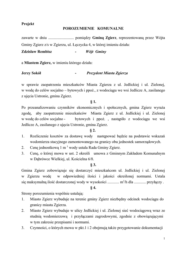 Projekt POROZUMIENIE KOMUNALNE zawarte w dniu .......................... pomiędzy Gminą Zgierz, reprezentowaną przez Wójta Gminy Zgierz z/s w Zgierzu, ul. Łęczycka 4, w której imieniu działa: Zdzisław Rembisz - Wójt Gminy a Miastem Zgierz, w imieniu którego działa: Jerzy Sokół - Prezydent Miasta Zgierza w sprawie zaopatrzenia mieszkańców Miasta Zgierza z ul. Jedlickiej i ul. Zielonej, w wodę do celów socjalno – bytowych i ppoż., z wodociągu we wsi Jedlicze A, zasilanego z ujęcia Ustronie, gmina Zgierz. § 1. Po przeanalizowaniu czynników ekonomicznych i społecznych, gmina Zgierz wyraża zgodę, aby zaopatrzenie mieszkańców Miasta Zgierz z ul. Jedlickiej i ul. Zielonej w wodę do celów socjalno bytowych i ppoż. , nastąpiło z wodociągu we wsi Jedlicze A, zasilanego z ujęcia Ustronie, gmina Zgierz. § 2. 1. Rozliczenie kosztów za dostawę wody następować będzie na podstawie wskazań wodomierza stacyjnego zamontowanego na granicy obu jednostek samorządowych. 2. Cenę jednostkową 1 m 3 wody ustala Rada Gminy Zgierz. 3. Cenę, o której mowa w ust. 2 określi umowa z Gminnym Zakładem Komunalnym w Dąbrówce Wielkiej, ul. Kościelna 6/8. § 3. Gmina Zgierz zobowiązuje się dostarczyć mieszkańcom ul. Jedlickiej i ul. Zielonej w Zgierzu wodę w odpowiedniej ilości i jakości określonej normami. Ustala się maksymalną ilość dostarczonej wody w wysokości ............ m3/h dla ............ przyłączy . § 4. Strony porozumienia wspólnie ustalają: 1. Miasto Zgierz wybuduje na terenie gminy Zgierz niezbędny odcinek wodociągu do granicy miasta Zgierza. 2. Miasto Zgierz wybuduje w ulicy Jedlickiej i ul. Zielonej sieć wodociągową wraz ze studnią wodomierzową i przyłączami zagrodowymi, zgodnie z obowiązującymi w tym zakresie przepisami i normami. 3. Czynności, o których mowa w pkt.1 i 2 obejmują także przygotowanie dokumentacji 1 projektowej wraz ze wszelkimi uzgodnieniami oraz opiniami właściwych organów i jednostek oraz pozwoleniem na budowę. 4. Przebieg sieci wodociągowej oraz lokalizację przyłączy wodociągowych na terenie Miasta Zgierza objętej niniejszym porozumieniem określa załącznik do porozumienia. 5. Miasto Zgierz poniesie koszty budowy sieci wodociągowej wraz ze studnią wodomierzową i przyłączami zagrodowymi zgodnie z zakresem rzeczowym określonym w pkt.1 i 2. 6. Sieć wodociągowa wybudowana na terenie gminy Zgierz stanowić będzie własność gminy Zgierz, a sieć wybudowana na terenie miasta Zgierza - własność miasta Zgierza. 7. Obowiązek utrzymania i konserwacji sieci wodociągowej spoczywa na właścicielu sieci. § 5. Strony wspólnie ustalają, że Gmina Zgierz i Gminny Zakład Komunalny będą realizowały wszelkie prawa i obowiązki przysługujące dostawcy wody wynikłe z przepisów powszechnie obowiązujących, bądź ustaleń niniejszego porozumienia. § 6. Każdorazowa rozbudowa sieci i przyłączy ponad zakres ustalony w § 3 oraz zmiana przeznaczenia poboru wody na cele inne niż socjalno - bytowe i ppoż. wymaga zgody dostawcy wody. § 7. 1. Porozumienie zostaje zawarte na czas nieokreślony. 2. Ograniczenie czasu trwania lub zakresu obowiązywania porozumienia może nastąpić w przypadku braku możliwości poboru wody z ujęcia we wsi Ustronie, w wystarczającej ilości lub jakości uniemożliwiającej odpowiednie uzdatnienie, bądź też zaistnienie innych zdarzeń o charakterze losowym, na które nie ma wpływu żadna ze stron. § 8. 1. Rozwiązanie porozumienia może nastąpić w wyniku wypowiedzenia przez jedną ze stron. Okres wypowiedzenia ustala się na ........ od daty złożenia wypowiedzenia. 2. Za zgodą stron porozumienie może być rozwiązane w każdym czasie. § 9. 1. Nieterminowe regulowanie wzajemnych zobowiązań finansowych stanowi podstawę do naliczania odsetek ustawowych. 2. Terminy płatności za wodę określi umowa, o której mowa w § 2 ust. 3. 2 § 10. W sprawach nie uregulowanych niniejszym porozumieniem stosuje się przepisy ustawy „Prawo wodne” z przepisami wykonawczymi, ustawy o zbiorowym zaopatrzeniu w wodę i zbiorowym odprowadzaniu ścieków oraz kodeks cywilny. § 11. 1. Powyższe porozumienie wymaga akceptacji Rad obu Gmin. 2. Zmiana treści porozumienia wymaga formy pisemnej oraz zastosowania takiej samej procedury jak w przypadku jego zawarcia. 3. Porozumienie zostaje ogłoszone w Dzienniku Urzędowym Województwa Łódzkiego. § 12. Porozumienie sporządzono w 4 jednobrzmiących egzemplarzach, po 2 egz. dla każdej ze stron. Miasto Zgierz: Gmina Zgierz: 3