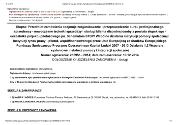 10.12.2014 bzp1.portal.uzp.gov.pl/index.php?ogloszenie=show&pozycja=255955&rok=20141210 Ogłoszenie powiązane: Ogłoszenie nr 2369212014 z dnia 20141113 r. Ogłoszenie o zamówieniu Słupsk Kurs Profesjonalny sprzedawca nowoczesne techniki sprzedaży i obsługi klienta 1. Grupa docelowa: 1 osoba kobieta, posiadająca wykształcenie średnie ogólne. 2. Zamówienie realizowane w łącznej liczbie 100 godzin, z czego zajęcia... Termin składania ofert: 20141121 Słupsk: Przedmiot zamówienia obejmuje zorganizowanie i przeprowadzenie kursu profesjonalnego sprzedawcy nowoczesne techniki sprzedaży i obsługi klienta dla jednej osoby z powiatu słupskiego uczestnika projektu pilotażowego pn. Schematom STOP! Wspólne działania instytucji pomocy społecznej i instytucji rynku pracy pilotaż, współfinansowanego przez Unie Europejską ze środków Europejskiego Funduszu Społecznego Programu Operacyjnego Kapitał Ludzki 2007 2013 Działanie 1.2 Wsparcie systemowe instytucji pomocy i integracji społecznej Numer ogłoszenia: 255955 2014; data zamieszczenia: 10.12.2014 OGŁOSZENIE O UDZIELENIU ZAMÓWIENIA Usługi Zamieszczanie ogłoszenia: obowiązkowe. Ogłoszenie dotyczy: zamówienia publicznego. Czy zamówienie było przedmiotem ogłoszenia w Biuletynie Zamówień Publicznych: tak, numer ogłoszenia w BZP: 236921 2014r. Czy w Biuletynie Zamówień Publicznych zostało zamieszczone ogłoszenie o zmianie ogłoszenia: nie. SEKCJA I: ZAMAWIAJĄCY I. 1) NAZWA I ADRES: Powiatowe Centrum Pomocy Rodzinie, Al. Sienkiewicza 20, 76200 Słupsk, woj. pomorskie, tel. 59 8414311, faks 59 841 0196. I. 2) RODZAJ ZAMAWIAJĄCEGO: Administracja samorządowa. SEKCJA II: PRZEDMIOT ZAMÓWIENIA http://bzp1.portal.uzp.gov.pl/index.php?ogloszenie=show&pozycja=255955&rok=20141210 1/4 10.12.2014 bzp1.portal.uzp.gov.pl/index.php?ogloszenie=show&pozycja=255955&rok=20141210 II.1) Nazwa nadana zamówieniu przez zamawiającego: Przedmiot zamówienia obejmuje zorganizowanie i przeprowadzenie kursu profesjonalnego sprzedawcy nowoczesne techniki sprzedaży i obsługi klienta dla jednej osoby z powiatu słupskiego uczestnika projektu pilotażowego pn. Schematom STOP! Wspólne działania instytucji pomocy społecznej i instytucji rynku pracy pilotaż, współfinansowanego przez Unie Europejską ze środków Europejskiego Funduszu Społecznego Programu Operacyjnego Kapitał Ludzki 2007 2013 Działanie 1.2 Wsparcie systemowe instytucji pomocy i integracji społecznej. II.2) Rodzaj zamówienia: Usługi. II.3) Określenie przedmiotu zamówienia: Kurs Profesjonalny sprzedawca nowoczesne techniki sprzedaży i obsługi klienta 1. Grupa docelowa: 1 osoba kobieta, posiadająca wykształcenie średnie ogólne. 2. Zamówienie realizowane w łącznej liczbie 100 godzin, z czego zajęcia teoretyczne stanowić będą 30 godzin dydaktycznych, zajęcia praktyczne stanowić będą 70 godzin zegarowych. 3. Termin realizacji kursu: do 22 grudnia 2014 r., (dokładny harmonogram zajęć ustalony zostanie na etapie zawierania umowy z Wykonawcą). 4. Miejsce realizacji zamówienia: 1) Zajęcia teoretyczne: sala szkoleniowa na terenie miasta Słupsk, przystosowana do potrzeb przeprowadzenia zajęć teoretycznych z kursu profesjonalnego sprzedawcy nowoczesne techniki sprzedaży i obsługi klienta; 2) Zajęcia z praktycznej nauki zawodu: sklep / punkt usługowy na terenie miasta Słupsk, wykluczający kontakt z żywnością, a umożliwiający bezpośrednie zastosowanie w praktyce nowoczesnych technik sprzedaży (np.: salon telefonii komórkowej, sklep z biżuterią, salon samochodowy i inne); 1. Zakres merytoryczny kursu: 1) obsługa kasy fiskalnej, obsługa terminali płatniczych, fakturowanie (poziom zaawansowany); 2) obsługa programu handlowo magazynowego; 3) podstawowe zagadnienia bhp i prawa pracy; 4) towaroznawstwo, przygotowanie towaru do sprzedaży; 5) rachunkowość sklepowa; 6) nowoczesne techniki sprzedaży (budowanie wizerunku firmy, fachowa prezentacja towaru, prowadzenie właściwej rozmowy sprzedażowej); 7) profesjonalna autoprezentacja; 8) psychologia sprzedaży; 9) negocjacje biznesowe; 2. Wykonawca zobowiązany jest do: 1) skierowania i sfinansowania badań z zakresu Medycyny Pracy ( pod kątem przeciwwskazań do wykonywania zawodu profesjonalnego sprzedawcy) badania należy przeprowadzić przed dniem rozpoczęcia kursu; 2) zapewnienia poczęstunku kawowego w każdym dnia kursu oraz ciepłego posiłku w formie drugiego dania z kompotem w przypadku zajęć trwających co najmniej 6 godzin w ciągu dnia; 3) zapewnienia niezbędnych materiałów i akcesoriów do przeprowadzenia kursu profesjonalnego sprzedawcy nowoczesne techniki sprzedaży i obsługi klienta; 4) zapewnienia odzieży ochronnej (jeżeli wystąpi taka konieczność); 5) zapewnienie materiałów piśmienniczych na potrzeby organizacji kurs; 6) ubezpieczenia uczestnika kursu od następstw nieszczęśliwych wypadków na kwotę minimalną 10000,00 zł (Wykonawca dostarczy kopię polisy Zamawiającemu przed rozpoczęciem kursu); 7) zapewnienia Sali szkoleniowej do przeprowadzenia zajęć teoretycznych oraz zapewnienia miejsca do praktycznej nauki zawodu (tj. sklep / punkt usługowy wykluczający kontakt z żywnością, a umożliwiający bezpośrednie zastosowanie w praktyce nowoczesnych technik sprzedaży np.: salon telefonii komórkowej, sklep z biżuterią, salon samochodowy i inne); 8) udostępnienia na czas trwania kursu innych akcesoriów poza wyżej wymienionymi niezbędnych do przeprowadzenia kursu profesjonalnego sprzedawcy nowoczesne techniki sprzedaży i obsługi klienta; 9) zapewnienia materiałów szkoleniowych http://bzp1.portal.uzp.gov.pl/index.php?ogloszenie=show&pozycja=255955&rok=20141210 2/4 10.12.2014 bzp1.portal.uzp.gov.pl/index.php?ogloszenie=show&pozycja=255955&rok=20141210 oraz jeden dodatkowy egzemplarz do dokumentacji projektowej; 10) przeprowadzenia wewnętrznego egzaminu końcowego wg aktualnie obowiązujących przepisów prawa i wydania uczestnikow