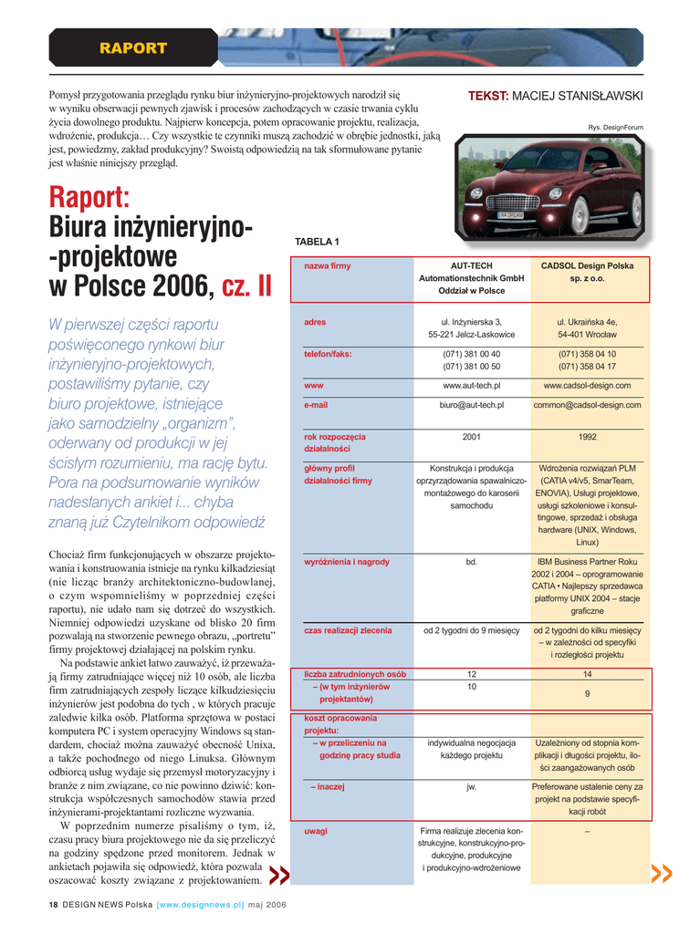 RAPORT Pomysł przygotowania przeglądu rynku biur inżynieryjno-projektowych narodził się TEKST: TEKST: MACIEJ STANISŁAWSKI w wyniku obserwacji pewnych zjawisk i procesów zachodzących w czasie trwania cyklu życia dowolnego produktu. Najpierw koncepcja, potem opracowanie projektu, realizacja, Rys. DesignForum wdrożenie, produkcja… Czy wszystkie te czynniki muszą zachodzić w obrębie jednostki, jaką jest, powiedzmy, zakład produkcyjny? Swoistą odpowiedzią na tak sformułowane pytanie jest właśnie niniejszy przegląd. Raport: Biura inżynieryjno-projektowe w Polsce 2006, cz. II TABELA 1 nazwa firmy AUT-TECH Automationstechnik GmbH Oddział w Polsce CADSOL Design Polska sp. z o.o. ul. Inżynierska 3, 55-221 Jelcz-Laskowice ul. Ukraińska 4e, 54-401 Wrocław telefon/faks: (071) 381 00 40 (071) 381 00 50 (071) 358 04 10 (071) 358 04 17 www www.aut-tech.pl www.cadsol-design.com e-mail [email protected] [email protected] 2001 1992 adres W pierwszej części raportu poświęconego rynkowi biur inżynieryjno-projektowych, postawiliśmy pytanie, czy biuro projektowe, istniejące jako samodzielny „organizm”, oderwany od produkcji w jej ścisłym rozumieniu, ma rację bytu. Pora na podsumowanie wyników nadesłanych ankiet i... chyba znaną już Czytelnikom odpowiedź rok rozpoczęcia działalności główny profil działalności firmy Chociaż firm funkcjonujących w obszarze projektowania i konstruowania istnieje na rynku kilkadziesiąt (nie licząc branży architektoniczno-budowlanej, o czym wspomnieliśmy w poprzedniej części raportu), nie udało nam się dotrzeć do wszystkich. Niemniej odpowiedzi uzyskane od blisko 20 firm pozwalają na stworzenie pewnego obrazu, „portretu” firmy projektowej działającej na polskim rynku. Na podstawie ankiet łatwo zauważyć, iż przeważają firmy zatrudniające więcej niż 10 osób, ale liczba firm zatrudniających zespoły liczące kilkudziesięciu inżynierów jest podobna do tych , w których pracuje zaledwie kilka osób. Platforma sprzętowa w postaci komputera PC i system operacyjny Windows są standardem, chociaż można zauważyć obecność Unixa, a także pochodnego od niego Linuksa. Głównym odbiorcą usług wydaje się przemysł motoryzacyjny i branże z nim związane, co nie powinno dziwić: konstrukcja współczesnych samochodów stawia przed inżynierami-projektantami rozliczne wyzwania. W poprzednim numerze pisaliśmy o tym, iż, czasu pracy biura projektowego nie da się przeliczyć na godziny spędzone przed monitorem. Jednak w ankietach pojawiła się odpowiedź, która pozwala oszacować koszty związane z projektowaniem. >> 18 DESIGN NEWS Polska [www.designnews.pl] maj 2006 Konstrukcja i produkcja Wdrożenia rozwiązań PLM oprzyrządowania spawalniczo(CATIA v4/v5, SmarTeam, montażowego do karoserii ENOVIA), Usługi projektowe, samochodu usługi szkoleniowe i konsultingowe, sprzedaż i obsługa hardware (UNIX, Windows, Linux) wyróżnienia i nagrody bd. IBM Business Partner Roku 2002 i 2004 – oprogramowanie CATIA • Najlepszy sprzedawca platformy UNIX 2004 – stacje graficzne czas realizacji zlecenia od 2 tygodni do 9 miesięcy od 2 tygodni do kilku miesięcy – w zależności od specyfiki i rozległości projektu 12 10 14 indywidualna negocjacja każdego projektu Uzależniony od stopnia komplikacji i długości projektu, ilości zaangażowanych osób jw. Preferowane ustalenie ceny za projekt na podstawie specyfikacji robót Firma realizuje zlecenia konstrukcyjne, konstrukcyjno-produkcyjne, produkcyjne i produkcyjno-wdrożeniowe – liczba zatrudnionych osób – (w tym inżynierów projektantów) koszt opracowania projektu: – w przeliczeniu na godzinę pracy studia – inaczej uwagi 9 >> RAPORT >> TABELA 1 (c.d.) nazwa firmy CAR Technology CIM-mes Projekt sp. z o.o. CNS Solutions DES ART sp. z o.o. adres ul. Starowiślna 13, 31-038 Kraków ul. Grzybowska 87, 00-844 Warszawa 02-912 Warszawa ul. Batorego 28-32, 81-366 Gdynia (012) 619 23 90 (012) 619 23 99 (022) 631 22 44 (022) 631 22 45 (022) 651 93 76 (022) 651 67 77 (058) 763 03 85 (058) 763 03 86 telefon/faks: www www.car-t.pl www.cim-mes.com.pl www.cns.pl/oferta www.desart.com.pl e-mail [email protected] [email protected] [email protected] [email protected] 2004 (CAR Technology Polska) 1987 1997 1998 Usługi projektowe, usługi Rapid Prototyping i Rapid Tooling, sprzedaż urządzeń do Rapid Prototyping projektowanie i analizy obliczeniowe w mechanice Dostarczanie rozwiązań i usług Usługowy – analizy symulacyjne MES wyróżnienia i nagrody bd. bd. bd. bd. czas realizacji zlecenia indywidualnie stosowny do zakresu pracy W zależności od projektu (od tygodnia do 2 lat) Od 3 dni do pół roku 17 15 6 5 20 10 bd. bd. indywidualnie bd. rok rozpoczęcia działalności główny profil działalności firmy liczba zatrudnionych osób – (w tym inżynierów projektantów) koszt opracowania projektu: – w przeliczeniu na godzinę pracy studia – inaczej uwagi >> zależna od wykorzystywanego negocjowana, zależna od typu oprogramowania 3D, stopnia pracy w podziale na projektotrudności projektu, etc. wanie, konstruowanie, analizy obliczeniowe, nadzór autorski Indywidualna wycena projektów – Koszt całkowity projektu, kwota za kg konstrukcji, Zależne od dziedziny i zakresu analizy – Firma realizuje zadania badawczo-rozwojowe i dysponuje własną kadrą naukową. Firma uczestniczy w projektach badawczo-rozwojowych realizowanych w ramach Programu Ramowego 6 – DES ART jest członkiem międzynarodowej organizacji NAFEMS, zrzeszającej firmy konsultingowe zajmujące się symulacjami i obliczeniami korzystając z Metody Elementów Skończonych oraz certyfikat jakości ISO 9001: 2000 dla świadczonych usług inżynierskich. Wymieniona tutaj przybliżona (zależna od wielu czynników, m.in. rodzaju użytego oprogramowania, liczby zaangażowanych specjalistów, wykonania dodatkowych analiz i badań, zatrudnienia konsultantów z zewnątrz, wreszcie o