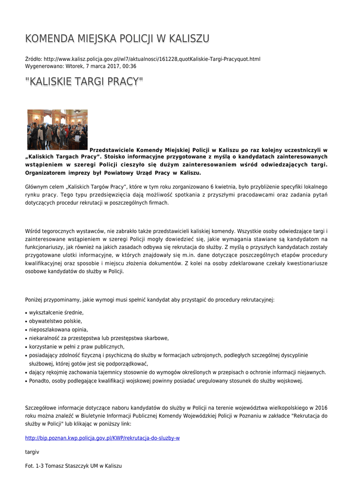 KOMENDA MIEJSKA POLICJI W KALISZU Źródło: http://www.kalisz.policja.gov.pl/wl7/aktualnosci/161228,quotKaliskie-Targi-Pracyquot.html Wygenerowano: Wtorek, 7 marca 2017, 00:36 "KALISKIE TARGI PRACY" Przedstawiciele Komendy Miejskiej Policji w Kaliszu po raz kolejny uczestniczyli w „Kaliskich Targach Pracy”. Stoisko informacyjne przygotowane z myślą o kandydatach zainteresowanych wstąpieniem w szeregi Policji cieszyło się dużym zainteresowaniem wśród odwiedzających targi. Organizatorem imprezy był Powiatowy Urząd Pracy w Kaliszu. Głównym celem „Kaliskich Targów Pracy”, które w tym roku zorganizowano 6 kwietnia, było przybliżenie specyfiki lokalnego rynku pracy. Tego typu przedsięwzięcia dają możliwość spotkania z przyszłymi pracodawcami oraz zadania pytań dotyczących procedur rekrutacji w poszczególnych firmach. Wśród tegorocznych wystawców, nie zabrakło także przedstawicieli kaliskiej komendy. Wszystkie osoby odwiedzające targi i zainteresowane wstąpieniem w szeregi Policji mogły dowiedzieć się, jakie wymagania stawiane są kandydatom na funkcjonariuszy, jak również na jakich zasadach odbywa się rekrutacja do służby. Z myślą o przyszłych kandydatach zostały przygotowane ulotki informacyjne, w których znajdowały się m.in. dane dotyczące poszczególnych etapów procedury kwalifikacyjnej oraz sposobie i miejscu złożenia dokumentów. Z kolei na osoby zdeklarowane czekały kwestionariusze osobowe kandydatów do służby w Policji. Poniżej przypominamy, jakie wymogi musi spełnić kandydat aby przystąpić do procedury rekrutacyjnej: ● wykształcenie średnie, ● obywatelstwo polskie, ● nieposzlakowana opinia, ● niekaralność za przestępstwa lub przestępstwa skarbowe, ● korzystanie w pełni z praw publicznych, ● posiadający zdolność fizyczną i psychiczną do służby w formacjach uzbrojonych, podległych szczególnej dyscyplinie służbowej, której gotów jest się podporządkować, ● dający rękojmię zachowania tajemnicy stosownie do wymogów określonych w przepisach o ochronie informacji niejawnych. ● Ponadto, osoby podlegające kwalifikacji wojskowej powinny posiadać uregulowany stosunek do służby wojskowej. Szczegółowe informacje dotyczące naboru kandydatów do służby w Policji na terenie województwa wielkopolskiego w 2016 roku można znaleźć w Biuletynie Informacji Publicznej Komendy Wojewódzkiej Policji w Poznaniu w zakładce "Rekrutacja do służby w Policji" lub klikając w poniższy link: http://bip.poznan.kwp.policja.gov.pl/KWP/rekrutacja-do-sluzby-w targiv Fot. 1-3 Tomasz Staszczyk UM w Kaliszu Ocena: 0/5 (0) Tweetnij