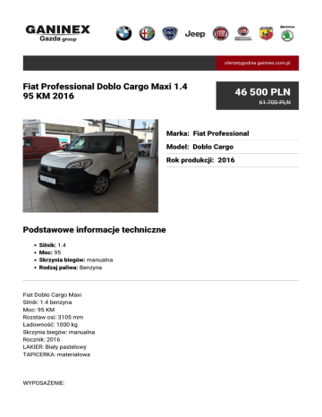 ofertatygodnia.ganinex.com.pl Fiat Professional Doblo Cargo Maxi 1.4 95 KM 2016 46 500 PLN Marka: Fiat Professional Model: Doblo Cargo Rok produkcji: 2016 Podstawowe informacje techniczne Silnik: 1.4 Moc: 95 Skrzynia biegów: manualna Rodzaj paliwa: Benzyna Fiat Doblo Cargo Maxi Silnik: 1.4 benzyna Moc: 95 KM Rozstaw osi: 3105 mm Ładowność: 1000 kg Skrzynia biegów: manualna Rocznik: 2016 LAKIER: Biały pastelowy TAPICERKA: materiałowa WYPOSAŻENIE: 61 700 PLN Centralny zamek z pilotem w kluczyku Kolumna kierownicy z regulacją wysokości Wspomaganie kierownicy Szyby przednie sterowane elektrycznie Boczne lusterka regulowane elektrycznie i podgrzewane Obrotomierz Centralny zamek z pilotem w kluczyku Kolumna kierownicy z regulacją wysokości Wspomaganie kierownicy Szyby przednie sterowane elektrycznie Boczne lusterka regulowane elektrycznie i podgrzewane Obrotomierz Regulacja wysokości świateł przednich Przystosowanie do montażu radia (okablowanie + antena) Podłokietnik i regulacja lędźwiowa siedzenia kierowcy Centralny zamek Siedzenie pasażera ze zintegrowanym schowkiem Korek wlewu paliwa zamykany na kluczyk System ESC (ABS+EBD+HBA+ASR+MSR+ESC+Hill Holder) Tylne gniazdko 12 V Poduszka powietrzna kierowcy Boczne drzwi przesuwne prawe Zaślepki okien bocznych Wyciszenie przegrody Siedzenie kierowcy z zagłówkami i regulacją typu "Passive" Schowek pod siedzeniem pasażera Wykładzina pokrywająca przestrzeń ładunkową PCV Gniazdo z zasilaniem 12V Kołpaki Listwy boczne Folia zewnętrzna ochronna Lusterka zewnętrzne lakierowane Pełnowymiarowe koło zapasowe Pakiet Komfort Klimatyzacja manualna Sterowanie radioodtwarzaczem z kierownicy Czujniki parkowania Czujnik temperatury zewnętrznej Radio VP1 BLUETOOTH - MP3 Podana cena jest ceną netto Katowice Katowice (Škoda) Pszczyna Gliwice Gliwice (BMW) al. Roździeńskiego 170 tel. 32 351 27 50 al. Roździeńskiego 182 tel. 32 203 66 00 ul. Bielska 31c tel. 32 210 10 00 ul. Pszczyńska 306 tel. 32 230 17 30 ul. Pszczyńska 322 tel. 32 700 10 00