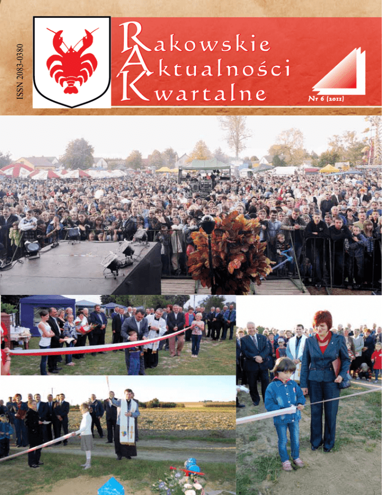 R akowskie A ktualności K wartalne ISSN 2083-0380 Rakowskie Aktualności Kwartalne -1- Życzę wszystkim mieszkańcom Gminy aby zbliżające się Święta Bożego Narodzenia upłynęły w zdrowiu, szczęściu i miłości, a Nowy Rok przyniósł wszystko co najlepsze Rakowskie Aktualności Kwartalne Piotr Żołądek Członek Zarządu Województwa Świętokrzyskiego Szanowni Mieszkańcy Gminy Raków Wszyscy razem i każdy z osobna zechciejcie przyjąć serdeczne życzenia zdrowia, szczęścia i miłości z okazji Świąt Bożego Narodzenia a nadchodzący Nowy Rok 2012 niech z każdym dniem przynosi Wam wszelką pomyślność życzenia składają Jerzy Nowak - Przewodniczący Rady Gminy Alina Siwonia - Wójt Gminy Pół wieku razem – Złote Gody w Gminie Raków Wspólnie przeżyte 50 lat, to niezwykły symbol wierności i miłości rodzinnej, dowód wzajemnego zrozumienia i istoty związku małżeńskiego, wzór i piękny przykład dla młodych pokoleń wstępujących w związki małżeńskie. Za zgodność pożycia małżeńskiego, za trud pracy i wyrzeczeń dla dobra swych rodzin założonych przed pół wiekiem, za wychowanie dzieci, za cierpienia, łzy, radości, za każdy siwy włos na ich skroni, w dniu 11 września 2011r. dostojni jubilaci z Gminy Raków Państwo: Władysława i Adam Bębnowie - Nowa Huta, Barbara i Piotr Dunajscy - Ociesęki, Marianna i Franciszek Kołodziejczykowie - Pułaczów, Helena i Józef Kuracińscy - Chańcza, Janina i Eugeniusz Lipcowie - Raków, Leokadia i Stanisław Łatowie - Pułaczów, Janina i Adam Mazurowie - Raków, Franciszka i Zygmunt Misterkiewiczowie - Głuchów Lasy, Małgorzata i Eugeniusz Orłowscy - Życiny zostali odznaczeni, nadanymi przez Prezydenta RP, medalami za długoletnie pożycie małżeńskie. Aktu dekoracji dokonała Pani Beata Oczkowicz – wicewojewoda Świętokrzyski oraz Wójt Gminy Raków – Pani Alina Siwonia w obecności Przewodniczącego Rady Gminy – Pana Jerzego Nowaka oraz Kierownika Urzędu Stanu Cywilnego – Pani Marii Góral. Zacni Jubilaci w towarzystwie członków swoich rodzin oraz zaproszeni goście, obejrzeli specjalnie na tę uroczystość przygotowany program słowno-muzyczny w wykonaniu dzieci i młodzieży ze świetlicy w Chańczy i w Rakowie. W obchody jubileuszu włączyło się aktywnie Koło Gospodyń Wiejskich z Szumska przygotowując poczęstunek dla wszystkich uczestników uroczystości. Za życzenia, medale, kwiaty, pamiątkowe dyplomy i upominki, organizatorom uroczystości - w imieniu Jubilatów - podziękował Pan Eugeniusz Orłowski z Życin. Jubilatom życzymy dużo zdrowia. Niech w dalszej wspólnej drodze życia, nie opuszcza Państwa szczęście i wszelka pomyślność, a ten szczególny dzień – Jubileusz Złotych Godów – niech będzie okazją do refleksji, wspomnień i pogodnego spojrzenia w przyszłość. Jadwiga Milewicz -2- Rakowskie Aktualności Kwartalne Druga wizyta delegacji czeskiej w Rakowie W dniach od 23 do 27 września 2011r. Gmina Raków gościła delegację ze Zdikova w Republice Czeskiej: starostę gminy Zdikov – Pana Zdenka Kantorika, dyrektora szkoły i radnego Pana Vaclava Kyznara oraz nauczycieli i jednocześnie radnych Pana Romana Sebanka i Pana Zdenka Kluibra. Była to już druga wizyta zagranicznych partnerów w ramach projektu „Extra activities in Raków and Zdicov comunes”. Podczas wizyty omówiono i podsumowano dotychczas zrealizowane działania w ramach projektu. Gości zapoznano również z głównymi zadaniami gminy i wynikającymi z nich priorytetami ze szczególnym uwzględnieniem zadań oświatowych. Goście z Czech uczestniczyli także w konfernencji na temat „Porównanie systemów edukacyjnych w Polsce i w Czechach”, która odbyła się w siedzibie jednego z partnerów projektu – Gimnazjum im.Jana Pawła II w Rakowie. Podczas konferencji wymieniono poglądy i dotychczasowe doświadczenia w zakresie organizacji zajęć pozalekcyjnych/ pozaszkolnych dla dzieci i młodzieży oraz omówiono występujące w szkołach problemy edukacyjne i sposoby ich rozwiązywania. Koordynatorzy projektu uatrakcyjnili pobyt zagranicznych gości wyjazdami do: Sandomierza, Kazimierza Dolnego oraz na Święty Krzyż, podczas których goście ze Zdikova poznawali historię, zabytki i uroki naszego kraju. Uczestniczyli również w gminnej uroczystości religijno-obyczajowej kultywującej tracycję lokalną pn. „W Dzień Świętej Tekli Ziemniaki Będziem Piekli”, podczas której spotkali się z władzami gminy, powiatu, województwa, parlamentarzystami, obejrzeli występy artystyczne: dzieci i młodzieży ze szkół z Gminy Raków, zespołów ludowych oraz gwiazdy wieczoru - zespołu Golec uOrkiestra, uczestniczyli w pokazie musztry paradnej Gwardii Miasta Nowa Dęba, zwiedzili liczne stoiska twórców ludowych i wystawców, mieli możliwość skosztowania rakowskich ziemniaków pieczonych w tym dniu w wielkich ogniskach. Trzecia i ostatnia wizyta partnerów czeskich odbędzie się na przełomie maja i czerwca 2012r. a jej celem będzie podsumowanie działań i rezultatów projektowych. Jadwiga Milewicz Druga wizyta w czeskim Zdikowie W dniach od 15 do 20 września 2011r. przedstawiciele: Gminy Raków, Gimnazjum im. Jana Pawła II w Rakowie i Centrum Kultury Fizycznej i Rozwoju Lokalnego w Rakowie - instytucji uczestniczących w projekcie „Extra activities in Raków and Zdikov comunes”- odwiedzili po raz drugi czeski Zdikov. Podobnie, jak podczas pierwszej wizyty, gospodarze zadbali by również i ta wizyta, była owocna i Kramlovej i Anežki Holubowej. Koncert odbył się w kościele Świętej Ludmiły w Zdikovie. Solistki zagrały utwory W.A.Mozarta, A.Dworaka, J.S.Bacha, F.M. Veracinniego i innych znanych kompozytorów. Braliśmy również udział w jarmarku średniowiecznym zorganizowanym w przepięknym miejscu – zielonej wyspie, otoczonej ze wszystkich stron wodą. Podziwialiśmy barwny korowód historycznych - średniowiecznych zgrupowań ryce