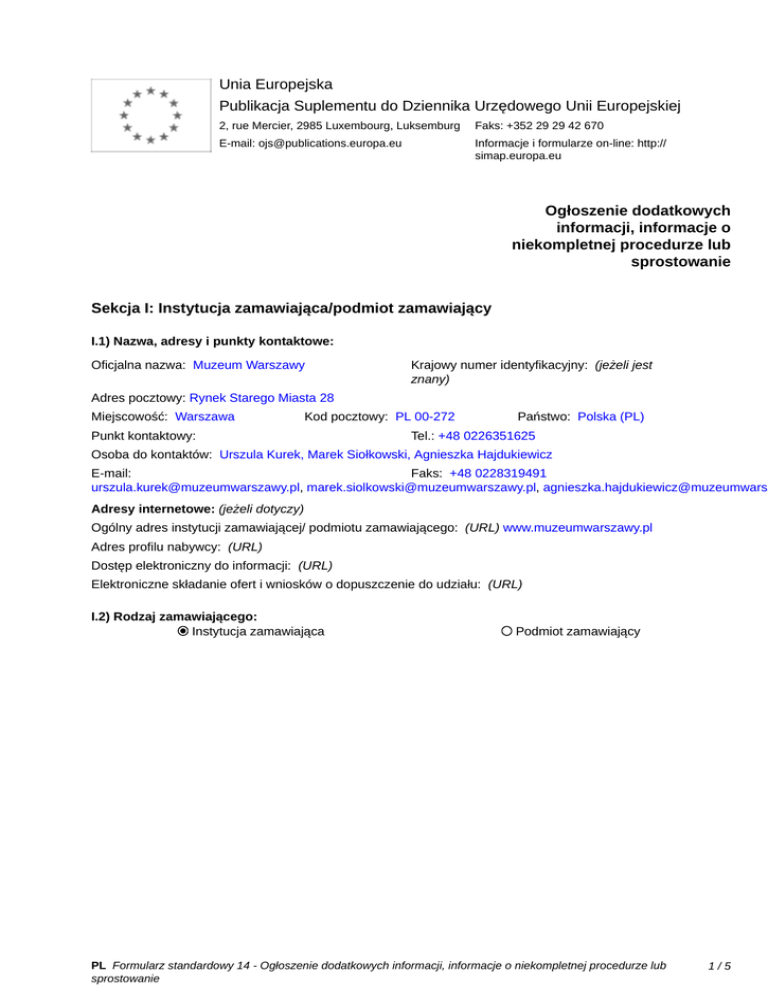 Unia Europejska Publikacja Suplementu do Dziennika Urzędowego Unii Europejskiej 2, rue Mercier, 2985 Luxembourg, Luksemburg Faks: +352 29 29 42 670 E-mail: [email protected] Informacje i formularze on-line: http:// simap.europa.eu Ogłoszenie dodatkowych informacji, informacje o niekompletnej procedurze lub sprostowanie Sekcja I: Instytucja zamawiająca/podmiot zamawiający I.1) Nazwa, adresy i punkty kontaktowe: Oficjalna nazwa: Muzeum Warszawy Krajowy numer identyfikacyjny: (jeżeli jest znany) _____ Adres pocztowy: Rynek Starego Miasta 28 Miejscowość: Warszawa Kod pocztowy: PL 00-272 Punkt kontaktowy: _____ Państwo: Polska (PL) Tel.: +48 0226351625 Osoba do kontaktów: Urszula Kurek, Marek Siołkowski, Agnieszka Hajdukiewicz E-mail: Faks: +48 0228319491 [email protected], [email protected], agnieszka.hajdukiewicz@muzeumwars Adresy internetowe: (jeżeli dotyczy) Ogólny adres instytucji zamawiającej/ podmiotu zamawiającego: (URL) www.muzeumwarszawy.pl Adres profilu nabywcy: (URL) _____ Dostęp elektroniczny do informacji: (URL) _____ Elektroniczne składanie ofert i wniosków o dopuszczenie do udziału: (URL) _____ I.2) Rodzaj zamawiającego: Instytucja zamawiająca Podmiot zamawiający PL Formularz standardowy 14 - Ogłoszenie dodatkowych informacji, informacje o niekompletnej procedurze lub sprostowanie 1/5 Sekcja II: Przedmiot zamówienia II.1.1) Nazwa nadana zamówieniu: Konkurs na opracowanie koncepcji plastyczno-przestrzennej sal ekspozycyjnych wystawy głównej Muzeum Warszawy II.1.2) Krótki opis zamówienia lub zakupu: (podano w pierwotnym ogłoszeniu) Przedmiotem Konkursu jest wyłonienie Wykonawcy koncepcji plastyczno-przestrzennej wystawy głównej Muzeum Warszawy przy Rynku Starego Miasta w Warszawie. II.1.3) Wspólny Słownik Zamówień (CPV) Główny przedmiot Dodatkowe przedmioty Słownik główny 79421200 79930000 Słownik uzupełniający (jeżeli dotyczy) PL Formularz standardowy 14 - Ogłoszenie dodatkowych informacji, informacje o niekompletnej procedurze lub sprostowanie 2/5 Sekcja IV: Procedura IV.1)Rodzaj procedury (podano w pierwotnym ogłoszeniu) Otwarta Ograniczona Ograniczona przyspieszona Negocjacyjna Negocjacyjna przyspieszona Dialog konkurencyjny Negocjacyjna z uprzednim ogłoszeniem Negocjacyjna bez uprzedniego ogłoszenia Negocjacyjna z publikacją ogłoszenia o zamówieniu Negocjacyjna bez publikacji ogłoszenia o zamówieniu Udzielenie zamówienia bez uprzedniej publikacji ogłoszenia o zamówieniu w Dzienniku Urzędowym Unii Europejskiej IV.2)Informacje administracyjne IV.2.1)Numer referencyjny: (podano w pierwotnym ogłoszeniu) _____ IV.2.2)Dane referencyjne ogłoszenia w przypadku ogłoszeń przesłanych drogą elektroniczną: Pierwotne ogłoszenie przesłane przez eNotices TED eSender Login: ENOTICES_Muzeum Dane referencyjne ogłoszenia: 2014-136486 rok i numer dokumentu IV.2.3)Ogłoszenie, którego dotyczy niniejsza publikacja: Numer ogłoszenia w Dz.U.: 2014/S 201-355803 z dnia: 18/10/2014 (dd/mm/rrrr) IV.2.4)Data wysłania pierwotnego ogłoszenia: 15/10/2014 (dd/mm/rrrr) PL Formularz standardowy 14 - Ogłoszenie dodatkowych informacji, informacje o niekompletnej procedurze lub sprostowanie 3/5 Sekcja VI: Informacje uzupełniające VI.1) Ogłoszenie dotyczy: Procedury niepełnej Sprostowania Informacji dodatkowych VI.2) Informacje na temat niepełnej procedury udzielenia zamówienia: Postępowanie o udzielenie zamówienia zostało przerwane Postępowanie o udzielenie zamówienia uznano za nieskuteczne Zamówienia nie udzielono Zamówienie może być przedmiotem ponownej publikacji VI.3) Informacje do poprawienia lub dodania : VI.3.1) Zmiana oryginalnej informacji podanej przez instytucję zamawiającą Publikacja w witrynie TED niezgodna z oryginalną informacją, przekazaną przez instytucję zamawiającą Oba przypadki VI.3.2) W ogłoszeniu pierwotnym W odpowiedniej dokumentacji przetargowej (więcej informacji w odpowiedniej dokumentacji przetargowej) W obu przypadkach (więcej informacji w odpowiedniej dokumentacji przetargowej) VI.3.3) Tekst, który należy poprawić w pierwotnym ogłoszeniu Miejsce, w którym znajduje się Zamiast: Powinno być: zmieniany tekst: 1. Sąd Konkursowy przeznacza 1. Sąd Konkursowy przeznacza IV.5.1) na nagrody kwotę 220 000 PLN na nagrody kwotę 220 000 zł netto netto(słownie: dwieście tysięcy i (słownie: dwieście dwadzieścia siedemdziesiąt tysięcy złotych netto). tysięcy złotych netto). 2. Wysokość nagród wyniesie: 2. Wysokość nagród wyniesie: — I nagroda – 65 000 PLN netto I nagroda - 65 000 zł netto (słownie: (słownie: sześćdziesiąt pięć tysięcy sześćdziesiąt pięć tysięcy złotych złotych netto), netto) — II nagroda – 40 000 PLN netto II nagroda - 40 000 zł netto (słownie: (słownie: czterdzieści tysięcy złotych czterdzieści tysięcy złotych netto) netto), III nagroda - 32 000 zł netto (słownie: — III nagroda – 32 000 PLN netto trzydzieści dwa tysiące złotych netto) (słownie: trzydzieści dwa tysiące 3. Łączna suma przyznanych złotych netto). wyróżnień wyniesie łącznie do 83 3. Łączna suma przyznanych 000 zł netto (słownie: osiemdziesiąt wyróżnień wyniesie łącznie do 83 trzy tysiące złotych netto) z czego 000 zł netto (słownie: osiemdziesiąt każde z wyróżnień nie przekroczy trzy tysiące złotych netto) z czego kwoty 32 000 zł netto (słownie: każde z wyróżnień nie przekroczy trzydzieści dwa tysiące złotych kwoty 32 000 PLN netto (słownie: netto). trzydzieści tysięcy złotych netto). VI.3.4) Daty, które należy poprawić w pierwotnym ogłoszeniu Miejsce, w którym znajdują się Zamiast: zmieniane daty: Powinno być: PL Formularz standardowy 14 - Ogłoszenie dodatkowych informacji, informacje o niekompletnej procedurze lub sprostowanie 4/5 VI.3.5) Adresy i punkty kontaktowe, które należy poprawić VI.3.6) Tekst, który należy dodać do pierwotnego ogłoszenia Miejsce, w którym należy dodać tekst: T