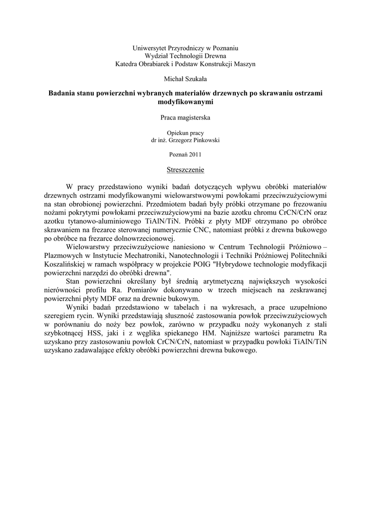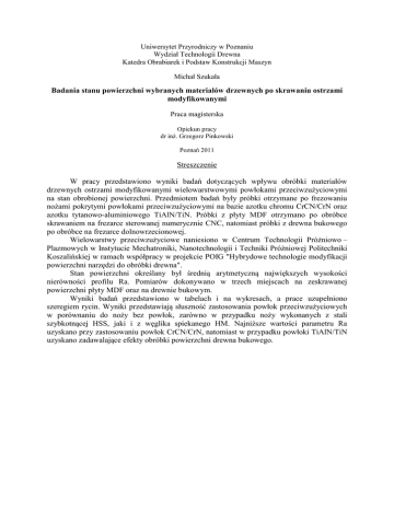 Uniwersytet Przyrodniczy w Poznaniu Wydział Technologii Drewna Katedra Obrabiarek i Podstaw Konstrukcji Maszyn Michał Szukała Badania stanu powierzchni wybranych materiałów drzewnych po skrawaniu ostrzami modyfikowanymi Praca magisterska Opiekun pracy dr inż. Grzegorz Pinkowski Poznań 2011 Streszczenie W pracy przedstawiono wyniki badań dotyczących wpływu obróbki materiałów drzewnych ostrzami modyfikowanymi wielowarstwowymi powłokami przeciwzużyciowymi na stan obrobionej powierzchni. Przedmiotem badań były próbki otrzymane po frezowaniu nożami pokrytymi powłokami przeciwzużyciowymi na bazie azotku chromu CrCN/CrN oraz azotku tytanowo-aluminiowego TiAlN/TiN. Próbki z płyty MDF otrzymano po obróbce skrawaniem na frezarce sterowanej numerycznie CNC, natomiast próbki z drewna bukowego po obróbce na frezarce dolnowrzecionowej. Wielowarstwy przeciwzużyciowe naniesiono w Centrum Technologii Próżniowo – Plazmowych w Instytucie Mechatroniki, Nanotechnologii i Techniki Próżniowej Politechniki Koszalińskiej w ramach współpracy w projekcie POIG "Hybrydowe technologie modyfikacji powierzchni narzędzi do obróbki drewna". Stan powierzchni określany był średnią arytmetyczną największych wysokości nierówności profilu Ra. Pomiarów dokonywano w trzech miejscach na zeskrawanej powierzchni płyty MDF oraz na drewnie bukowym. Wyniki badań przedstawiono w tabelach i na wykresach, a prace uzupełniono szeregiem rycin. Wyniki przedstawiają słuszność zastosowania powłok przeciwzużyciowych w porównaniu do noży bez powłok, zarówno w przypadku noży wykonanych z stali szybkotnącej HSS, jaki i z węglika spiekanego HM. Najniższe wartości parametru Ra uzyskano przy zastosowaniu powłok CrCN/CrN, natomiast w przypadku powłoki TiAlN/TiN uzyskano zadawalające efekty obróbki powierzchni drewna bukowego.