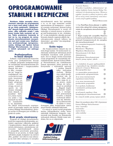 Miros³aw Czerwieñski OPROGRAMOWANIE STABILNE I BEZPIECZNE Każdemu chyba zarządcy nieruchomości zdarzyło się przynajmniej raz w życiu rwać włosy z głowy, kiedy po wielu godzinach „wklepywania” danych nagle zawiesił się komputer, albo zabrakło prądu i całą pracę trzeba było zaczynać od nowa. Takie prozaiczne momenty to test na to, czy program do zarządzania nieruchomościami rzeczywiście jest wart swojej ceny. Użytkownicy profesjonalnego oprogramowania, takiego jak System Łatwej Obsługi Nieruchomości, nie utracą w takich sytuacjach ani jednego wpisu. Profesjonalizm to baza danych Jednym z najważniejszych kryteriów oceny przy podejmowaniu decyzji o zakupie programu komputerowego do zarządzania nieruchomościami jest sprawa stabilności i bezpieczeństwa danych. Ich utrata albo „rozsypanie się” mogą zarządzających nieruchomościami wiele kosztować. Dlatego przy zakupie programu trzeba zwrócić uwagę, czy jest on oparty na tak zwanej relacyjnej bazie danych, na przykład Sybase’a, który wyznacza jeden z najwyższych na świecie standardów w tej dziedzinie. Na takich nowoczesnych rozwiązaniach od początku oparty jest System Łatwej Obsługi Nieruchomości, którego wersja 4.0 dostępna jest od kilku tygodni na rynku. Brak pr¹du niestraszny Program do obsługi nieruchomości, jeżeli jest naprawdę profesjonalny, powinien zapewniać całkowitą spójność i bezpieczeństwo danych poprzez, jak mówią informatycy, automatyczne odwracanie wprowadzonych zmian w przypadku przerwania procedury. Oznacza to po prostu, że kiedy nagle zabraknie prądu, komputer się zawiesi albo „padnie” sieć (ileż to razy zdarzają się nam takie sytuacje), to zarządca ADMINISTRATOR 6/2004 nieruchomości może być spokojny o to, co do tego momentu zostało wprowadzone do komputera – wszystko zostanie zachowane. System Łatwej Obsługi Nieruchomości w wersji 4.0 wykazuje w testach jeszcze tę przewagę nad konkurencją, że nie „wyskakują” w nim dodatkowe okienka porządkowania danych, naprawy plików itp. – zabezpieczanie danych odbywa się skutecznie i „po cichu”, bez niepokojenia użytkownika. Œciœle tajne Ale bezpieczeństwo danych ma też swój drugi wymiar. To konieczność zachowania niektórych informacji przed wścibskim wzrokiem osób postronnych. Jest to drugie istotne kryterium oceny programów do zarządzania nieruchomościami. System Łatwej Obsługi Nieruchomości ma rozbudowany system uprawnień, który pozwala na korzystanie z wybranych operacji i analizy danych tylko wybranym osobom. Można więc całość skonfigurować tak, by tylko kilka osób, które mają do tego prawo, miało dostęp do informacji na przykład o długach współwłaścicieli wspólnoty, o szczegółach ponoszonych kosztów, o danych osobowych właściciela itp. Informacje są umieszczane na dysku w zaszyfrowanym pliku bezpiecznym nawet przed bardzo zdolnymi hakerami. Co więcej w nowej wersji programu można zidentyfikować osoby, które zmieniały dokumenty księgowe, rejestrowały stan licznika czy dokonywały wybranych obliczeń. Dzięki temu wiadomo, kto za co odpowiada. Szanowni Pañstwo, Wszystkim Czytelnikom „Administratora” oferujemy bezp³atnie System £atwej Obs³ugi Nieruchomoœci do dwumiesiêcznej pracy. Wystarczy wype³niæ i przes³aæ tê ankietê na poni¿szy adres lub na naszej stronie internetowej: www.mieszczanin.com.pl wype³niæ podobn¹. Micha³ Mieszczanin 1. Czy Pani/Pana firma planuje w najbli¿szym roku zakup lub zmianê oprogramowania do zarz¹dzania nieruchomoœciami? a) Tak o b) Nie o 2. Sk¹d czerpi¹ lub czerpaliby Pañstwo w pierwszej kolejnoœci informacje o programach komputerowych do zarz¹dzania nieruchomoœciami? a) z czasopism/magazynów bran¿owych: Facility Manager o Mieszkanie i Wspólnota o Wspólnota Mieszkaniowa o Nieruchomoœci C.H. Beck o Administrator o Zarz¹dzanie Nieruchomoœciami o innych, proszê wpisaæ, jakich: ………… ……………………..………………… b) z dodatków do gazet ogólnopolskich i regionalnych (np. dodatków mieszkaniowych w Gazecie Wyborczej, Rzeczpospolitej itp.) o c) z materia³ów promocyjnych producentów oprogramowania o d) ze stron internetowych organizacji naszej bran¿y o e) ze stron internetowych producentów programów o f) ze spotkañ, konferencji i seminariów poœwiêconych tej tematyce o g) od innych wspólnot i firm zarz¹dzaj¹cych nieruchomoœciami o h) z innych Ÿróde³, proszê wpisaæ jakich: ................................................................. ................................................................. Dane do przes³ania p³yty CD z Systemem £atwej Obs³ugi Nieruchomoœci: imiê i nazwisko: . . . . . . . . . . . . . . . . . stanowisko: . . . . . . . . . . . . . . . . . . . . . nazwa firmy: . . . . . . . . . . . . . . . . . . . . adres siedziby: . . . . . . . . . . . . . . . . . . . .............................. telefon: . . . . . . . . . . . . . . . . . . . . . . . . e-mail: . . . . . . . . . . . . . . . . . . . . . . . . . 29