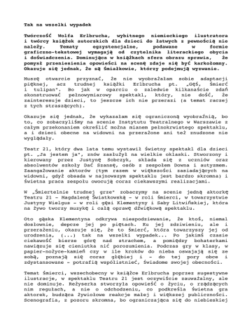 Tak na wszelki wypadek Twórczość Wolfa Erlbrucha, wybitnego niemieckiego ilustratora i twórcy książek autorskich dla dzieci do łatwych z pewnością nie należy. Tematy egzystencjalne, podawane w formie graficznotekstowej wymagają od czytelnika literackiego obycia i doświadczenia. Dominująca w książkach sfera obrazu sprawia, że pomysł przeniesienia opowieści na scenę zdaje się być karkołomny. Okazuje się jednak, że są śmiałkowie, którzy podejmują wyzwanie. Muszę otwarcie przyznać, że nie wyobrażałam sobie adaptacji pięknej, acz trudnej książki Erlbrucha pt. „Gęś, śmierć i tulipan". Bo jak w oparciu o zaledwie kilkanaście zdań skonstruować pełnowymiarowy spektakl, który, nie dość, że zainteresuje dzieci, to jeszcze ich nie przerazi (a temat raczej z tych straszących). Okazuje się jednak, że wykazałam się ograniczoną wyobraźnią, bo to, co zobaczyliśmy na scenie Instytutu Teatralnego w Warszawie z całym przekonaniem określić można mianem pełnokrwistego spektaklu, a i dzieci obecne na widowni na przerażone ani też znudzone nie wyglądały. Teatr 21, który dwa lata temu wystawił świetny spektakl dla dzieci pt. „Ja jestem ja", znów zasłużył na wielkie oklaski. Stworzony i kierowany przez Justynę Sobczyk, składa się z uczniów oraz absolwentów szkoły Dać Szansę, osób z zespołem Downa i autyzmem. Zaangażowanie aktorów (tym razem w większości zasiadających na widowni, gdyż obsada w najnowszym spektaklu jest bardzo skromna) i świetna praca zespołu owocują coraz ciekawszymi realizacjami. W „Śmiertelnie trudnej grze" zobaczymy na scenie jedną aktorkę Teatru 21 Magdalenę Światkowską w roli śmierci, w towarzystwie Justyny Wielgus w roli gęsi Klementyny i Saby Litwińskiej, która na żywo tworzy muzykę i całą oprawę dźwiękową spektaklu. Oto gąska Klementyna odkrywa niespodziewanie, że ktoś, niemal dosłownie, depcze jej po piętach. Ku jej zdziwieniu, ale i przerażeniu, okazuje się, że to śmierć, która towarzyszy jej od urodzenia, (...) tak na wszelki wypadek... Po jakimś czasie ciekawość bierze górę nad strachem, a pomiędzy bohaterkami nawiązuje się cieniutka nić porozumienia. Podczas gry w klasy, w papiernożycekamień czy w ile kroków do nieba oswajają się ze sobą, poznają się coraz głębiej i do tej pory obce i zdystansowane potrafią współistnieć, świadome swojej obecności. Temat śmierci, wszechobecny w książce Erlbrucha poprzez sugestywne ilustracje, w spektaklu Teatru 21 jest oczywiście zauważalny, ale nie dominuje. Reżyserka stworzyła opowieść o życiu, o rządzących nim regułach, a nie o odchodzeniu, co podkre śla świetna gra aktorek, budząca żywiołowe reakcje małej i większej publiczności. Scenografia, z pozoru skromna, bo ograniczająca si ę do niebieskiej tkaniny, spływającej swobodnie z sufitu na podłogę, okazała si ę bardzo przemyślaną, zapierającą dech w piersiach konstrukcją, która w jednej chwili (dzięki zaangażowaniu małej publiczności) przeistoczyła się w falujący staw. Ważnym elementem spektaklu jest także oprawa dźwiękowa, tworzona na żywo z wykorzystaniem instrumentów, ale też wody, słomki i kieliszków. Całość, zagrana w kameralnych wnętrzach Instytutu Teatralnego, przy pełnej sali, zrobiła na wszystkich ogromne wrażenie. Zachwycone, a równocześnie zaintrygowane dzieci jeszcze długo po tym, jak wybrzmiały oklaski (a brzmiały naprawdę długo), nie przestawały zadawać pytań. To dowód na to, iż twórcom udało się doskonale trafić w dziecięcą wrażliwość, rozbudzić ciekawość, skłonić do przemyśleń i szukania odpowiedzi. Czego chcieć więcej?! Gorąco polecam! Ewa Świerżewska, fot. Marta Ankiersztejn