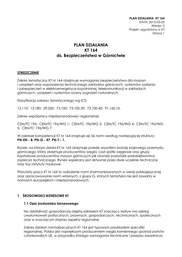 PLAN DZIAŁANIA KT 164 DATA: 2015-03-02 Wersja: 2 Projekt uzgodniony w KT Strona 1 PLAN DZIAŁANIA KT 164 ds. Bezpieczeństwa w Górnictwie STRESZCZENIE Zakres tematyczny KT nr 164 obejmuje wymagania bezpieczeństwa dla maszyn i urządzeń oraz wyposażenia technicznego zakładów górniczych, systemów zasilania i zabezpieczeń w elektroenergetyce kopalnianej, telekomunikacji w zakładach górniczych, urządzeń i systemów oceny zagrożeń naturalnych. Klasyfikacja zakresu tematycznego wg ICS: 13.110; 13.180; 29.020; 73.100; 73.100.20; 73.100.40; 91.160.10. Zakres współpracy międzynarodowej i regionalnej: CEN/TC 196; CEN/TC 196/WG 1; CEN/TC 196/WG 3; CEN/TC 196/WG 4; CEN/TC 196/WG 5; CEN/TC 196/WG 7. W zakresie kompetencji KT nr 164 znajduje się 56 norm według następującej struktury: PN-EN - 8, PN-G - 47, PN-T - 1. Rynek, na którym działa KT nr 164 obejmuje przede wszystkim branżę krajowego przemysłu górniczego, która obejmuje producentów węgla, czyli spółki węglowe oraz grupy kapitałowe producentów maszyn górniczych jak również pozostałe przedsiębiorstwa zaplecza technicznego. Rynek wspierany jest aktywnie przez dwie uczelnie techniczne oraz trzy instytuty naukowe. Priorytety pracy KT nr 164 to wdrożenie norm zharmonizowanych w wersji polskojęzycznej oraz opracowywanie norm własnych, z grupy G, których tematyka nie jest zawarta w normach europejskich i międzynarodowych. 1 ŚRODOWISKO BIZNESOWE KT 1.1 Opis środowiska biznesowego Na działalność gospodarczą objętą zakresem KT znaczący wpływ ma szereg uwarunkowań politycznych, prawnych, gospodarczych, technicznych, społecznych oraz w znaczącym stopniu aspekty regionalne. Zakres działań normalizacyjnych KT 164 jest typowym przykładem specyfiki regionalnej. Polska jest największym producentem węgla kamiennego spośród państw członkowskich UE, w przypadku którego wymagania techniczne i przepisy zasadniczo PLAN DZIAŁANIA KT 164 DATA: 2015-03-02 Wersja: 2 Projekt uzgodniony w KT Strona 2 odbiegają od standaryzacji poszczególnych krajów europejskich, w związku z czym zachodzi konieczność tworzenia krajowych uregulowań. 1.1.1 Uwarunkowania polityczne i prawne Polska jako członek Unii Europejska zobowiązana jest do otwartego rynku pomiędzy krajami Wspólnoty, co spowodowało zmiany w zasadach wprowadzania i stosowania maszyn, urządzeń w zakładach górniczych, czego konsekwencją były zmiany wprowadzone m.in. w Ustawie z dnia 9 czerwca 2011 r. Prawo geologiczne i górnicze (Dziennik Ustaw Nr 163 Poz. 981). Zgodnie z wymaganiami przepisów zawartych w ww. ustawie, w zakładach górniczych mogą być stosowane wyroby: spełniające wymagania zasadnicze, określone w ustawie z dnia 30 sierpnia 2002 r. o systemie oceny zgodności (Dz.U. 2002 nr 166 poz. 1360 - tekst jednolity) dopuszczone do stosowania w zakładach górniczych, po potwierdzeniu, że wyrób spełnia wymagania techniczne, w drodze decyzji Prezesa Wyższego Urzędu Górniczego (system dopuszczeń), oraz pozostałe wyroby z tzw. obszaru niezharmonizowanego. Procedura dopuszczeniowa znajduje zastosowanie do wyrobów wymienionych w Załączniku nr 1 do rozporządzenia Rady Ministrów z dnia 30 kwietnia 2004 r. i przeznaczonych do stosowania w zakładach górniczych (Dz.U. 2004 Nr 99 poz. 1003 ). Analiza wskazuje, że wyroby stosowane w górnictwie podlegają około 10 dyrektywom, z czego jedna - 2006/42/WE- związana jest zakresem działania KT 164 i implementuje 7 norm zharmonizowanych. Na działalność i zakres opracowań KT 164 mają zatem wpływ ww. przepisy, a szczególnie tryb dopuszczeń prezesa Wyższego Urzędu Górniczego. Ponieważ w przeciwieństwie do innych gałęzi przemysłu w branży maszyn górniczych, norm zharmonizowanych jest stosunkowo niewiele i nie obejmują one wszystkich aspektów bezpieczeństwa związanych z górnictwem, dla wykazania zgodności z zasadniczymi wymaganiami bezpieczeństwa, krajowy producent często stosuje również Polskie normy własne typu G. W sytuacji braku norm europejskich, dla określonych grup wyrobów z branży górniczej w celu uniknięcia rozbieżnych interpretacji zasadnym jest zdefiniowanie jednolitych wymagań na poziomie krajowym, a tym samym stworzenie warunków sprzyjających rozwojowi tego obszaru normalizacji gdy wszystkie zainteresowane strony posługują się tymi samymi zasadami. W Polsce w branży górniczej wielu odbiorców w dalszym ciągu preferuje potwierdzenie bezpieczeństwa wyrobu przez jednostkę niezależną. Zaobserwowano w związku z tym tendencję powrotu niektórych producentów do certyfikacji swoich wyrobów na znak bezpieczeństwa "B" lub na zgodność z normami własnymi typu G. PLAN DZIAŁANIA KT 164 DATA: 2015-03-02 Wersja: 2 Projekt uzgodniony w KT Strona 3 1.1.2 Uwarunkowania gospodarcze Działania KT 164 są ukierunkowane na zapewnienie jednolitych wymagań bezpieczeństwa w zakresie konstrukcji maszyn i urządzeń na rzecz całego górnictwa, które reprezentowane jest przez takie najważniejsze podmioty gospodarcze jak: Jastrzębska Spółka Węglowa, Katowicki Holding Węglowy, Kompania Węglowa, Lubelski Węgiel Bogdanka, Południowy Koncern Węglowy, Grupy kapitałowe takie jak: Grupa Famur, Grupa Fasing , Grupa Kopex oraz przez jednostki notyfikowane i jednostki certyfikujące wyroby i akredytowane laboratoria badawcze takie jak: Główny Instytut Górnictwa Instytut Techniki Górniczej KOMAG Instytutu Technik Innowacyjnych EMAG Ośrodek Badan Atestacji I Certyfikacji OBAC SP. Z.O.O. Jednostka Opiniująca, Atestująca I Certyfikująca Wyroby TEST SP. Z O.O. Centrum Badań i Dozoru Górnictwa Podziemnego Sp. z o.o. 1.1.3 Uwarunkowania społeczne Działania KT 164 są ukierunkowane przede wszystkim na bezpieczeństwo pracy, co zgodne jest ze „Strategią działania urzędów górniczych na lata 2010 – 2014.” Wszelkie formułowane wymagania ukierunkowywane są na poprawę jakości i bezpieczeństwa pracy. 1.1.4 Uwarunkowania na