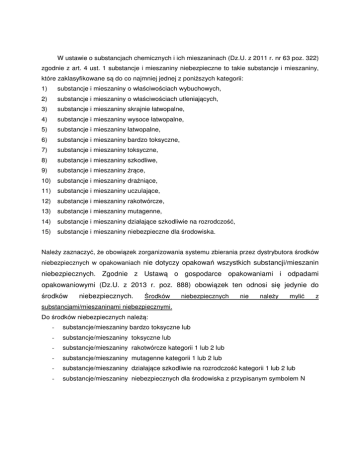 W ustawie o substancjach chemicznych i ich mieszaninach (Dz.U. z 2011 r. nr 63 poz. 322) zgodnie z art. 4 ust. 1 substancje i mieszaniny niebezpieczne to takie substancje i mieszaniny, które zaklasyfikowane są do co najmniej jednej z poniższych kategorii: 1) substancje i mieszaniny o właściwościach wybuchowych, 2) substancje i mieszaniny o właściwościach utleniających, 3) substancje i mieszaniny skrajnie łatwopalne, 4) substancje i mieszaniny wysoce łatwopalne, 5) substancje i mieszaniny łatwopalne, 6) substancje i mieszaniny bardzo toksyczne, 7) substancje i mieszaniny toksyczne, 8) substancje i mieszaniny szkodliwe, 9) substancje i mieszaniny żrące, 10) substancje i mieszaniny drażniące, 11) substancje i mieszaniny uczulające, 12) substancje i mieszaniny rakotwórcze, 13) substancje i mieszaniny mutagenne, 14) substancje i mieszaniny działające szkodliwie na rozrodczość, 15) substancje i mieszaniny niebezpieczne dla środowiska. Należy zaznaczyć, że obowiązek zorganizowania systemu zbierania przez dystrybutora środków niebezpiecznych w opakowaniach nie dotyczy opakowań wszystkich substancji/mieszanin niebezpiecznych. Zgodnie z Ustawą o gospodarce opakowaniami i odpadami opakowaniowymi (Dz.U. z 2013 r. poz. 888) obowiązek ten odnosi się jedynie do środków niebezpiecznych. Środków niebezpiecznych nie należy mylić substancjami/mieszaninami niebezpiecznymi. Do środków niebezpiecznych należą: - substancje/mieszaniny bardzo toksyczne lub - substancje/mieszaniny toksyczne lub - substancje/mieszaniny rakotwórcze kategorii 1 lub 2 lub - substancje/mieszaniny mutagenne kategorii 1 lub 2 lub - substancje/mieszaniny działające szkodliwie na rozrodczość kategorii 1 lub 2 lub - substancje/mieszaniny niebezpiecznych dla środowiska z przypisanym symbolem N z lub substancje/mieszaniny zaklasyfikowane na podstawie przepisów rozporządzenia Parlamentu Europejskiego i Rady (WE) nr 1272/2008 z dnia 16 grudnia 2008 r. w sprawie klasyfikacji, oznakowania i pakowania substancji i mieszanin, zmieniającego i uchylającego dyrektywy 67/548/EWG i 1999/45/WE oraz zmieniającego rozporządzenie (WE) nr 1907/2006 (Dz. Urz. UE L 353 z 31.12.2008, str. 1): - w klasie toksyczności ostrej w kategorii 1, 2 lub 3 lub - rakotwórcze kategorii 1A lub 1B lub - mutagenne kategorii 1A lub 1B lub - działające szkodliwie na rozrodczość kategorii 1A lub 1B lub - stwarzające zagrożenie dla środowiska wodnego ze względu na toksyczność ostrą w kategorii 1 lub ze względu na toksyczność przewlekłą w kategorii 1 i 2. Jak można rozpoznać czy dana substancja/mieszanina należy do jednej z ww. kategorii W Rozporządzeniu Ministra Zdrowia z dnia 10 sierpnia 2012 r. w sprawie kryteriów i sposobu klasyfikacji substancji chemicznych i ich mieszanin zostały określone szczegółowo kryteria i sposoby klasyfikacji substancji i mieszanin chemicznych, zgodnie z którymi substancje/mieszaniny klasyfikowane jako bardzo toksyczne, toksyczne, rakotwórcze kategorii 1 lub 2, mutagenne kategorii 1 lub 2, działające szkodliwie na rozrodczość kategorii 1 lub 2 i szkodliwe dla środowiska mają następujące oznakowanie: • Substancje/mieszaniny bardzo toksyczne: T+ oraz co najmniej jedno z oznaczeń: R26, R27, R28, R39, R39/26, R39/27, R39/28, R39/26/27, R39/26/28, R39/27/28 lub R39/26/27/28. • Substancje/mieszaniny toksyczne: symbol T oraz co najmniej jedno z oznaczeń: R23, R24, R25, R39, R48, R39/23, R39/24, R39/25, R39/23/24, R39/23/25, R39/24/25, R39/23/24/25, R48/23, R48/24, R48/25, R48/23/24, R48/23/25, R48/24/25 lub R48/23/24/25. • Substancje/mieszaniny rakotwórcze kategorii 1 lub 2: symbol T oraz co najmniej jedno z oznaczeń R45 lub R49. • Substancje/mieszaniny mutagenne kategorii 1 lub 2: symbol T oraz oznaczenie R46. • Substancje/mieszaniny działające szkodliwie na rozrodczość kategorii 1 lub 2: symbol T oraz co najmniej jedno z oznaczeń R60 lub R61. • Substancje/mieszaniny niebezpieczne dla środowiska: symbol N oraz co najmniej jedno z oznaczeń R50, R52, R53, R54, R55, R56, R57, R58, R59, R50-53, R51-53 lub R52-53. Substancje/mieszaniny należące do środków niebezpiecznych, zaklasyfikowane według rozporządzenia Parlamentu Europejskiego i Rady (WE) nr 1272/2008 mają następujące oznakowanie: Tabele zaczerpnięto z rozporządzenia (WE) nr 1272/2008: Ze względu na błędy w Tabeli 3.1.3. w wersji polskiej ww. rozporządzenia poniżej przytaczamy tabelę z wersji angielskiej ww. rozporządzenia: