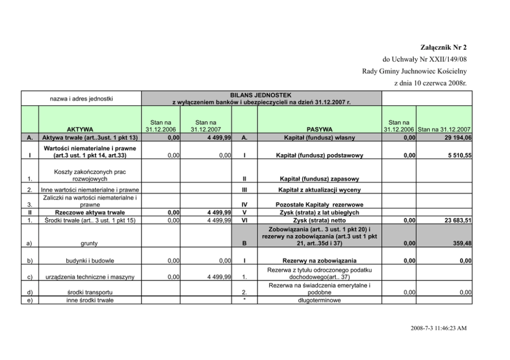 Załącznik Nr 2 do Uchwały Nr XXII/149/08 Rady Gminy Juchnowiec Kościelny z dnia 10 czerwca 2008r. nazwa i adres jednostki BILANS JEDNOSTEK z wyłączeniem banków i ubezpieczycieli na dzień 31.12.2007 r. A. AKTYWA Aktywa trwałe (art..3ust. 1 pkt 13) Stan na 31.12.2006 0,00 Stan na 31.12.2007 4 499,99 I Wartości niematerialne i prawne (art.3 ust. 1 pkt 14, art.33) 0,00 0,00 1. Koszty zakończonych prac rozwojowych 2. 3. II 1. Inne wartości niematerialne i prawne Zaliczki na wartości niematerialne i prawne Rzeczowe aktywa trwałe Środki trwałe (art.. 3 ust. 1 pkt 15) 0,00 0,00 4 499,99 4 499,99 A. PASYWA Kapitał (fundusz) własny I Kapitał (fundusz) podstawowy II Kapitał (fundusz) zapasowy III Kapitał z aktualizacji wyceny IV V VI Stan na 31.12.2006 Stan na 31.12.2007 0,00 29 194,06 0,00 5 510,55 Pozostałe Kapitały rezerwowe Zysk (strata) z lat ubiegłych Zysk (strata) netto 0,00 23 683,51 B Zobowiązania (art.. 3 ust. 1 pkt 20) i rezerwy na zobowiązania (art.3 ust 1 pkt 21, art..35d i 37) 0,00 359,48 Rezerwy na zobowiązania 0,00 0,00 0,00 0,00 a) grunty b) budynki i budowle 0,00 0,00 I c) urządzenia techniczne i maszyny 0,00 4 499,99 1. d) e) środki transportu inne środki trwałe 2. * Rezerwa z tytułu odroczonego podatku dochodowego(art.. 37) Rezerwa na świadczenia emerytalne i podobne długoterminowe 2008-7-3 11:46:23 AM nazwa i adres jednostki AKTYWA BILANS JEDNOSTEK z wyłączeniem banków i ubezpieczycieli na dzień 31.12.2007 r. Stan na 31.12.2006 Stan na 31.12.2007 PASYWA * krótkoterminowe 2. Środki trwałe w budowie (art.. 3 ust. 1 pkt 16) 3. Pozostałe rezerwy 3. zaliczki na środki trwałe w budowie * długoterminowe * krótkoterminowe II 1. a) Zobowiązania długoterminowe wobec pozostałych jednostek kredyty i pożyczki Z tytułu emisji dłużnych papierów wartosciowych III 1. 2. Długoterminowe rozliczenia międzyokresowe Aktywa z tytułu odroczonego podatku dochodowego (art.. 37) inne rozliczenia międzyokresowe 0,00 0,00 b) B. I Aktywa obrotowe (art.. 3 ust. 1 pkt 18) Zapasy 1. 2. 3. Materiały Półprodukty i produkty w toku Produkty gotowe 4. 5. Towary Zaliczki na poczet dostaw Należności krótkoterminowe (art.. 3 ust. 1 pkt 18c) Należności od pozostałych jednostek II 1. 0,00 0,00 0,00 0,00 25 053,55 0,00 51,40 51,40 c) d) III 1. a) b) c) * inne zobowiązania finansowe inne Zobowiązania krótkoterminowe (art. 3 ust. 1 pkt 22) Wobec pozostałych jednostek Kredyty i pożyczki inne zobowiązania finansowe zobowiązania z tytułu dostaw: do 12 miesięcy * d) powyżej 12 miesięcy zaliczki otrzymane na dostawy Stan na 31.12.2006 Stan na 31.12.2007 0,00 0,00 0,00 0,00 0,00 0,00 0,00 0,00 359,48 359,48 0,00 0,00 359,48 359,48 2008-7-3 11:46:23 AM nazwa i adres jednostki a) b) c) d) III 1. a) * b) * * * 2. IV AKTYWA Z tytułu dostaw i usług o okresie spłaty do 12 miesięcy Z tytułu podatków, dotacji, ceł, ubezpieczeń społecznych i zdrowotnych oraz innych świadczeń inne Dochodzone na drodze sądowej Inwestycje krótkoterminowe (art.. 3 ust. 1 pkt 17 i 18b) Krótkoterminowe aktywa finansowe w pozostałych jednostkach inne krótkoterminowe aktywa finansowe środki pieniężne i inne aktywa pieniężne Środki pieniężne w kasie i na rachunkach inne środki pieniężne inne aktywa pieniężne Inne inwestycje krótkoterminowe Krótkoterminowe rozliczenia międzyokresowe Suma aktywów BILANS JEDNOSTEK z wyłączeniem banków i ubezpieczycieli na dzień 31.12.2007 r. Stan na 31.12.2006 0,00 Stan na 31.12.2007 51,40 PASYWA e) zobowiązania wekslowe f) g) h) z tytułu podatków, ceł, ubezpieczeń i innych świadczeń z tytułu wynagrodzeń inne 0,00 0,00 25 002,15 25 002,15 2. IV 0,00 0,00 1. fundusze specjalne Rozliczenia międzyokresowe Inne rozliczenia międzyokresowe (art.. 39 ust. 2, art.. 41) * długoterminowe * krótkoterminowe 0,00 25 002,15 0,00 25 002,15 0,00 29 553,54 Suma pasywów Stan na 31.12.2006 Stan na 31.12.2007 0,00 0,00 0,00 0,00 0,00 0,00 0,00 0,00 0,00 29 553,54 2008-7-3 11:46:23 AM GMINNA BIBLIOTEKA PUBLICZNA W JUCHNOWCU KOŚCIELNYM RACHUNEK ZYSKÓW I STRAT za rok 2007 (Wariant porównawczy) za okres Wyszczególnienie A. Przychody netto ze sprzedaży i zrównane z nimi, w tym: bieżący poprzedni (sprawozdawczy) 0,00 0,00 0,00 0,00 0,00 0,00 0,00 0,00 0,00 94 102,48 1 010,56 24 610,42 3 347,17 0,00 0,00 0,00 0,00 55 132,79 9 977,44 24,10 0,00 0,00 -94 102,48 117 755,40 0,00 0,00 0,00 117 704,00 51,40 0,00 0,00 0,00 23 652,92 30,59 0,00 30,59 0,00 - od jednostek powiązanych I. Przychody netto ze sprzedazy produktów II. Zmiana stanu produktów (zwiększenie - wartość dodatnia, zmniejszenie wartość ujemna) III. Koszt wytworzenia produktów na własne potrzeby jednostki IV. Przychody netto ze sprzedaży towarów i materiałów B. Koszty działalności operacyjnej I. Amortyzacja II. Zużycie materiałów i energii III. Usługi obce IV. Podatki i opłaty, w tym: - podatek akcyzowy V. Wynagrodzenia VI.Ubezpieczenia społeczne i inne świadczenia VII. Pozostałe koszty rodzajowe VIII. Wartość sprzedanych towarów i materiałów C. Zysk (strata) ze sprzedaży (A-B) D. Pozostałe przychody operacyjne I. Zysk ze zbycia niefinansowych aktywów trwałych II. Dotacje III. Inne przychody operacyjne E. Pozostałe koszty operacyjne I. Strata ze zbycia niefinansowych aktywów trwałych II. Aktualizacja wartości aktywów niefinansowych F. Zysk (strata) z działalności operacyjnej (C+D-E) G. Przychody finansowe I.Dywidendy i udziały w zyskach, w tym: - od jednostek powiązanych II. Odsetki, w tym: - od jednostek powiązanych III. Zysk ze zbycia inwestycji IV. Aktualizacja wartości inwestycji V. Inne H. Koszty finansowe 0,00 I. Odsetki, w tym: - dla jednostek powiązanych 0,00 0,00 0,00 0,00 II. Strata ze zbycia inwestycji III. Aktualizacja wartości inwestycji IV. Inne I. Zysk (strata) z działalnosci gospodarczej (F+G-H) J. Wynik zdarzeń nadzwyczajnych (J.I.-J.II) I. Zyski nadzwyczajne 0,00 0,00 23 683,51 0,00 0,00 II. Straty nad