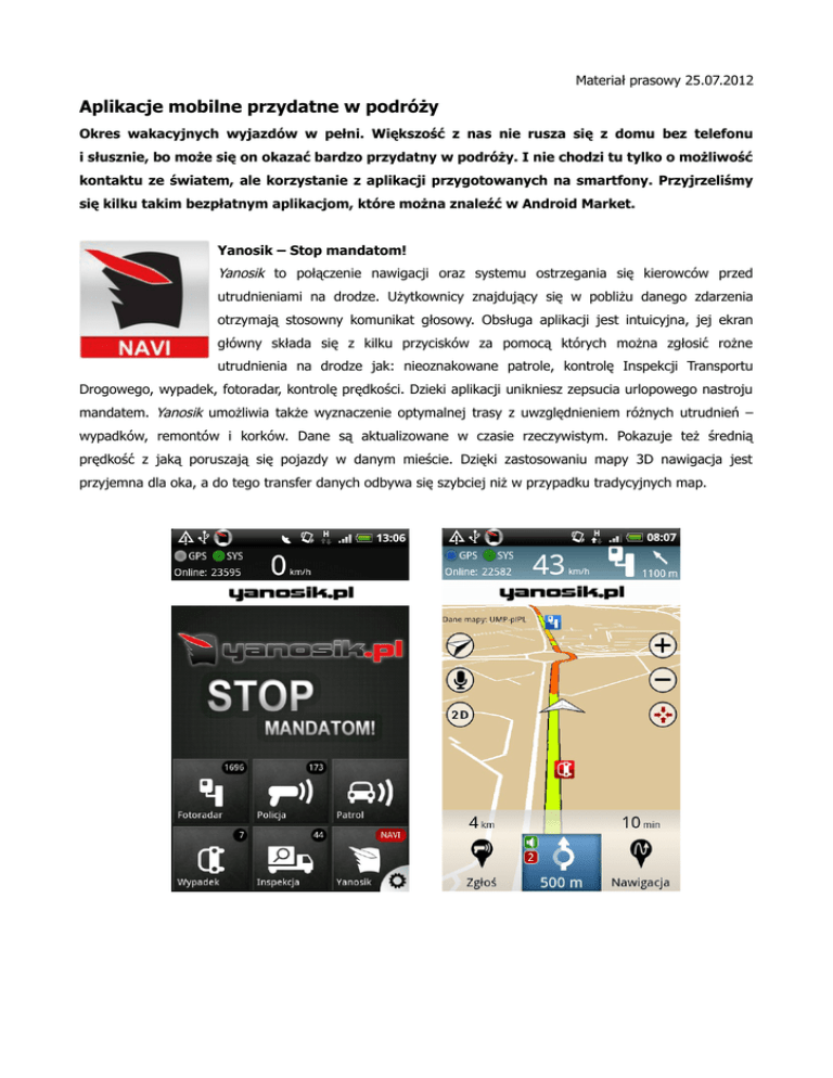 Materiał prasowy 25.07.2012 Aplikacje mobilne przydatne w podróży Okres wakacyjnych wyjazdów w pełni. Większość z nas nie rusza się z domu bez telefonu i słusznie, bo może się on okazać bardzo przydatny w podróży. I nie chodzi tu tylko o możliwość kontaktu ze światem, ale korzystanie z aplikacji przygotowanych na smartfony. Przyjrzeliśmy się kilku takim bezpłatnym aplikacjom, które można znaleźć w Android Market. Yanosik – Stop mandatom! Yanosik to połączenie nawigacji oraz systemu ostrzegania się kierowców przed utrudnieniami na drodze. Użytkownicy znajdujący się w pobliżu danego zdarzenia otrzymają stosowny komunikat głosowy. Obsługa aplikacji jest intuicyjna, jej ekran główny składa się z kilku przycisków za pomocą których można zgłosić rożne utrudnienia na drodze jak: nieoznakowane patrole, kontrolę Inspekcji Transportu Drogowego, wypadek, fotoradar, kontrolę prędkości. Dzieki aplikacji unikniesz zepsucia urlopowego nastroju mandatem. Yanosik umożliwia także wyznaczenie optymalnej trasy z uwzględnieniem różnych utrudnień – wypadków, remontów i korków. Dane są aktualizowane w czasie rzeczywistym. Pokazuje też średnią prędkość z jaką poruszają się pojazdy w danym mieście. Dzięki zastosowaniu mapy 3D nawigacja jest przyjemna dla oka, a do tego transfer danych odbywa się szybciej niż w przypadku tradycyjnych map. Bilkom - Rozkład pociągów Nie każdy jednak ma zamiar podróżować autem. Dla tych, którzy preferują jazdę pociągiem stworzono aplikację Bilkom – osobisty rozkład jazdy pociągów. Jest to kompleksowy serwis informacyjny o polskich kolejach (posiada informacje o wszystkich przewoźnikach w Polsce, a także wielu europejskich). Umożliwia łatwe wyszukanie połączeń kolejowych, zaplanowanie podróży do konkretnego adresu, a także sprawdzenie czasu przyjazdu i odjazdu danego pociągu. Dane są stale aktualizowane, dzięki czemu aplikacja poinformuje nas o np. opóźnieniu danego pociągu, umożliwiając lepsze zagospodarowanie czasu. Bilkom prezentuje także rozkłady jazdy na stacjach znajdujących się w pobliżu. Użytkownik może też zapisać połączenia, które wyszukał i korzystać z nich w trybie offline. Jak dojadę – komunikacja miejska Kiedy znajdujemy się w obcym mieście łatwo jest zagubić się w meandrach tutejszej komunikacji miejskiej. W bezproblemowym przemieszcznaiu się po nieznanym terenie pomoże i Jak dojadę tramwajowych, - najdokładniejsza obsługująca 12 wyszukiwarka największych polskich połączeń miast. autobusowych Dane są stale aktualizowane. Wyszukiwać można po konkretnej lokalizacji GPS, adresie, punkcie na mapie, nazwach ulic, przystanku lub charakterystycznym dla danego miasta miejscu. Aplikacja automatycznie znajduje przystanki w pobliżu wybranej lokalizacji. Co więcej, wskazuje gdzie i na jaką linię należy się przesiąść, jakie zakupić bilety i z jakich innych opcji transportu można skorzystać. Jak dojadę posiada także funkcję nawigacji, która prowadzi użykownika przez całą trasę. Informacja głosowa zawiadamia o tym ile zostało jeszcze przystanków do końca podróży, przypomni o przesiadce, wskaże lokalizację, pokieruje którędy pójść, by dotrzeć na dany przystanek. Istnieje też możliwość wyłączenia mapy i działania offline. Welcome 2 Poland – Mobilny przewodnik po Polsce Kiedy już dojedziemy w upragniony zakątek Polski, warto zaczerpnąć informacji o noclegach, ciekawych miejscach w okolicy, przyjemnych knajpkach itd. Te informacje można odnaleźć właśnie w aplikacji Welcome 2 Poland. Z założenia skierowana jest ona do obcokrajowców, ale nic nie stoi na przeszkodzie, aby korzystali z niej także Polacy – zwłaszcza, że wyposażona jest również w polską wersję językową. W aplikacji znajdują się informacje o kilku największych polskich miastach – Warszawie, Poznaniu, Wrocławiu, Gdańsku, Sopocie, Gdyni oraz Katowicach. Zawiera ponad 220 000 punktów POI (m. in. bankomatów, stref darmowego wifi, klubów, hoteli). Aplikacja posiada dużą bazę korporacji multimediów, taksówkowych listę wraz z cennikiem, a także codziennie wysyła powiadomienia o ciekawych wydarzeniach w danym mieście. Przewodnik działa też w trybie offline co niweluje koszty transmisji, a dzięki funkcji "Znajdź mnie" pokazuje na mapie aktualną pozycję GPS użytkownika.