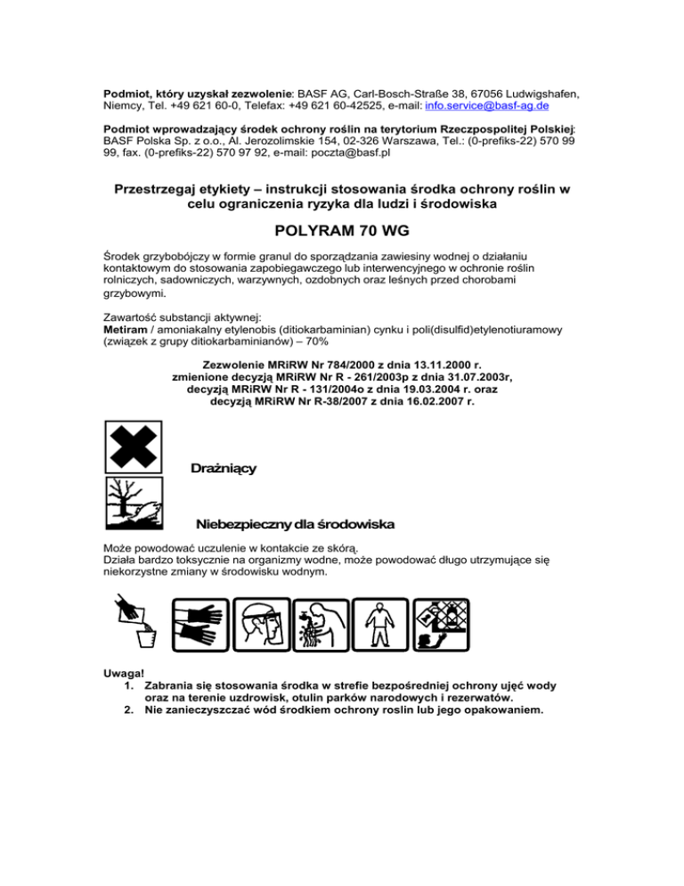 Podmiot, który uzyskał zezwolenie: BASF AG, Carl-Bosch-Straße 38, 67056 Ludwigshafen, Niemcy, Tel. +49 621 60-0, Telefax: +49 621 60-42525, e-mail: [email protected] Podmiot wprowadzający środek ochrony roślin na terytorium Rzeczpospolitej Polskiej: BASF Polska Sp. z o.o., Al. Jerozolimskie 154, 02-326 Warszawa, Tel.: (0-prefiks-22) 570 99 99, fax. (0-prefiks-22) 570 97 92, e-mail: [email protected] Przestrzegaj etykiety – instrukcji stosowania środka ochrony roślin w celu ograniczenia ryzyka dla ludzi i środowiska POLYRAM 70 WG Środek grzybobójczy w formie granul do sporządzania zawiesiny wodnej o działaniu kontaktowym do stosowania zapobiegawczego lub interwencyjnego w ochronie roślin rolniczych, sadowniczych, warzywnych, ozdobnych oraz leśnych przed chorobami grzybowymi. Zawartość substancji aktywnej: Metiram / amoniakalny etylenobis (ditiokarbaminian) cynku i poli(disulfid)etylenotiuramowy (związek z grupy ditiokarbaminianów) – 70% Zezwolenie MRiRW Nr 784/2000 z dnia 13.11.2000 r. zmienione decyzją MRiRW Nr R - 261/2003p z dnia 31.07.2003r, decyzją MRiRW Nr R - 131/2004o z dnia 19.03.2004 r. oraz decyzją MRiRW Nr R-38/2007 z dnia 16.02.2007 r. Drażniący Niebezpieczny dla środowiska Może powodować uczulenie w kontakcie ze skórą. Działa bardzo toksycznie na organizmy wodne, może powodować długo utrzymujące się niekorzystne zmiany w środowisku wodnym. Uwaga! 1. Zabrania się stosowania środka w strefie bezpośredniej ochrony ujęć wody oraz na terenie uzdrowisk, otulin parków narodowych i rezerwatów. 2. Nie zanieczyszczać wód środkiem ochrony roslin lub jego opakowaniem. ZAKRES STOSOWANIA, TERMINY I DAWKI Rośliny rolnicze ziemniak zaraza ziemniaka Zalecana dawka: 1,5-1,8 kg/ha. Zalecana ilość wody: 200-400 l/ha. Zalecane opryskiwanie: drobnokropliste. Wyższą dawkę środka i większą ilość wody stosować w warunkach silnego zagrożenia chorobą lub na plantacjach o bujniejszej naci ziemniaczanej. Po wykonaniu pierwszego zabiegu środkiem o działaniu systemicznym lub wgłębnym Polyram 70 WG stosować przemiennie z fungicydami o działaniu kontaktowym. chmiel mączniak rzekomy Zalecane stężenie: 0,2 % (200 g środka w 100 litrach wody) Zalecana ilość wody: 1000-3000 l/ha. Środek stosować zapobiegawczo lub zgodnie z sygnalizacją do fazy kwitnienia. Rośliny sadownicze jabłoń, grusza parch jabłoni, parch gruszy Zalecana dawka: 3-4,5 kg/ha. Wyższą dawkę środka stosować w warunkach silnego zagrożenia chorobą. Zalecana ilość wody: 500-750 l/ha. Środek wykazuje działanie interwencyjne do 24 godzin po infekcji. agrest, porzeczka opadzina liści porzeczki, biała plamistość liści, rdza wejmutkowo-porzeczkowa Zalecana dawka: 4,5 kg/ha. Zalecana ilość wody: 500-900 l/ha. Środek stosować bezpośrednio przed kwitnieniem lub po zbiorze owoców. Opryskiwać do całkowitego zwilżenia liści i pędów. Rośliny warzywne pomidor (w gruncie) zaraza ziemniaka, alternarioza, septorioza, brunatna plamistość liści Zalecana dawka:1,2-1,8 kg/ha. Zalecana ilość wody: 600-700 l/ha. Środek stosować co 7-10 dni (mniejszy odstęp między zabiegami zachować w przypadku silnego zagrożenia chorobą). Polyram 70 WG przeznaczony jest do opryskiwania po zastosowaniu środka o działaniu systemicznym lub wgłębnym. rośliny kapustne (produkcja rozsady) mączniak rzekomy Zalecana dawka: 1,2 kg/ha. Zalecana ilość wody: 400 l/ha. Zalecane opryskiwanie: drobnokropliste. Opryskiwać rozsadę od fazy 2-3 liści. zgorzel siewek Zalecane stężenie: 0,2% (200 g środka w 100 litrach wody). Zalecana ilość cieczy użytkowej: 2 l/m2 . Podlewać rośliny bezpośrednio po siewie lub pikowaniu. cebula mączniak rzekomy Zalecana dawka: 2 kg/ha. Zalecana ilość wody: 600-700 l/ha. Zabiegi wykonywać zapobiegawczo, zgodnie z sygnalizacją, w odstępach co 7-10 dni lub natychmiast po wystąpieniu pierwszych objawów chorobowych na cebuli nasiennej i dymce. seler septorioza Zalecana dawka: 2 kg/ha. Zalecana ilość wody: 700 l/ha. Zabiegi wykonywać co 7-10 dni po wystąpieniu pierwszych objawów choroby. Środek stosować przemiennie z fungicydami należącymi do innych grup chemicznych. Rośliny ozdobne (w gruncie i pod osłonami) OPRYSKIWANIE plamistości liści, rdze Zalecane stężenie: 0,2% (200 g środka w 100 litrach wody). Zalecana ilość cieczy użytkowej: 500-1000 l/ha. Ilość cieczy użytkowej dostosować do wielkości i zagęszczenia roślin. PODLEWANIE siewki roślin ozdobnych zgorzel zgnilakowa Zalecane stężenie: 0,2% (200 g środka w 100 litrach wody). Zalecana ilość cieczy użytkowej: 2-3 l/m2 . Rośliny leśne (szkółki leśne) rdza i osutka sosny Zalecana dawka: do 60 cm wysokości drzew 1,2 kg/ha dla każdych dalszych 10 cm stosować dodatkowo 0,2 kg środka/ha. UWAGI 1. Przed zastosowaniem środka na rośliny ozdobne wykonać na każdej uprawianej odmianie próbny zabieg w celu sprawdzenia czy w ciągu 7 dni nie wystąpiły objawy uszkodzenia roślin. 2. Środek stosować przemiennie z fungicydami należącymi do innych grup chemicznych. OKRES KARENCJI (okres od dnia ostatniego zabiegu do dnia zbioru roślin przeznaczonych do konsumpcji): ziemniak - 14 dni jabłka, gruszki - 35 dni pomidor, cebula, seler - 5 dni agrest, porzeczka: karencję określa termin stosowania. chmiel – nie dotyczy rośliny kapustne (produkcja z rozsady) - nie dotyczy OKRES PREWENCJI DLA LUDZI, ZWIERZAT I PSZCZÓŁ (okres zapobiegający zatruciu): NIE DOTYCZY SPORZĄDZANIE CIECZY UŻYTKOWEJ Przed przystąpieniem do sporządzania cieczy użytkowej dokładnie ustalić potrzebną jej ilość. Odważoną ilość środka wsypać do zbiornika opryskiwacza napełnionego częściowo wodą (z włączonym mieszadłem) i uzupełnić wodą do potrzebnej ilości. Opryskiwać z włączonym mieszadłem. Po wsypaniu środka do zbiornika opryskiwacza nie wyposażonego w mieszadło hydrauliczne ciecz w zbiorniku mechanicznie wymieszać. Środek łatwo tworzy