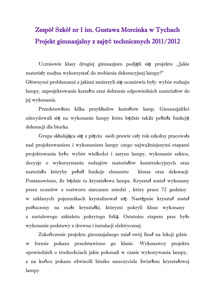 Zespół Szkół nr 1 im. Gustawa Morcinka w Tychach Projekt gimnazjalny z zajęć technicznych 2011/2012 Uczniowie klasy drugiej gimnazjum podjęli się projektu ,,Jakie materiały można wykorzystać do zrobienia dekoracyjnej lampy?” Głównymi problemami z jakimi zmierzyli się uczniowie były: wybór rodzaju lampy, zaprojektowanie kształtu oraz dobranie odpowiednich materia łów do jej wykonania. Przedstawiłem kilka przykładów kształtów lamp. Gimnazjali ści zdecydowali się na wykonanie lampy która będzie tak że pe łni ła funkcj ę dekoracji dla biurka. Grupa składająca się z pięciu osób prawie cały rok szkolny pracowała nad projektowaniem i wykonaniem lampy czego najwa żniejszymi etapami projektowania było: wybór wielkości i zarysu lampy, wykonanie szkicu, decyzje o wykorzystaniu rodzajów materiałów konstrukcyjnych oraz materiału któryby pełnił funkcje elementu klosza oraz dekoracji. Postanowiono, że będzie to kryształowa lampa. Kryształ został wykonany przez uczniów z roztworu siarczanu miedzi , który przez 72 godziny w szklanych pojemnikach krystalizował się. Następnie kryszta ł zosta ł potłuczony na małe kryształki, którymi pokryli klosz wykonany z metalowego szkieletu pokrytego folią. Ostatnim etapem prac by ło wykonanie podstawy z drewna i instalacji elektrycznej. Zakończenie projektu gimnazjalnego miał swój fina ł na lekcji gdzie w formie pokazu przedstawiono go klasie. Wykonawcy projektu opowiedzieli o trudnościach jakie pokonali w czasie wykonywania lampy, a na końcu pokazu oświecili biurko nauczyciela świat łem kryszta łowej lampy. Zdjęcia kryształowej lampy. Zdjęcie nr 1 Zdjęcie nr 2 Opracował : mgr inż. Waldemar Śramski, Zespół Szkół nr 1 w Tychach.