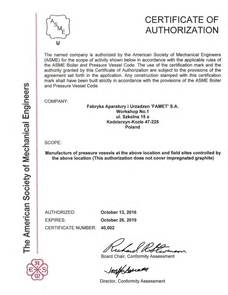 TuVNORD CERTYFIKAT TOV NORO Systems GmbH & Co. KG zaświadcza , że przedsiębiorstwo FABRYKA APARATURY l URZĄDZEŃ "FAMET" S.A. PL-47 -225 Kędzierzyn Koźle, ul. Szkolna 15a zostało skontrolowane i uznane jako zakład prace spawalnicze w zakresie nośnych prowadzący konstrukcji stalowych na podstawie normy DIN EN ISO 3834-2 Nr certyfikatu: 07-204-1326 HS 2147/15 Zakres uznania i szczegóły kontroli określono na drugiej stronie certyfikatu oraz w sprawozdaniu nr: 1326ST09450 l 8112520223 Firma pos iada system zapewnienia jakości, wykwalifikowany personel oraz technologie spawania zapewniające właściwą produkcję i kontrolę wyrobów spawanych. wyposaże nie zakładowe , Certyfikat jest ważny do 05/2018 Hamburg, 12.05.2015 yroby Budowlane ~ DAkl<S TOV NORO Systems GmbH & Co. KG • Technikzentrum • Zertifizierungsstelle fOr Bauprodukte GroBe BahnstraBe 31 • 22525 Hamburg Telefon (040) 8557-2368 ·Fax (040) 8557-2710 ·E-mail: technikzentrum@tuev-nord .de STW-P0Z-BauPVO-Z-FB-320_29_PL_3834_zertifikat-rev0(2014-08) Zakres czynności Obowiązuje tylko w spawalniczych połączeniu i jako załącznik do certyfikatu DIN EN ISO 3834 Zakład Producent: Nr 1 , 4 7-225 Kędz ierzyn-Koźle Nr 2, 28-300 Jędrzejów Zakład Nr 3, 63-600 Kępno Zakład Nr 4 , 45-641 Opole Zakład Nr 5, 23-235 Annopo l 07-204-1326 HS 2147/15 12.05.2015 2 Ul. Szkolna 15a Ul. Przemysłowa 11 Ul. Przemysłowa 12 Ul. Oświęcimska 102 C Ul. Stan i sława Skały 15 Zakład Nr certyfikatu : Data wydania : część 1 Wyrób( oby) Producenta Nośne elementy i podzespoły dla konstrukcji stalowych do EXC3 wg EN 1090-2 2 Norma(y) wyrobu i inne normy (patrz DIN EN ISO 3834-5) DIN EN 1090-2, DIN EN ISO 9606-1 DIN EN ISO 5817 , DIN EN ISO 15614-1 3 Grupa(y) materiałowa (wg CEN ISOITR 15608) 1.1 1.2, 8.1 l . 4 p rocesy spawa lmcze 1procesy zw1ązane Procesy spawalnicze (wg ISO 4063) z określeniem stopnia mechanizacji 135 MAG spawanie elektrodą topliwą w osłon ie gazów aktywnych , częściowo zmechanizowane 111 Spawanie łukowe elektrodą otuloną , manualne Grupy materi ałowe (wg CEN ISOITR 15608) 121 Spawanie łuk i em krytym drutem elektrodowym , zmechanizowane 136, Spawanie łukowe drutem elektrodowym proszkowym w atmosferze gazu aktywnego, częściowo zmechanizowane 141 , spawanie łukowe elektrodą nietopliwą w osłonie gazów obojętnych (TIG) , manualne 1.1, 1.2, ( R eH ~ 360 N/mm\ 8.1 1.1, 1.2 ( R eH ~ 1.1, 1.2 ( R eH 1.1, 1.2 ( R eH 1.1, 1.2 R eH 2 360 N/mm ), ~ 360 N/mm\ 8.1 ~ 360 N/mm\ ~ 360 N/mm 2 , 8.1 . . dz1a . lny persone spawa lmczy 5 Od1pow1e Zakres zadań i stop ie ń * Kwalifikacje Osoba odpowiedzialna za nadzór spawalniczy, C IWE Zastępca , C Bronisław Wąsik EWE Zastępca , C Adam Wieloch IWE Zastępca , C Artur Smorąg IWE Zastępca , C Wojciech Suchy IWE Zastępca , C Dariusz Masłań IWE Arkadiusz Pęcak Zastępca , C IWE .. * Stop1en kwalifikaCJI mus1 byczgodny z ISO 14731 lub B, S, lub C Nazwisko Andrzej Chudzio TOV NORO Systems GmbH & Co. KG • Technikzentrum • Zertifizierungsstelle fOr Bauprodukte GroBe BahnstraBe 31 • 22525 Hamburg Telefon (040) 8557-2368 ·Fax (040) 8557-2710 ·E-mail: [email protected] STW-P0Z-BauPVO-Z-FB-320_29_PL_3834_zertifikat-reV0(201 4-08) TuYNORD CERTIFICATE TUV NORO Systems GmbH & Co. KG certifies that the company FABRYKA APARATURY l URZĄDZEŃ "FAMET" S.A. PL-47 -225 Kędzierzyn Koźle, ul. Szkolna 15a has been verified and recognized as welding warkshop in the produet range of Steel structures based on the requirements of the standard DIN EN ISO 3834-2 Certificate-Nr.: 07-204-1326 HS 2147/15 The range of va lidity and details of the inspection can be seen on the back page and in our Report-no. : 1326ST09450 l 8112520223 The company is using a quality assurance system. tech nica l equipment, qualified personnel and procedures for joining processes for manufacturing and testing of welded products. This certiticałe is valid until 05/2018 Hamburg, 12.05.2015 ~ DAkkS ................unDI~ .. f>.ZE · U07.~l-CIO .... o .,; o TOV NORO Systems GmbH & Co. KG • Technikzentrum • Certification Body for Construction products GroBe BahnstraBe 31 • 22525 Hamburg Telefon (040) 8557-2368 ·Fax (040) 8557-2710 ·E-mail: [email protected] S1W-P0Z-BauPVO-Z-FB-320_29_EN_3834_zertifikat-rev0(2014-08) Scope of the welding activities Only valid in relation andasan attachment to the Manufacturer: Cert.-no. : Date of issue: certiticałe DIN EN ISO 3834 Part 2 Factory No.1 , 47-225 Kędzierzyn-Koźle Factory No.2, 28-300 Jędrzejów Factory No.3, 63-600 Kępno Factory No.4, 45-641 Opole Factory No.5, 23-235 Annopol 07-204-1326 HS 2147/15 12.05.2015 Ul. Szkolna 15a Ul. Przemysłowa 11 Ul. Przemysłowa 12 Ul. Oświęcimska 102 C Ul. Stanisława Skały 15 1 Product(s) of the manufacturer Structural components and for steel structures until EXC3 according to EN 1090-2 2 Produet standards and other standards (see DIN EN ISO 3834-5) DIN EN 1090-2, DIN EN ISO 9606-1 DIN EN ISO 5817 , DIN EN ISO 15614 3 Material group(s) (acc. to CEN ISO!TR 15608) 1.1 1.2, 8.1 l 4 Welding processes and related material groups Welding processes (acc. to ISO 4063) with grade of mechanization 135 GMAW, partly-mechanized Material groups (acc. to CEN ISO!TR 15608) 111 metal arc welding (MMA) , manual 1.1, 1.2 (ReH S 360 N/mm\ 8.1 121 SAW one-wire submerged arc welding , mechanized 1.1, 1.2, (ReH S 360 N/mm\ 8.1 141 tungsten inert gas welding (WIG), manual 1.1, 1.2 (ReH S 360 N/mm\ 136 MAG welding with flux cored electrode, partly-mechan ized 1.1, 1.2 (ReH S 360 N/mm 2), 8.1 1.1, 1.2 (ReH S 360 N/mm\ 5 Responsible welding coordinators Nam e Andrzej Chudzio Qualification SFI (IWE) Bronisław Wąsik Scope of competence and level* Responsible welding coord inator level C Deputy, C Deputy, C Deputy, C Deputy, C Deputy, C Deputy, C EWE IWE Adam Wieloch Artur Smorąg IWE Wojciech Suchy IWE Dariusz Masłoń IWE Arkadiusz Pęcak IWE * The level of knowledge complies with ISO 14731 B, S or C TOV NORO Sy