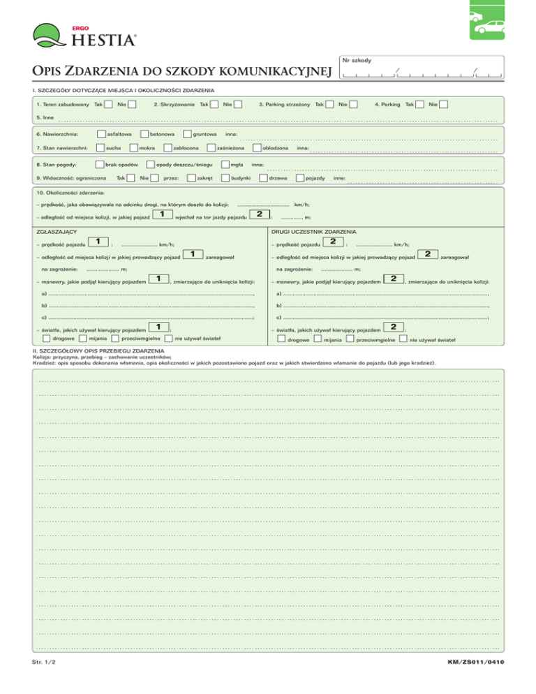Nr szkody OPIS ZDARZENIA DO SZKODY KOMUNIKACYJNEJ / / I. SZCZEGÓ¸Y DOTYCZÑCE MIEJSCA I OKOLICZNOÂCI ZDARZENIA 1. Teren zabudowany Tak Nie 2. Skrzy˝owanie Tak Nie 3. Parking strze˝ony Tak Nie 4. Parking Tak Nie 5. Inne 6. Nawierzchnia: asfaltowa 7. Stan nawierzchni: sucha 8. Stan pogody: brak opadów 9. WidocznoÊç: ograniczona betonowa mokra Tak gruntowa zab∏ocona inna: zaÊnie˝ona opady deszczu/Êniegu Nie przez: zakr´t mg∏a oblodzona inna: inna: budynki drzewa pojazdy inne: 10. OkolicznoÊci zdarzenia: – pr´dkoÊç, jaka obowiàzywa∏a na odcinku drogi, na którym dosz∏o do kolizji: – odleg∏oÊç od miejsca kolizji, w jakiej pojazd 1 ................................. km/h; wjecha∏ na tor jazdy pojazdu ZG¸ASZAJÑCY – pr´dkoÊç pojazdu : .............. m; DRUGI UCZESTNIK ZDARZENIA 1 : ....................... km/h; – pr´dkoÊç pojazdu – odleg∏oÊç od miejsca kolizji w jakiej prowadzàcy pojazd na zagro˝enie: 2 1 zareagowa∏ ..................... m; – manewry, jakie podjà∏ kierujàcy pojazdem , zmierzajàce do unikni´cia kolizji: : ....................... km/h; – odleg∏oÊç od miejsca kolizji w jakiej prowadzàcy pojazd na zagro˝enie: 1 2 2 zareagowa∏ .................... m; – manewry, jakie podjà∏ kierujàcy pojazdem 2 , zmierzajàce do unikni´cia kolizji: a) .................................................................................................................................., a) .................................................................................................................................., b) .................................................................................................................................., b) .................................................................................................................................., c) ..................................................................................................................................; c) ..................................................................................................................................; – Êwiat∏a, jakich u˝ywa∏ kierujàcy pojazdem drogowe mijania 1 przeciwmgielne : – Êwiat∏a, jakich u˝ywa∏ kierujàcy pojazdem nie u˝ywa∏ Êwiate∏ drogowe mijania 2 przeciwmgielne : nie u˝ywa∏ Êwiate∏ II. SZCZEGÓ¸OWY OPIS PRZEBIEGU ZDARZENIA Kolizja: przyczyna, przebieg – zachowanie uczestników; Kradzie˝: opis sposobu dokonania w∏amania, opis okolicznoÊci w jakich pozostawiono pojazd oraz w jakich stwierdzono w∏amanie do pojazdu (lub jego kradzie˝). Str. 1/2 KM/ZS011/0410 III. SZKIC SYTUACYJNY MIEJSCA ZDARZENIA A. SYTUACJA PRZED KOLIZJÑ (usytuowanie pojazdów, schemat drogi, znaki drogowe; w szkodach kradzie˝owych: miejsce postoju pojazdu, nazwa ulicy, budynki, obiekty ma∏ej architektury np. latarnie) B. SYTUACJA W CZASIE KOLIZJI (usytuowanie pojazdów, schemat drogi, znaki drogowe) C. SYTUACJA PO KOLIZJI (usytuowanie pojazdów, schemat drogi, znaki drogowe) Legenda: 1 pojazd nr rejestracyjny 2 3 pojazd nr rejestracyjny kierunek jazdy pojazd nr rejestracyjny Zg∏aszajàcy (kierujàcy) udzieli∏ powy˝szych informacji zgodnie z prawdà i wed∏ug najlepszej wiedzy. MiejscowoÊç Podpis zg∏aszajàcego Podpis kierujàcego Data (dzieƒ, miesiàc, rok) Dowód Osobisty – seria i nr Dowód Osobisty – seria i nr Potwierdzenie autentycznoÊci podpisu Podpis i imienna piecz´ç przyjmujàcego zg∏oszenie Zgodnie z art. 24 ust. 1 ustawy z dnia 29.08.1997r. o ochronie danych osobowych (Dz. U. Nr 133, poz. 883 z póên. zmianami), Sopockie Towarzystwo Ubezpieczeƒ Ergo Hestia SA z siedzibà w Sopocie, przy ul. Hestii 1, informuje, ˝e jest administratorem Pana/i danych osobowych, pobranych zgodnie z treÊcià art. 815 k.c., które b´dà przez nas przetwarzane w celu wywiàzania si´ z zawartej umowy ubezpieczenia oraz dla celów marketingu bezpoÊredniego naszych w∏asnych produktów (us∏ug). JednoczeÊnie informujemy, i˝ s∏u˝y Panu/i prawo wglàdu do swoich danych osobowych oraz ich Telefoniczne Centrum Obs∏ugi Klientów poprawiania, a przetwarzanie tych danych w celach innych, ni˝ wymienione powy˝ej inne cele prawnie H e s t i a K o n t a k t 0 8 0 1 1 0 7 1 0 7 * usprawiedliwione lub statutowe naszego Towarzystwa albo osób trzecich, którym sà przekazywane lub (+58) 555 55 55 * o p ∏ a t a z a p o ∏ à c z e n i e ró w n a j e d n o s t c e t a r y f i k a c y j n e j T P S A te dane - wymaga uzyskania Pana/i uprzedniej zgody. Str. 2/2 KM/ZS011/0410