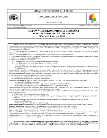 URZĄD STATYSTYCZNY W LUBLINIE OPRACOWANIA SYGNALNE Lublin, wrzesień 2016 r. Kontakt: [email protected] Internet: http://lublin.stat.gov.pl Tel. 81 533 20 51, fax 81 533 27 61 AKTYWNOŚĆ EKONOMICZNA LUDNOŚCI W WOJEWÓDZTWIE LUBELSKIM Stan w II kwartale 2016 r. Badanie Labour Force Survey (LFS), określane jest w Polsce jako BAEL, czyli Badanie Aktywności Ekonomicznej Ludności. Przeprowadzane jest ono co kwartał zgodnie z metodologią opracowaną przez Międzynarodową Organizację Pracy (International Labour Organisation). Podstawą prawną badania jest ustawa z dnia 29 czerwca 1995 r. o statystyce publicznej (Dz. U. z 1995 r. Nr 88, poz. 439 wraz z późniejszymi zmianami). Za ludność aktywną zawodowo (tzw. siłę roboczą) uważa się wszystkie osoby uznane za pracujące lub bezrobotne, zgodnie z definicjami podanymi poniżej. Zgodnie z przyjętą w BAEL definicją do pracujących zaliczono osoby, które w badanym tygodniu: 1. Wykonywały pracę przynoszącą zarobek lub dochód jako pracownik najemny, pracujący na własny rachunek lub pomagający członek rodziny w wymiarze co najmniej 1 godziny; 2. Miały pracę, ale jej nie wykonywały: a) z powodu choroby, urlopu macierzyńskiego lub wypoczynkowego; b) z innych powodów, przy czym długość przerwy w pracy wynosiła: do 3 miesięcy, powyżej 3 miesięcy, ale osoby te były pracownikami najemnymi i w tym czasie otrzymywały co najmniej 50% dotychczasowego wynagrodzenia. Do pracujących – zgodnie z międzynarodowymi standardami – zaliczani byli również uczniowie, z którymi zakłady pracy lub osoby fizyczne zawarły umowę o naukę zawodu lub przyuczenie do określonej pracy, jeżeli otrzymywali wynagrodzenie. Ze względu na przyjęte założenia metodologiczne badania, liczba pracujących uzyskana w wyniku BAEL nie obejmuje niektórych kategorii osób, które są wliczane do pracujących w sprawozdawczości z zakresu zatrudnienia, m.in.: a) pracujących, mieszkających w hotelach pracowniczych, b) pracujących za granicą na rzecz polskich pracodawców. Do kategorii bezrobotnych w BAEL zostały zaliczone osoby w wieku 15-74 lata, które spełniły jednocześnie 3 warunki: nie pracowały w badanym tygodniu, aktywnie poszukiwały pracy w ciągu 4 tygodni (wliczając jako ostatni tydzień badany), były gotowe podjąć pracę w ciągu 2 tygodni następujących po tygodniu badanym. Do bezrobotnych zostały zaliczone także osoby, które nie poszukiwały pracy, ponieważ miały pracę załatwioną i oczekiwały na jej rozpoczęcie przez okres nie dłuższy niż 3 miesiące oraz były gotowe tę pracę podjąć. Ludność bierna zawodowo to osoby w wieku 15 lat i więcej, które nie zostały zaklasyfikowane jako pracujące lub bezrobotne, tzn. osoby, które w badanym tygodniu: a) nie pracowały, nie miały pracy i jej nie poszukiwały, b) nie pracowały, poszukiwały pracy, ale nie były zdolne (gotowe) do jej podjęcia w ciągu 2 tygodni następujących po tygodniu badanym, c) nie pracowały i nie poszukiwały pracy, ponieważ miały pracę załatwioną i oczekiwały na jej rozpoczęcie w okresie: dłuższym niż 3 miesiące, do 3 miesięcy, ale nie były gotowe tej pracy podjąć. Współczynnik aktywności zawodowej jest to procentowy udział aktywnych zawodowo w ogólnej liczbie ludności danej kategorii. Wskaźnik zatrudnienia jest to procentowy udział pracujących w ogólnej liczbie ludności danej kategorii. Stopa bezrobocia jest to procentowy udział bezrobotnych w liczbie aktywnych zawodowo danej kategorii. Od II kwartału 2006 r. dane BAEL liczone są w oparciu o dokładną datę urodzenia. Od I kwartału 2008 r. czas poszukiwania pracy liczony jest od momentu zakończenia przerwy w poszukiwaniu pracy, o ile wystąpiła i trwała co najmniej 4 tygodnie. W związku z tym, dane te, nie są w pełni porównywalne z wynikami z lat poprzednich. Od I kwartału 2011 r. w związku z zastosowaniem nowej klasyfikacji zawodów – KZIS 2010, dane o pracujących według zawodów nie są w pełni porównywalne z wynikami z lat ubiegłych. Do uogólnienia wyników badania na populację generalną zastosowano dane o ludności w wieku 15 lat i więcej, pochodzące z bilansów opracowanych na podstawie wyników Narodowego Spisu Powszechnego Ludności i Mieszkań 2011 (NSP 2011). Wszelkie dane za okres od I kwartału 2010 r. do II kwartału 2012 r. uległy zmianie w stosunku do wcześniej opublikowanych. W 2012 r wprowadzono zmiany metodologiczne mające na celu dostosowanie populacji objętej badaniem do zaleceń Eurostatu. Od III kwartału w badaniu nie brane są pod uwagę osoby przebywające poza gospodarstwem domowym, tj. za granicą lub w gospodarstwach zbiorowego zakwaterowania, 12 miesięcy lub więcej — do II kw. 2012 r. było to 3 miesiące lub więcej. W związku z wprowadzonymi zmianami prezentowane wyniki BAEL nie są w pełni porównywalne z wynikami badań z lat poprzedzających 2010 rok. Dane analizowane w tym opracowaniu przedstawiają wyniki przeliczone zgodnie z nową metodologią i nową podstawą uogólniania wyników. Podstawowym celem badania jest uzyskanie danych o wielkości i strukturze zasobów siły roboczej. Wyniki badania służą głównie do: ustalania bilansów siły roboczej z wyróżnieniem trzech podstawowych kategorii ludności: pracujących, bezrobotnych i biernych zawodowo, analizy zmian aktywności ekonomicznej ludności w różnych grupach społeczno-zawodowych, analizy sytuacji na rynku pracy, w tym oceny skali i stopnia zmian natężenia bezrobocia w ujęciu przestrzennym, charakterystyki społeczno-demograficznej osób bezrobotnych, analizy struktury zatrudnienia według cech społeczno-demograficznych i zawodowych. Podmiotami badania są osoby w wieku 15 lat i więcej będące członkami gospodarstw domowych w wylosowanych mieszkaniach. U w a g a. Z uwagi na reprezentacyjną metodę badania, zalecana jest ostrożność w posługiwaniu się danymi o wartości mniejszej niż 15 tys. W