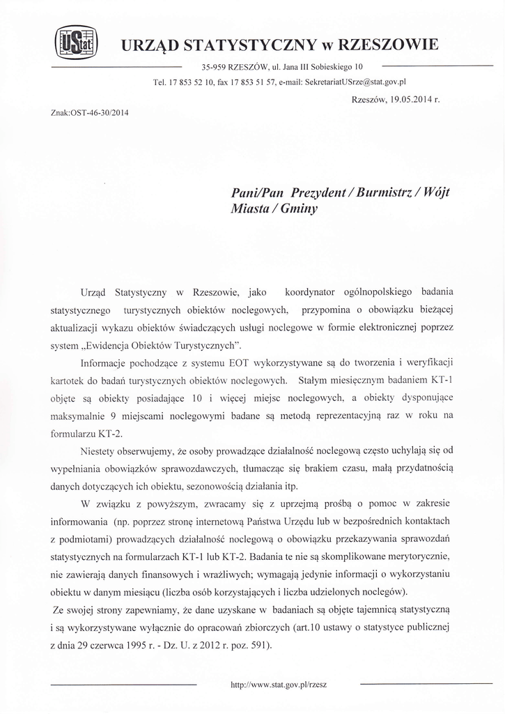 URZĄD STATYSTYCZNY w RZESZOWIE 35-959 RZESZOW, ul. Jana III Sobieskiego 10 Tel. 17 853 52 10, fax l7 853 5157, e-mail: [email protected] Rzeszów, 19.05.2014 r. Znak:OST-46-30l20l4 Pani/Pun Prezydent / Burmistrz / Wójt Miustu / Gminy IJrząd statystyczny w Rzeszowie, jako koordynator ogólnopolskiego badania statystycznego turystycznych obiektów noclegowych, przypomina o obowiązku bieżącej aktua|izacjt wykazu obiektów świadczących usługi noclegowe w formie elektronicznej poprzez system,,Ewidencja Obiektów Turystycznych". Informacje pochodzące z systemu EOT wykorzystywane są do tworzenia i weryfikacji kartotek do badań turystycznych obiektów noclegowych. Stałym miesięcznym badaniem KT-1 objęte są obiekty posiadające maksymalnie 9 l0 i więcej miejsc noclegowych, a obiekty dysponujące w roku miejscami noclegowymi badane są metodą reprezentacylną raz na forrnularzu KT-2. Niestety obserwujemy, ze osoby prowadzącę działalnośćnoclegową często uchylają się od wypełniania obowiązków sprawozdawczych, tłumacząc się brakiem QzasLlJ małą przydatnością danych dotyczących ich obiektu, sezonowością działania itp. W związku z powyższym, zwracamy się z uprzejmą prośbąo pomoc w zakresie informowania (np. poprzęz stronę internetową Państwa Urzędu lub w bezpośrednich kontaktach z podmiotami) prowadzących działalnośćnoclegową o obowiązku przekazywania sprawozdań statystycznych na formularzach KT-1 lub KT-2. Badania te nie są skomplikowane merytorycznie, nie zawierają danych finansowych i wrazliwych; wymagają jedynie informacji o wykorzystaniu obiektu w danym miesiącu (Itczba osób korzystających iliczbaudzielonych noclegów). Ze swojej strony zapewniamy,że dane uzyskane w badaniach są objęte tajemnicą statystyczną i są wykorzystywane vłyłączntedo opracowańzbtorczych (ar1.10 ustawy o statystyce publicznej z dnia 29 częrwca 199 5 r, - Dz. U . z 2012 r. poz. 59 I). http ://www. stat. gov .pUrzesz Dane pozyskiwane w oparciu o badania statystyczne są wazne dla analiz rynku turystycznego, słuzą do działań wspierających rozwój sektora turystycznego, atakże do ewaluacji projektów i działń realizowanych z wykorzystaniem urzędy statystyczne prezentują dane z funduszy UE,. GUS oraz poszczególne zakresu turystyki w róznego rodzaju publikacjach oraz baŃu danych lokalnych. Liczymy na Państwa wsparcie w promowaniu badań statystycznych oraz ich wyników. Jednocześnie, w związku z pojawiającymi się podczas rejestracji danych wątpliwościami dotyczącymi rodzaju obiektu wyjaśniamy, że do obiektów zbiorowego zakwaterowania zaltczane są m.in. hotele, motele, pensjonaty, domy wycieczkowe, schroniska, ośrodki: wczasowe, kolonijne, szkoleniowe, domki turystyczne, kempingi, pola biwakowe, hostele, internaty, domy akademickte, zajazdy. Dodatkowych informacji związanych z dziaŁuiem aplikacji EOT oraz badaniami turystycznych obiektów noclegowych udzielają pracownicy Urzędu Statystycznego w Rzeszowie, tel. I7 8535żI9 w. 216,2I5,274, e-mail: [email protected]. http //www. stat. gov .pll : r zesz