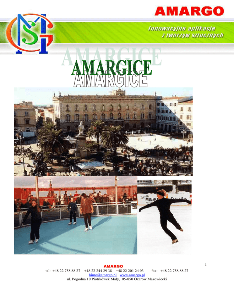 AMARGO tel: +48 22 758 88 27 +48 22 244 29 38 +48 22 201 24 03 fax: +48 22 758 88 27 [email protected] www.amargo.pl ul. Pogodna 10 Piotrkówek Mały, 05-850 Ożarów Mazowiecki 1 Łyżwiarze są zachwyceni. Możliwość jazdy na łyżwach przez cały rok. Dzięki AmargIce łyżwiarstwo nigdy wcześniej nie było tak proste jak teraz. Prawie w każdym miejscu, w każdej chwili i za niewiarygodnie rozsądną cenę. Dla łyżwiarzyamatorów AmargIce stanowi realną alternatywę dla naturalnych i sztucznych lodowisk. Z finansowego punktu widzenia AmargIce jest jedyną sensowną opcją, ponieważ koszty zakupu oraz rutynowych prac konserwacyjnych są niezwykle niskie. Prosimy o zapoznanie się z poniższym krótkim podsumowaniem najważniejszych argumentów przemawiających za zakupem i instalacją nawierzchni AmargIce. AmargIce jako sucha alternatywa. AmargIce to bardzo odporne podłoże syntetyczne, którego konstrukcja sprawia, że wszelkie duże obciążenia pozostają bez jakiegokolwiek wpływu. Do łączenia ze sobą poszczególnych płyt z tworzywa sztucznego stosowany jest opatentowany system układania nawierzchni. Spryskanie powierzchni specjalnym dodatkiem poślizgowym pozwala uzyskać wysoką i szczególnie trwałą jakość ślizgową. Szybkość zużycia AmargIce wynosi mniej więcej 100 000 godzin na 100 m². Dzięki temu, ogólnie rzecz biorąc, przez wiele lat można cieszyć się nieograniczoną możliwością jazdy na łyżwach, prowadząc dochodową działalność rekreacyjną. AmargIce jest łatwa w instalacji i uniwersalna. Montaż i demontaż jest szybki i prosty. Dlatego AmargIce może idealnie służyć jako podłoże mobilne, wykorzystywane w trakcie organizacji różnego rodzaju imprez. Dzięki opracowaniu planów obliczania powierzchni AmargIce zapewnia większe pole manewru. W rzeczywistości AmargIce nadaje się nie tylko do jazdy na łyżwach, ale również do rozgrywania na niej meczów piłki nożnej, koszykówki oraz do organizacji imprez tanecznych, żeby wymienić tylko kilka spośród dyscyplin sportu, jakie można uprawiać na nawierzchni AmargIce. AmargIce ogranicza koszty konserwacji do minimum. Do zapewnienia prawidłowej obsługi nawierzchni AmargIce nie jest wymagane korzystanie z usług jakichkolwiek inżynierów ruchu lub personelu posiadającego odpowiednie specjalne przeszkolenie. Procedury dotyczące obsługi i konserwacji są więcej niż łatwe. Koszty materiałów konserwacyjnych są niezwykle niskie, zwłaszcza w porównaniu z wydatkami ponoszonymi z tytułu stałego serwisu lodowisk „mokrych”. AmargIce nie jest szkodliwy dla środowiska naturalnego ani nie powoduje zużycia energii. Używając tego wyrobu, oszczędzamy energię, jaka potrzebna byłaby do produkcji lodu. AmargIce nie wymaga żadnego schładzania ani nie powoduje konieczności korzystania z wody. Ponadto nie są stosowane żadne substancje agresywne, takie jak freon lub amoniak, które byłyby konieczne do produkcji sztucznie mrożonych powierzchni. AmargIce jest powierzchnią całkowicie nietrującą. AMARGICE W STU PROCENTACH NADAJE SIĘ DO RECYKLINGU. AmargIce spełnia światowe wymagania dotyczące wydajnej gospodarki energią i zasobami oraz posiada wszelkie właściwości umożliwiające jej całkowity recykling. AmargIce gwarantuje znakomite wyniki eksploatacyjne. W momencie zakupu AmargIce producent udzieli gwarancji na swój wyrób na okres 3 lat. AmargIce to najtańsze alternatywne rozwiązanie w dziedzinie łyżwiarstwa. AMARGO tel: +48 22 758 88 27 +48 22 244 29 38 +48 22 201 24 03 fax: +48 22 758 88 27 [email protected] www.amargo.pl ul. Pogodna 10 Piotrkówek Mały, 05-850 Ożarów Mazowiecki 2 Referencje W ciągu ostatnich kilku lat prezentowany produkt był wielokrotnie używany w trakcie wielkich pokazów i imprez okolicznościowych. Do tej pory lodowiska syntetyczne na bazie prezentowanych paneli były z powodzeniem instalowane w Japonii, Korei, Jordanii, Indonezji, na Węgrzech i w Niemczech. Od momentu wprowadzenia produktu na rynek europejski w grudniu 1997 roku był on już wielokrotnie prezentowany publiczności w czasie między innymi takich imprez, jak: „Wonderworld” we Frankfurcie „Freizeit ‘98”, międzynarodowe targi rekreacyjne w Berlinie Festiwal Dziecięcy w Berlinie Na terenie ultranowoczesnego centrum handlowego Polus-Centre w Kecskemet na Węgrzech AmargIce służy jako obiekt rekreacyjny, dlatego został tam zainstalowany na stałe. „Jump in2 the Fun”, festiwal w Kolonii w Niemczech, na którym prezentowane są najbardziej nowatorskie, najmodniejsze i najbardziej popularne dyscypliny sportu. Tanja Szewczenko, trzykrotna zwyciężczyni Krajowych Mistrzostw Niemiec w Jeździe Figurowej na Lodzie, jest głęboko przekonana o wysokiej jakości AmargIce. Po przetestowaniu naszego wyrobu podkreśliła w udzielonym wywiadzie, że AmargIce spełnia marzenia wielu łyżwiarzy: „Ta nawierzchnia umożliwia nam trenowanie naszej dyscypliny sportu niezależnie od warunków atmosferycznych i w prawie każdym miejscu, umożliwiając nam zamianę zimnych hal w zimie na słoneczne plaże”. „Mövenpick Art on Ice” – tournee zorganizowane w roku 1998 w Hanowerze, Monachium, Oberhausen i Kolonii Turniej o Puchar Dominika Haška rozegrany w Budziejowicach i Libercu w sierpniu i wrześniu 1998 r. Radio Z na „Bauschänzli” w Zurychu z Denisem Bielmannem Impreza na dachu budynku „Karstadt Sport" w Hamburgu, największym w Europie sklepie ze sprzętem sportowym! Piazza Italia w Sassari na Sardynii w dniach od 18.12.1999 r. do 09.01.2000 r. Pokazy Turystyczne zorganizowane przez Austriacką Izbę Turystyki w Lipsku, Hamburgu, Stuttgarcie i Monachium Turniej o Puchar Dominika Haška rozegrany w Pilźnie w sierpniu 2000 r. Berliner Bäder-Betriebe AmargIcerink Fixinstallation Swimming-Bath Wannsee 2000 Sklep Goal Tender w Sztokholmie Ogród Centrum Sportowego w Palermo Lodowisko Starachowice „Na Szlakowisku” Lodowisko Ostrowiec Św