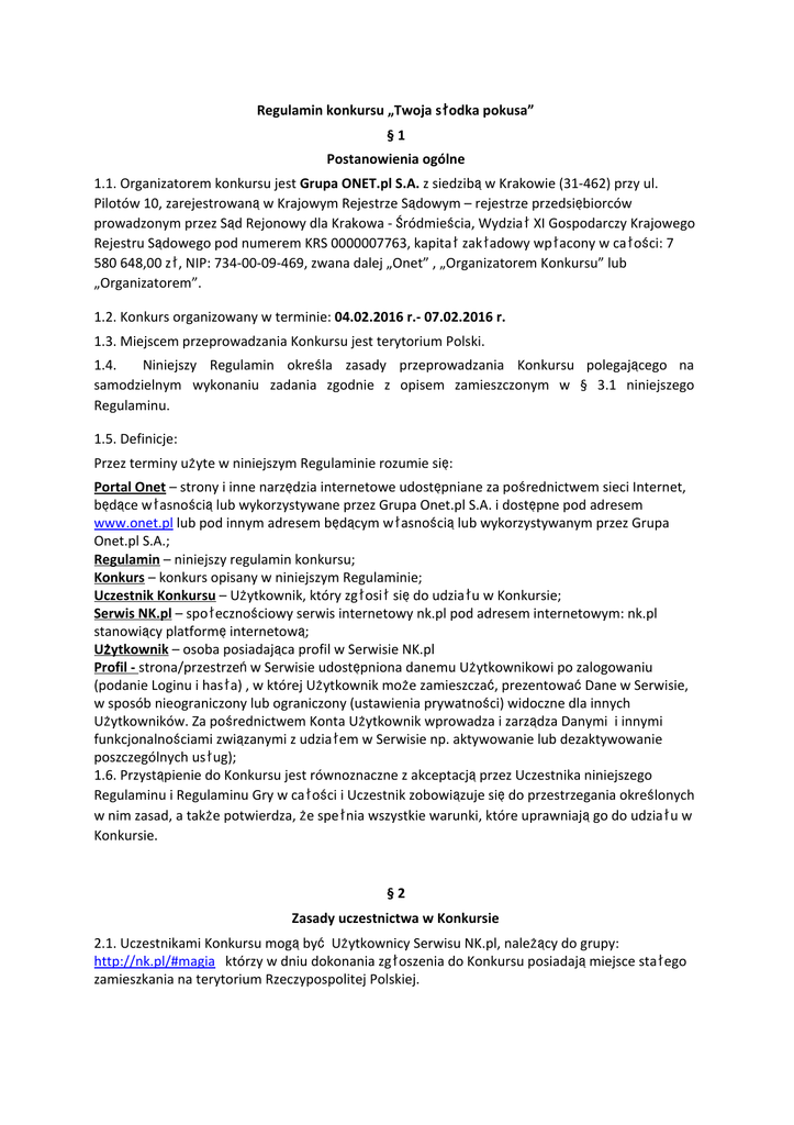 Regulamin konkursu „Twoja słodka pokusa” § 1 Postanowienia ogólne 1.1. Organizatorem konkursu jest Grupa ONET.pl S.A. z siedzibą w Krakowie (31‐462) przy ul. Pilotów 10, zarejestrowaną w Krajowym Rejestrze Sądowym – rejestrze przedsiębiorców prowadzonym przez Sąd Rejonowy dla Krakowa ‐ Śródmieścia, Wydział XI Gospodarczy Krajowego Rejestru Sądowego pod numerem KRS 0000007763, kapitał zakładowy wpłacony w całości: 7 580 648,00 zł, NIP: 734‐00‐09‐469, zwana dalej „Onet” , „Organizatorem Konkursu” lub „Organizatorem”. 1.2. Konkurs organizowany w terminie: 04.02.2016 r.‐ 07.02.2016 r. 1.3. Miejscem przeprowadzania Konkursu jest terytorium Polski. 1.4. Niniejszy Regulamin określa zasady przeprowadzania Konkursu polegającego na samodzielnym wykonaniu zadania zgodnie z opisem zamieszczonym w § 3.1 niniejszego Regulaminu. 1.5. Definicje: Przez terminy użyte w niniejszym Regulaminie rozumie się: Portal Onet – strony i inne narzędzia internetowe udostępniane za pośrednictwem sieci Internet, będące własnością lub wykorzystywane przez Grupa Onet.pl S.A. i dostępne pod adresem www.onet.pl lub pod innym adresem będącym własnością lub wykorzystywanym przez Grupa Onet.pl S.A.; Regulamin – niniejszy regulamin konkursu; Konkurs – konkurs opisany w niniejszym Regulaminie; Uczestnik Konkursu – Użytkownik, który zgłosił się do udziału w Konkursie; Serwis NK.pl – społecznościowy serwis internetowy nk.pl pod adresem internetowym: nk.pl stanowiący platformę internetową; Użytkownik – osoba posiadająca profil w Serwisie NK.pl Profil ‐ strona/przestrzeń w Serwisie udostępniona danemu Użytkownikowi po zalogowaniu (podanie Loginu i hasła) , w której Użytkownik może zamieszczać, prezentować Dane w Serwisie, w sposób nieograniczony lub ograniczony (ustawienia prywatności) widoczne dla innych Użytkowników. Za pośrednictwem Konta Użytkownik wprowadza i zarządza Danymi i innymi funkcjonalnościami związanymi z udziałem w Serwisie np. aktywowanie lub dezaktywowanie poszczególnych usług); 1.6. Przystąpienie do Konkursu jest równoznaczne z akceptacją przez Uczestnika niniejszego Regulaminu i Regulaminu Gry w całości i Uczestnik zobowiązuje się do przestrzegania określonych w nim zasad, a także potwierdza, że spełnia wszystkie warunki, które uprawniają go do udziału w Konkursie. § 2 Zasady uczestnictwa w Konkursie 2.1. Uczestnikami Konkursu mogą być Użytkownicy Serwisu NK.pl, należący do grupy: http://nk.pl/#magia którzy w dniu dokonania zgłoszenia do Konkursu posiadają miejsce stałego zamieszkania na terytorium Rzeczypospolitej Polskiej. 2.2. W przypadku osób niepełnoletnich uczestniczących w Konkursie Organizator zastrzega sobie prawo do wydania nagrody po otrzymania pisemnej zgody ich opiekunów prawnych/ rodziców , dostarczonej Organizatorowi najpóźniej w dniu odbioru nagrody, w dwóch oryginalnych egzemplarzach. 2.3. Uczestnikami Konkursu nie mogą być pracownicy i przedstawiciele Organizatora Konkursu oraz Partnera technicznego członkowie ich rodzin do drugiego stopnia pokrewieństwa, oraz innych podmiotów biorących bezpośredni udział w przygotowaniu i przeprowadzeniu Konkursu na zlecenie Organizatora. 2.4. W Konkursie Użytkownik może wziąć udział jeden raz. Dana osoba może wziąć udział w Konkursie tylko z jednego konta w serwisie NK.pl 2.5. Zgłoszenia do Konkursu wypełnione nieprawidłowo, w sposób niepełny lub też zawierające nieprawdziwe dane nie będą uwzględniane. 2.6. Zgłoszenie udziału w Konkursie oznacza akceptację jego zasad przewidzianych w niniejszym Regulaminie. 2.7. Organizator zastrzega sobie prawo do nieprzyjęcia Zgłoszeń do Konkursu, które nie dotarły do niego w odpowiednim terminie, z przyczyn od niego niezależnych, m.in. wskutek awarii łączy internetowych czy systemu Uczestnika Konkursu. 2.8. Nagrodą w Konkursie jest: Za zajęcie miejsca 1: Kalendarz Czaromarownik 2016 oraz słodkie cukierki z logiem Vumag, łączna wartość nagród to: 99 zł brutto Za zajęcie miejsca 2: Powerbank z logiem Vumag, o wartości: 75 zł brutto § 3 Zasady przyznawania nagród Konkursowych 3.1. Zadaniem każdego Uczestnika Konkursu przesłanie tekstu na zadany temat: Moja największa słodka pokusa to... (dalej: Odpowiedź). Odpowiedź należy przesłać na oficjalne konto pod adres: http://nk.pl/poczta/compose/49217590 Odpowiedź należy przesłać w trakcie trwania konkursu. 3.2. Uczestnik Konkursu wysyłając zgłoszenie oświadcza, że Odpowiedź, nie była nigdzie wcześniej publikowana oraz że przysługują mu wyłączne i nieograniczone prawa autorskie do Odpowiedzi. Uczestnik Konkursu oświadcza, iż Odpowiedź nie narusza przepisów prawa, prawem chronionych dóbr osób lub podmiotów trzecich ani też praw na dobrach niematerialnych. 3.3. Nad prawidłowym przebiegiem konkursu czuwa Komisja Konkursowa składająca się z przedstawicieli Organizatora Konkursu. 3.4. Komisja Konkursowa wybierze Odpowiedzi, która w jej opinii są najciekawsze. Z posiedzenia Komisji Konkursowej zostanie sporządzony protokół z wyszczególnieniem Zwycięzców oraz przyznanym ich Nagród. 3.5. Posiedzenie Komisji, podczas którego nastąpi przyznanie nagród Konkursowych, odbędzie się w terminie do: 10.02.2016 r. W Konkursie nagrodzonych zostanie 2 (dwóch) Uczestników. 3.6. W Konkursie określona w pkt. 2.9. powyżej nie podlega wymianie na jej równowartość w pieniądzu, ani na nagrody innego rodzaju. 3.7. Zwycięzca Konkursu nie może przenieść prawa do otrzymania nagrody na osoby trzecie. 3.8. Uczestnik poprzez przesłanie zgłoszenia, wyraża zgodę na publikację treści tej Odpowiedzi na stronach Portalu Onet, dostępnej pod adresem: z zachowaniem postanowień punktu 4.4. oraz oświadcza, że udziela Organizatorowi Konkursu nieodpłatnej licencji na korzystanie z Odpowiedzi na następujących polach eksploatacji: a) prawo publicznego odtw