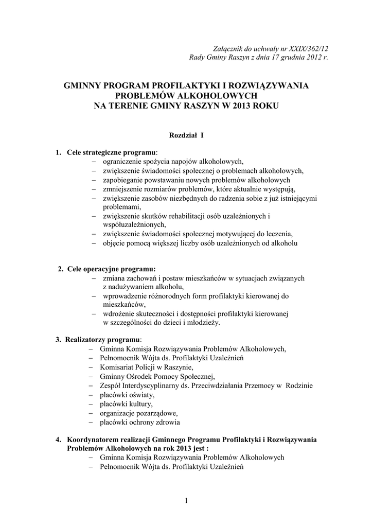 Załącznik do uchwały nr XXIX/362/12 Rady Gminy Raszyn z dnia 17 grudnia 2012 r. GMINNY PROGRAM PROFILAKTYKI I ROZWIĄZYWANIA PROBLEMÓW ALKOHOLOWYCH NA TERENIE GMINY RASZYN W 2013 ROKU Rozdział I 1. Cele strategiczne programu: ograniczenie spożycia napojów alkoholowych, zwiększenie świadomości społecznej o problemach alkoholowych, zapobieganie powstawaniu nowych problemów alkoholowych zmniejszenie rozmiarów problemów, które aktualnie występują, zwiększenie zasobów niezbędnych do radzenia sobie z już istniejącymi problemami, zwiększenie skutków rehabilitacji osób uzależnionych i współuzależnionych, zwiększenie świadomości społecznej motywującej do leczenia, objęcie pomocą większej liczby osób uzależnionych od alkoholu 2. Cele operacyjne programu: zmiana zachowań i postaw mieszkańców w sytuacjach związanych z nadużywaniem alkoholu, wprowadzenie różnorodnych form profilaktyki kierowanej do mieszkańców, wdrożenie skuteczności i dostępności profilaktyki kierowanej w szczególności do dzieci i młodzieży. 3. Realizatorzy programu: Gminna Komisja Rozwiązywania Problemów Alkoholowych, Pełnomocnik Wójta ds. Profilaktyki Uzależnień Komisariat Policji w Raszynie, Gminny Ośrodek Pomocy Społecznej, Zespół Interdyscyplinarny ds. Przeciwdziałania Przemocy w Rodzinie placówki oświaty, placówki kultury, organizacje pozarządowe, placówki ochrony zdrowia 4. Koordynatorem realizacji Gminnego Programu Profilaktyki i Rozwiązywania Problemów Alkoholowych na rok 2013 jest : Gminna Komisja Rozwiązywania Problemów Alkoholowych Pełnomocnik Wójta ds. Profilaktyki Uzależnień 1 Rozdział II Zadania Gminnego Programu Profilaktyki i Rozwiązywania Problemów Alkoholowych. 1. Zwiększenie dostępności pomocy terapeutycznej i rehabilitacyjnej dla osób uzależnionych od alkoholu, współuzależnionych oraz dorosłych dzieci alkoholików: finansowanie działalności Punktu Konsultacyjnego w Jaworowej (motywowanie do podjęcia psychoterapii w placówkach leczenia uzależnienia, informacje o możliwościach pomocy w zakresie rozwiązywania problemów alkoholowych, utrzymanie, wynagrodzenia pracowników), konsultacje dla osób uzależnionych i współuzależnionych z zakresu psychoterapii uzależnień, stała współpraca z Wojewódzkim Ośrodkiem Terapii Uzależnienia od Alkoholu i Współuzależnienia w tym dofinansowanie programów rehabilitacji dla osób uzależnionych po zakończonych programach psychoterapii uzależnienia, stała współpraca z Przychodnią Leczenia Uzależnień w Pruszkowie w tym zlecanie sporządzania opinii biegłych o uzależnieniu. finansowanie kosztów sądowych w związku z procedurą zobowiązania do leczenia, wsparcie psychologiczne i pedagogiczne członków rodzin z problemem alkoholowym, 2. Udzielanie rodzinom, w których występują problemy alkoholowe oraz ofiarom przemocy w rodzinie, pomocy psychospołecznej i prawnej. współpraca z Gminnym Ośrodkiem Pomocy Społecznej w zakresie monitorowania przez pracowników socjalnych rodzin objętych działaniami socjalnymi, w których występują problemy alkoholowe, współpraca z Gminną Komisją Rozwiązywania Problemów Alkoholowych w zakresie podejmowania procedury zobowiązania do leczenia, współpraca z Zespołem Interdyscyplinarnym ds. Przeciwdziałania Przemocy w Rodzinie, współpraca z Policją w zakresie monitorowania i dokumentowania spraw związanych z nadużywaniem alkoholu między innym w zakresie podejmowania procedury zobowiązania do leczenia, dofinansowanie pracy terapeutycznej z rodziną, porady prawne w zakresie prawa rodzinnego, podejmowanie działań o charakterze edukacyjnym przeznaczonych dla rodziców, współpraca z placówkami prowadzącymi zajęcia wychowawcze, sportowe i kulturalne, realizacja programu profilaktycznego promującego zdrowy styl życia w okresie wakacji i ferii zimowych w formie stacjonarnej i wyjazdowej dzieci i młodzieży z terenu Gminy Raszyn. 3. Przeciwdziałanie wczesnej inicjacji alkoholowej wśród młodzieży, kreowanie alternatywnych form spędzania wolnego czasu przez dzieci i młodzież oraz promowanie zdrowego trybu życia. prowadzenie różnorodnych, atrakcyjnych i uwzględniających stopień zagrożenia programów profilaktycznych adresowanych do dzieci i młodzieży, 2 realizowanie i monitorowanie zajęć i programów profilaktycznych w przedszkolach, szkołach podstawowych i gimnazjum, kontrola sprzedaży i spożywania alkoholu, w szczególności realizowanie przez sprzedawców założeń Ustawy o wychowaniu w trzeźwości i przeciwdziałaniu alkoholizmowi, promowanie różnych form aktywności dzieci i młodzieży poprzez finansowanie zajęć pozalekcyjnych, warsztatów, konkursów i innych, zagospodarowanie czasu wolnego dzieci i młodzieży poprzez finansowanie zajęć sportowych, dofinansowanie wycieczek organizowanych przez szkoły, kluby, sołectwa i organizacje pozarządowe, podejmowanie działań wspomagających wolontariat i bezinteresowne służenie osobom potrzebującym, eliminacja zjawiska spożywania alkoholu w miejscach zabronionych, szczególnie placach, parku, ulicach przy wykorzystaniu patroli prewencyjnych pełnionych w czasie ponadnormatywnym oraz systemu monitoringu gminnego. doposażenie placówek prowadzących zajęcia z dziećmi i młodzieżą, a w szczególności zajęcia z zakresu profilaktyki. 4. Wspomaganie działalności instytucji, organizacji pozarządowych i osób fizycznych, służącej rozwiązywaniu problemów alkoholowych, tworzenie rozszerzonych form terapii oraz zapobiegania nawrotom choroby poprzez grupy wsparcia, upowszechnianie standardów interdyscyplinarnej pracy na rzecz przeciwdziałania przemocy w rodzinie, doskonalenie metod interwencji podnoszenie kompetencji w zakresie przeciwdziałania przemocy w rodzinie także w ramach procedury „Niebieskie Karty”, dofinansowanie wycieczek profilaktycznych organizowanych przez szkoły i kluby, sołectwa i organizacje po