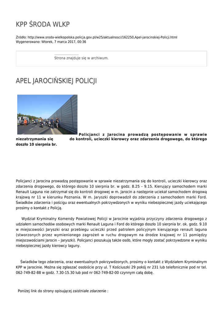 KPP ŚRODA WLKP Źródło: http://www.sroda-wielkopolska.policja.gov.pl/w25/aktualnosci/162250,Apel-jarocinskiej-Policji.html Wygenerowano: Wtorek, 7 marca 2017, 00:36 Strona znajduje się w archiwum. APEL JAROCIŃSKIEJ POLICJI niezatrzymania się doszło 10 sierpnia br. Policjanci z Jarocina prowadzą postępowanie w sprawie do kontroli, ucieczki kierowcy oraz zdarzenia drogowego, do którego Policjanci z Jarocina prowadzą postępowanie w sprawie niezatrzymania się do kontroli, ucieczki kierowcy oraz zdarzenia drogowego, do którego doszło 10 sierpnia br. w godz. 8.25 – 9.15. Kierujący samochodem marki Renault Laguna nie zatrzymał się do kontroli drogowej w m. Jarocin a następnie uciekał samochodem drogową krajową nr 11 w kierunku Poznania. W m. Jaryszki doprowadził do zderzenia z samochodem marki Ford. Świadków zdarzenia i pościgu oraz ewentualnych pokrzywdzonych w wyniku niebezpiecznej jazdy uciekającego prosimy o kontakt z Policją. Wydział Kryminalny Komendy Powiatowej Policji w Jarocinie wyjaśnia przyczyny zdarzenia drogowego z udziałem samochodów osobowych marki Renault Laguna i Ford do którego doszło 10 sierpnia br. ok. godz. 9.10 w miejscowości Jaryszki oraz przebiegu ucieczki przed patrolem policyjnym kierującego renault laguna (stworzonych przez wymienionego zagrożeń w ruchu drogowym na drodze krajowej nr 11 pomiędzy miejscowościami Jarocin – Jaryszki). Policjanci poszukują także osób, które mogły zostać pokrzywdzone w wyniku niebezpiecznej jazdy kierowcy laguny. Świadków tego zdarzenia, oraz ewentualnych pokrzywdzonych, prosimy o kontakt z Wydziałem Kryminalnym KPP w Jarocinie. Można się zgłaszać osobiście przy ul. T Kościuszki 29 pokój nr 231 lub telefonicznie pod nr tel. 062-749-82-88 w godz. 7.30-15.30 lub pod nr 062-749-82-00 czynnym całą dobę. Poniżej link do strony opisującej zaistniałe zdarzenie : http://www.jarocin.policja.gov.pl//index.php?option=com_content&task=view&id=1932&Itemid=31 Ocena: 0/5 (0) Tweetnij