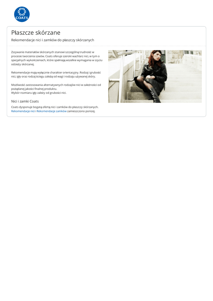 Płaszcze skórzane Rekomendacje nici i zamków do płaszczy skórzanych Zszywanie materiałów skórzanych stanowi szczególną trudność w procesie tworzenia szwów. Coats oferuje szeroki wachlarz nici, w tym o specjalnych wykończeniach, które spełniają wszelkie wymagania w szyciu odzieży skórzanej. Rekomendacje mają wyłącznie charakter orientacyjny. Rodzaj i grubość nici, igły oraz rodzaj ściegu zależą od wagi i rodzaju używanej skóry. Możliwość zastosowania alternatywnych rodzajów nici w zależności od pożądanej jakości finalnej produktu. Wybór rozmiaru igły zależy od grubości nici. Nici i zamki Coats Coats dysponuje bogatą ofertą nici i zamków do płaszczy skórzanych. Rekomendacje nici i Rekomendacje zamków zamieszczono ponizej. Numer ściegu Rodzaj ściegu Produkt 1 301 Ścieg stębnowy dwunitkowy (301) Terko Satin Więcej 2 304-3 Uszycie dziurki (304(3) Terko Satin Więcej 3 304-2 Przyszycie guzika z nóżką Terko Satin Więcej Premium Wykończenie typu Glacé Nici przemysłowe Coats dostępne są w szerokiej gamie rodzajów włókien i wykończeń, z których każdy opracowany jest pod kątem konkretnych potrzeb naszych klientów. Zapraszamy do zapoznania się z naszą bogatą ofertą poniżej. W przypadku dostępności innych opcji, proszę wybrać odpowiednią opcję z listy. Wygląd szwu Rodzaj ściegu Numer ściegu Gęstość ściegu (na 3cm) Górna nitka Grubość igły Nm Dolna nitka Produkt Tex Tkt Produkt Tex Tkt 1 Ścieg stębnowy dwunitkowy (301) 301 12 - 14 Terko Satin 40 75 Terko Satin 40 75 90 - 100 2 Uszycie dziurki (304(3) 304-3 - Terko Satin 60 50 Terko Satin 60 50 100 - 110 3 Przyszycie guzika z nóżką 304-2 - Terko Satin 60 50 Terko Satin 60 50 100 - 110 Key: Nierozdzielczy = Nierozdzielczy; Rozdzielczy = Rozdzielczy; Dwustronnie rozdzielczy = Dwustronnie rozdzielczy; Dwustronnie nierozdzielczy = Dwustronnie nierozdzielczy; X-Forma / O-Forma Opti S Zastosowanie Kołnierz odpinany Zapięcie z przodu Przypinany kaptur Odpinana podszewka Kieszenie Rękawy Opti LUX Opcje specjalne S60 OE - S40 OE S80 OE Opti M Opcje specjalne - - - - - LUX4 OE S80 2W - S60 2W Opti P Opcje specjalne - - - - - M80 2W LUX6 2W - Reversed, Odblaskowy, Contrast LUX6 OE S60 OE Reversed, Odblaskowy, Contrast S40 OE S60 OE Opcje specjalne - - - - - - P60 2W - M80 OE - P60 OE - - M60 OE - P40 OE - LUX4 2W - M60 2W - P80 2W - - - - - - P40 OE - - - - - - P60 OE - S40 OE - - - - - - - S60 OE - - - - - - - S40 CE Reversed LUX8 CE - M40 CE - P40 CE - S60 CE Reversed LUX4 CE - M60 CE - P60 CE - - - LUX6 CE - M80 CE - - - S60 CE Reversed LUX4 CE - M60 CE - - - - - LUX6 CE - M40 CE - - - - - LUX8 CE - M80 CE - - - Suwaki Możemy wykonać indywidualną przywieszkę z logo twojej firmy. Arch Werra Wavy Venezia Tortile Torso Spree Ring Regus Rectangle Petal Perle Nahe Mosel Mandolin Lush Long Drop Lech Fulda Fishbone Avenue Opcje specjalne Informacje dodatkowe Rekomendacje nici do szycia zamieszczone powyżej pełnią funkcję pomocniczą w produkcji odzieży o wysokiej jakości szwach. Ponieważ elementy tego samego rodzaju mogą różnić się surowcem, konstrukcją, oraz metodami produkcji i postprodukcji, rekomendacje te należy traktować jako wstępne wskazówki w wyborze nici. Szczegółowe rekomendacje w wyborze nici i igieł, precyzyjny szacunek zużycia nici oraz wsparcie techniczne można uzyskać kontaktując się z lokalnym oddziałem Coats. Niniejsze zalecenia i dane na temat zużycia stanowią jedynie wskazówki i udzielone są w dobrej wierze, lecz bez gwarancji lub odpowiedzialności ze strony firmy lub jej pracowników.