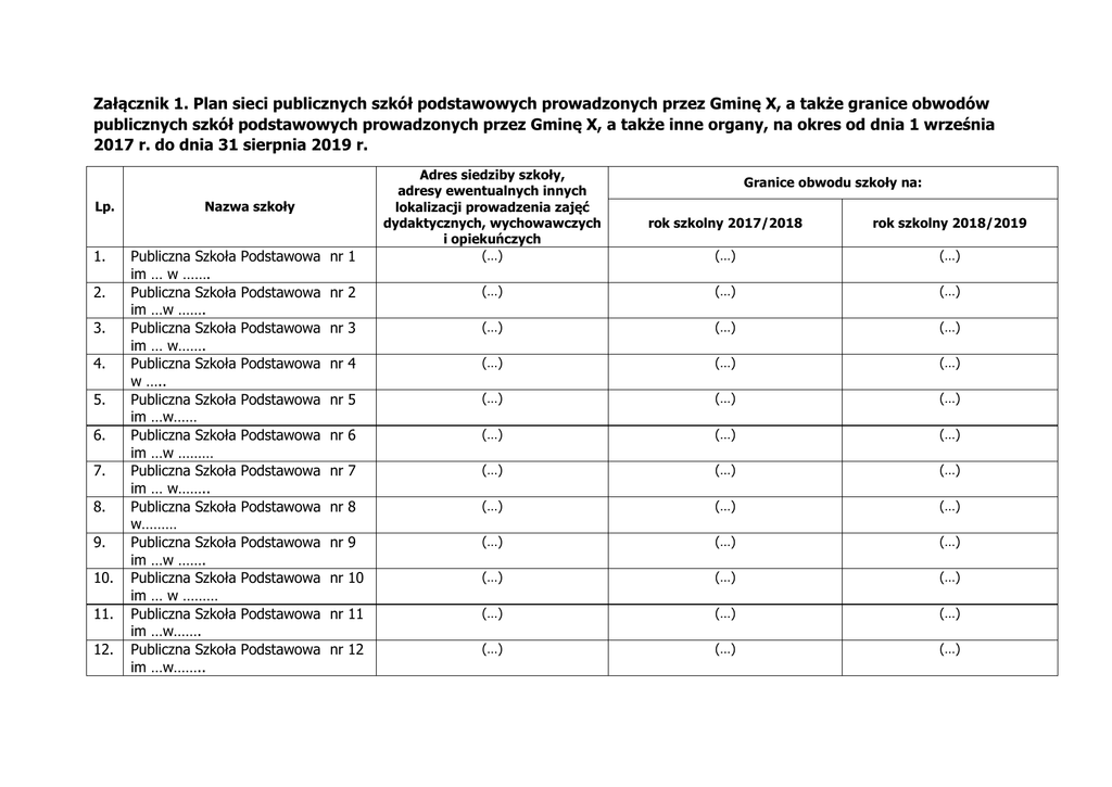 Załącznik 1. Plan sieci publicznych szkół podstawowych prowadzonych przez Gminę X, a także granice obwodów publicznych szkół podstawowych prowadzonych przez Gminę X, a także inne organy, na okres od dnia 1 września 2017 r. do dnia 31 sierpnia 2019 r. Lp. 1. 2. 3. 4. 5. 6. 7. 8. 9. 10. 11. 12. Podstawowa nr 1 Adres siedziby szkoły, adresy ewentualnych innych lokalizacji prowadzenia zajęć dydaktycznych, wychowawczych i opiekuńczych (…) Podstawowa nr 2 (…) (…) (…) Podstawowa nr 3 (…) (…) (…) Podstawowa nr 4 (…) (…) (…) Podstawowa nr 5 (…) (…) (…) Podstawowa nr 6 (…) (…) (…) Podstawowa nr 7 (…) (…) (…) Podstawowa nr 8 (…) (…) (…) Podstawowa nr 9 (…) (…) (…) Podstawowa nr 10 (…) (…) (…) Podstawowa nr 11 (…) (…) (…) Podstawowa nr 12 (…) (…) (…) Nazwa szkoły Publiczna Szkoła im … w ……. Publiczna Szkoła im …w ……. Publiczna Szkoła im … w……. Publiczna Szkoła w ….. Publiczna Szkoła im …w…… Publiczna Szkoła im …w ……… Publiczna Szkoła im … w…….. Publiczna Szkoła w……… Publiczna Szkoła im …w ……. Publiczna Szkoła im … w ……… Publiczna Szkoła im …w……. Publiczna Szkoła im …w…….. Granice obwodu szkoły na: rok szkolny 2017/2018 rok szkolny 2018/2019 (…) (…) Lp. 13. 14. 15. 16. 17. 19. 20. nr 13 Adres siedziby szkoły, adresy ewentualnych innych (…) (…) (…) nr 14 (…) (…) (…) nr 15 (…) (…) (…) nr 16 …… nr 17 (…) (…) (…) (…) (…) Publiczna Szkoła Podstawowa nr 19 w ……. Publiczna Szkoła Podstawowa im. Tadeusza Kościuszki prowadzona przez Stowarzyszenie „Przyjaciół Szkoły” (…) Nie dotyczy Szkoła rozpocznie działalność od 1 września 2018 r. (…) (…) (…) (…) Nazwa szkoły Publiczna Szkoła Podstawowa w ……. Publiczna Szkoła Podstawowa im … Publiczna Szkoła Podstawowa im ……w …. Publiczna Szkoła Podstawowa z oddziałami integracyjnymi w Publiczna Szkoła Podstawowa w ….. Granice obwodu szkoły na: (…)