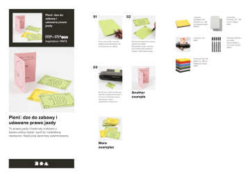 Pieniądze do zabawy i udawane prawo jazdy 01 Inspiration: 14073 02 Przy użyciu linijki i ołówka podziel kawałek kartonu A4 na 8 równych pól. Wytnij. Na każdym banknocie narysuj identyczną grafikę. Wskazówka: zmień ew.kolor jeśli chcesz zróżnicowania wartości banknotów w grze. Coloured Cardboard, A4 210x297 mm, 180 g, 120asstd sheets 214270 Laminating Pouches, A7 , 125 micron, 100pcs 11516 Laminator, 1 pc 11507 Permanent Marker, line width: 2x0,6+2x0,8+1,3 mm, black, 5asstd 25010 Coloured Card, A4 21x30 cm, 180 cm, 1200asstd sheets 21427 03 W związku z tym,że banknoty (również w grze) przechodzą z rąk do rąk, laminuje sie je w laminatorze, celem usztywnienia i trwałości. Pieniądze do zabawy i udawane prawo jazdy To prawo jazdy i banknoty zrobiono z kartonu,który został wycięty i ozdobiony markerem. Następnie banknoty zalaminowano. More examples Another example