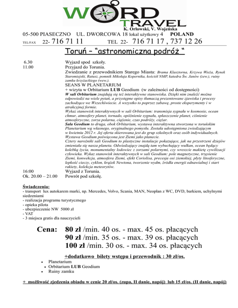 05-500 PIASECZNO TEL/FAX 22- 716 71 K. Orłowski, V. Wojeńska UL. DWORCOWA 18 lokal użytkowy 4 POLAND 11 TEL 22- 716 71 17 , 737 12 26 Toruń – “astronomiczna podróż “ 6.30 11.00 Wyjazd spod szkoły. Przyjazd do Torunia. Zwiedzanie z przewodnikiem Starego Miasta: Brama Klasztorna, Krzywa Wieża, Rynek Staromiejski, Ratusz, pomnik Mikołaja Kopernika, kościół NMP, katedra Św. Janów (zew.), ruiny zamku krzyżackiego (wew.). SEANS W PLANETARIUM + wizyta w Orbitarium LUB Geodium (w zależności od dostępności) W sali Orbitarium znajdują się też interaktywne stanowiska. Dzięki nim znaleźć można odpowiedzi na wiele pytań, a przystępne opisy tłumaczą prezentowane zjawiska i procesy zachodzące we Wszechświecie. A wszystko to poprzez zabawę, proste eksperymenty i w atrakcyjnej formie. Wykaz stanowisk interaktywnych w sali Orbitarium: transmisja sygnału w kosmosie, ocean chmur, atmosfery planet, tornado, opóźnienie sygnału, spłaszczenie planet, ciśnienie atmosferyczne, zorza polarna, ciążenie, czas podróży, ciężar. Sala Geodium to druga, obok Orbitarium, wystawa interaktywna stworzona w toruńskim Planetarium wg własnego, oryginalnego pomysłu. Została udostępniona zwiedzającym w kwietniu 2012 r. Jej oferta skierowana jest do grup szkolnych oraz osób indywidualnych. Wystawa Geodium poświęcona jest Ziemi jako planecie. Cztery narożniki sali Geodium to plastyczne instalacje pokazujące, jak na przestrzeni dziejów zmieniała się nasza planeta. Odwiedzający znajdą tam wybuchający wulkan, ocean będący kolebką życia, monumentalny lodowiec z zorzami polarnymi, czy wreszcie makietę cywilizacji człowieka. Wykaz stanowisk interaktywnych w sali Geodium: pole magnetyczne, trzęsienie Ziemi, konwekcja, atmosfera Ziemi, efekt Coriolisa, precesja osi ziemskiej, płyty litosferyczne, lepkość cieczy, cyklon, krążek Newtona, tworzenie wydm, źródła energii odnawialnej i start rakiety, kolekcja meteorytów. 16:00 Ok. 20.00 – 21.00 Wyjazd z Torunia. Powrót pod szkołę. Świadczenia: - transport lux autokarem marki, np. Mercedes, Volvo, Scania, MAN, Neoplan z WC, DVD, barkiem, uchylnymi siedzeniami - realizacja programu turystycznego - opieka pilota - ubezpieczenie NW 5000 zł - VAT - 3 miejsca gratis dla nauczycieli Cena: 80 zł /min. 40 os. - max. 45 os. płacących 90 zł /min. 35 os. - max. 39 os. płacących 100 zł /min. 30 os. - max. 34 os. płacących +dodatkowo bilety wstępu i przewodnik : 30 zł/os. Planetarium Orbitarium LUB Geodium Ruiny zamku + możliwość zjedzenia obiadu w cenie 20 zł/os. (zupa, II danie, napój) lub 15 zł/os. (II danie, napój) Standardowy rozmiar naszych autokarów to 49 miejsc (do dyspozycji grupy wraz z opiekunami). Na Państwa życzenie możemy zarezerwować autokary 57-70 miejsc (w tym przypadku prosimy o kontakt z biurem w celu sprawdzenia kalkulacji na ponadstandardowy pojazd i jego dostępności w wybranym przez Państwa terminie). W celu podpisania umowy i rezerwacji konkretnego terminu prosimy o telefon do biura 022 716 71 11 lub 022 716 71 17 lub mail [email protected] Zaliczka konieczna do podpisania umowy 50zł/os. Ze względu na szczyt sezonu wycieczek szkolnych w miesiącach maj-czerwiec sugerujemy dokonanie rez. wstępnej na czas zebrania zaliczek! KWOTĘ NA BILETY WSTĘPU POTWIERDZAMY PRZED DOPŁATĄ ZGODNIE Z OBOWIĄZUJĄCYMI CENNIKAMI. Wyciąg z warunków uczestnictwa imprez turystycznych organizowanych przez B.P. Word Travel (pełna wersja warunków uczestnictwa dostępna jest u nauczyciela organizującego wycieczkę) : 13. W przypadku rezygnacji lub nie uczestniczenia Uczestnika w wykupionej imprezie Organizator uprawniony jest do potrącenia RZECZYWIŚCIE PONIESIONYCH KOSZTÓW. 14. Zmiana uczestnika nie pociąga za sobą kosztów finansowych. 18. Uczestnik odpowiada za wszelkie szkody materialne wyrządzone w trakcie trwania imprezy (zniszczenia w hotelu, autokarze) 15. Jeżeli w programie jest wyjazd poza granicę Polski - uczestnik winien posiadać na miejscu zbiórki aktualnie obowiązujące dokumenty uprawniające do przekroczenia granic krajów objętych programem imprezy (wyłącznie dowód osobisty lub paszport ważny min. 6 m-cy od daty powrotu). 9 B. W przypadku chorób uznawanych za przewlekłe uczestnik winien na własny koszt wykupić dodatkowe ubezpieczenie ! ( dotyczy wycieczek zagranicznych) Klient przez dokonanie wpłaty (całkowitej lub częściowej) akceptuje program wycieczki i warunki uczestnictwa.